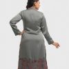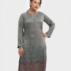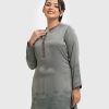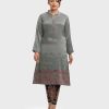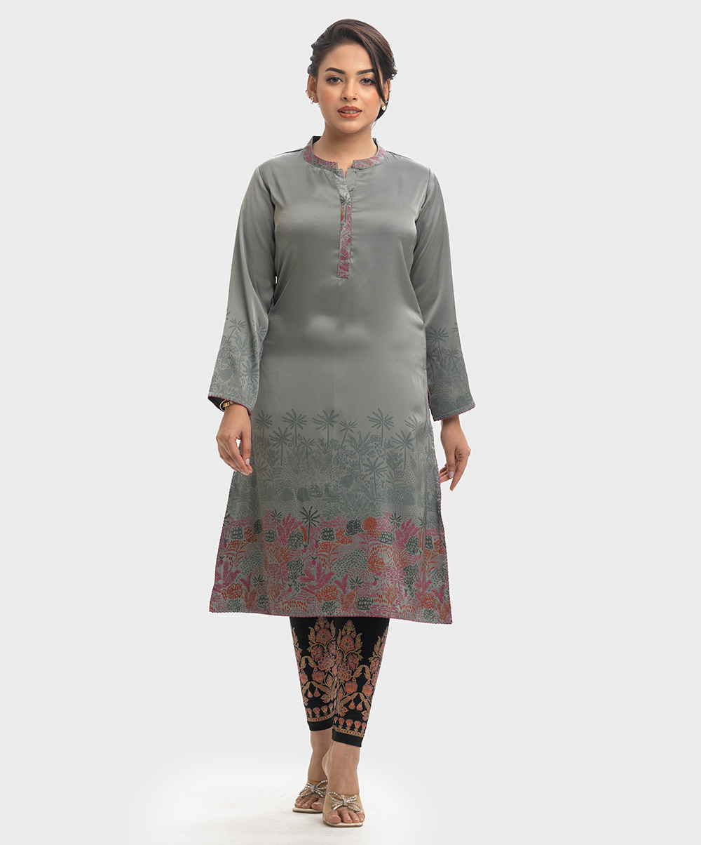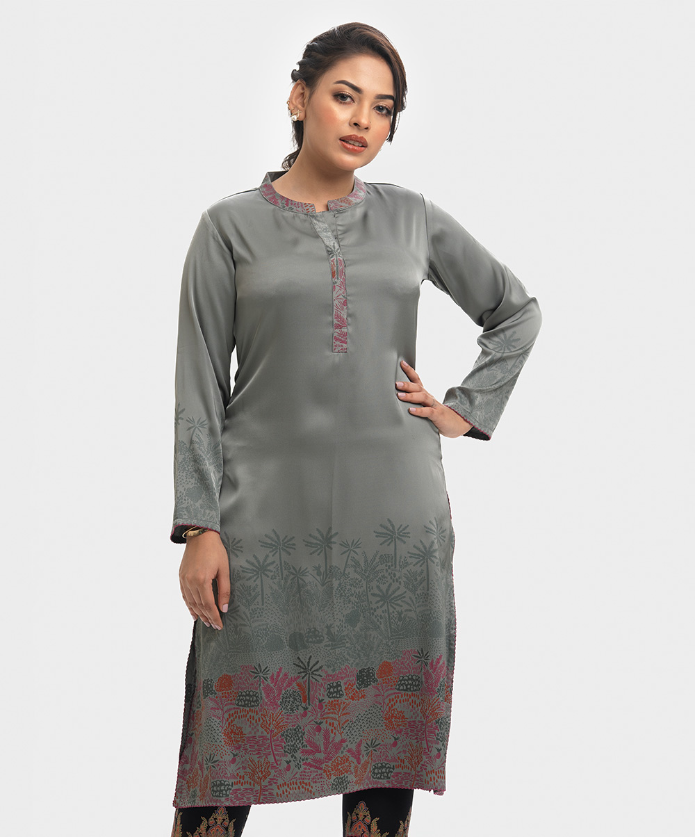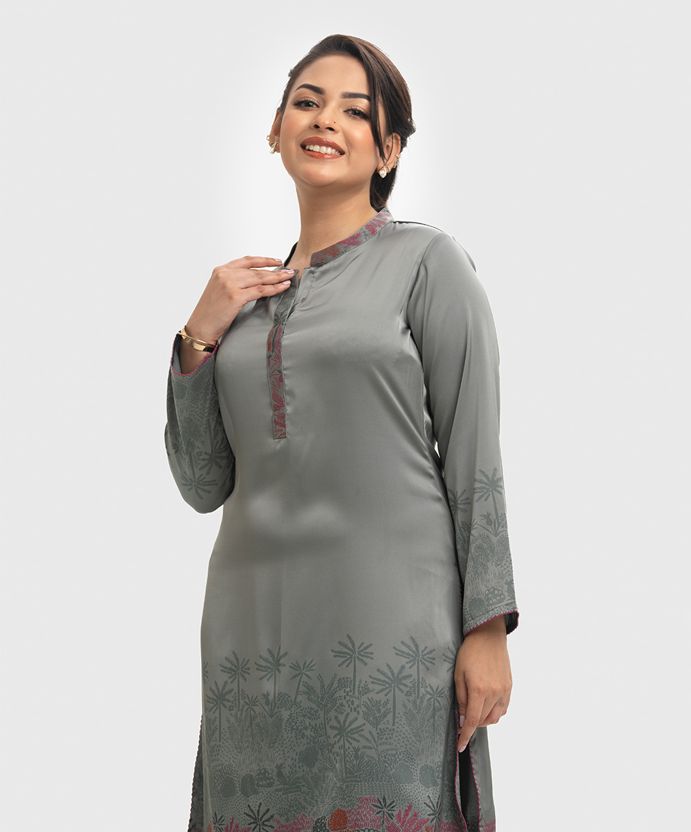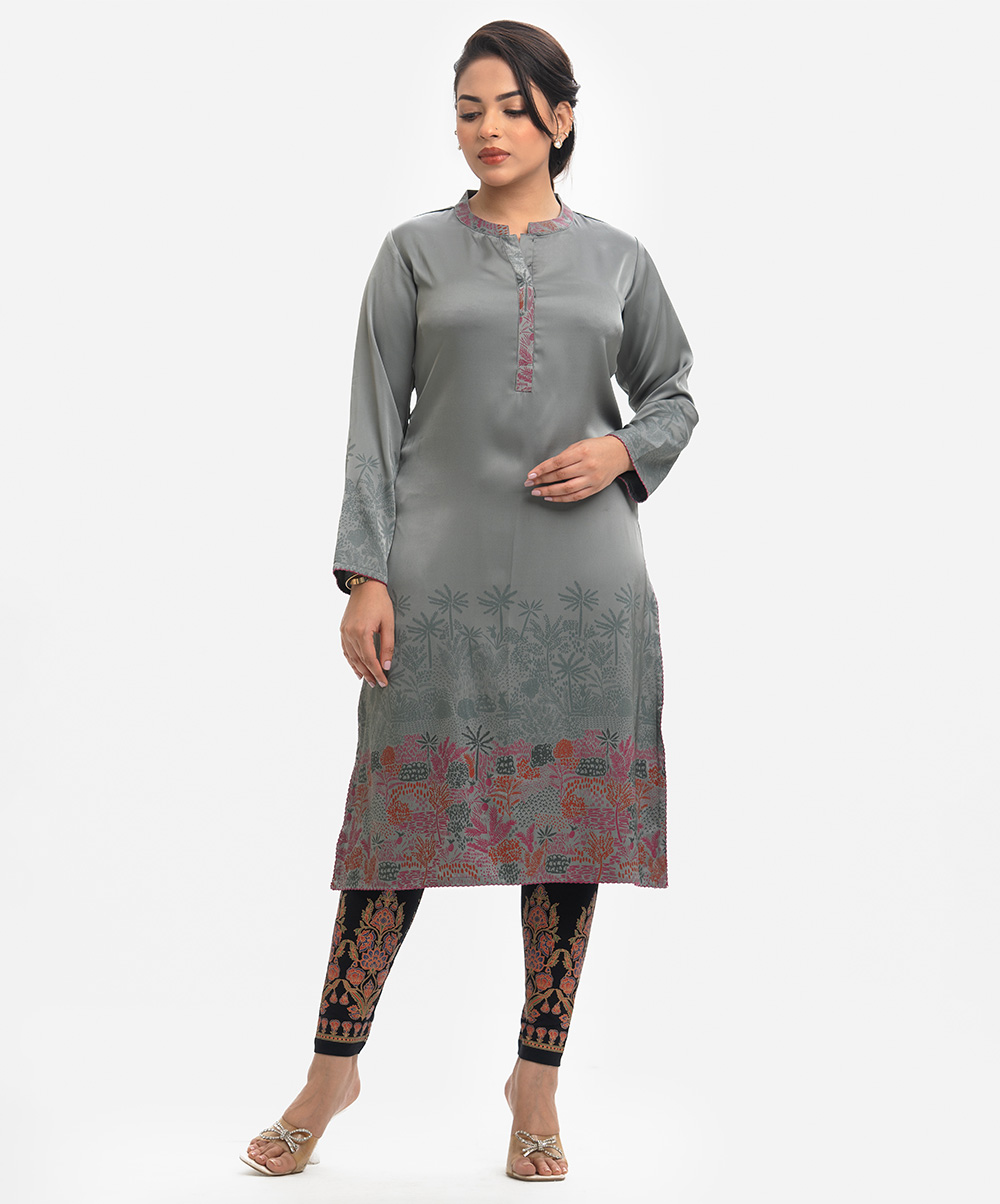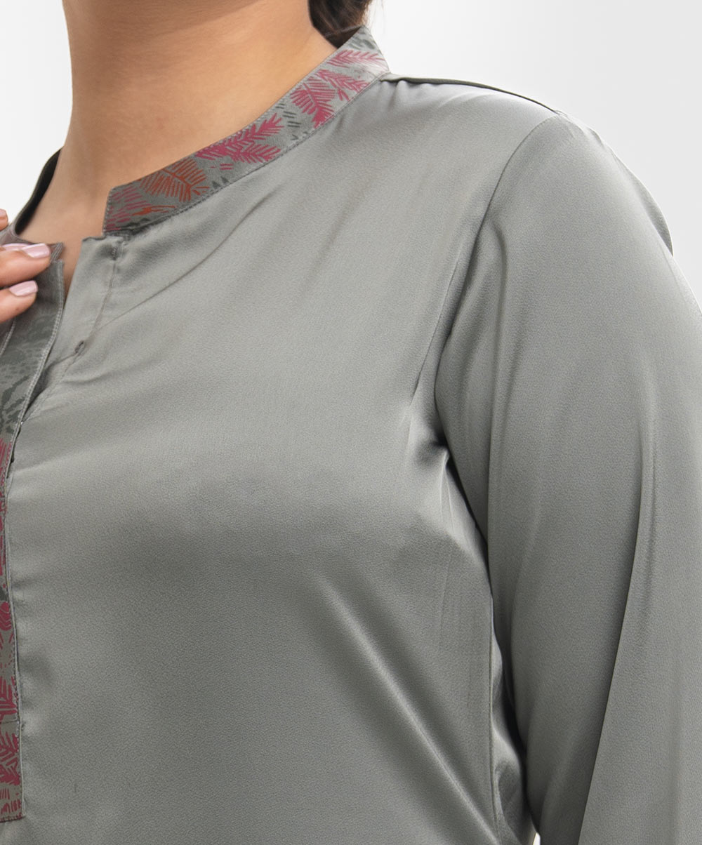 Band collar A-line kameez in satin-georgette fabric. Full sleeves.