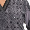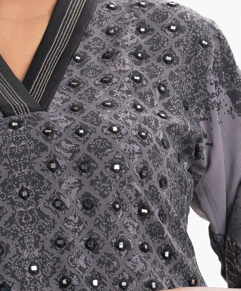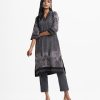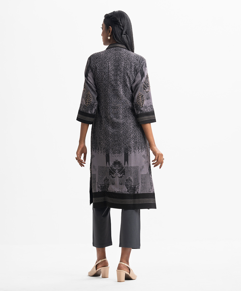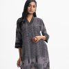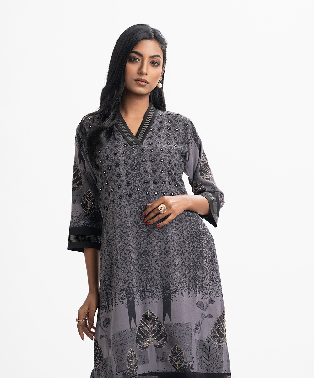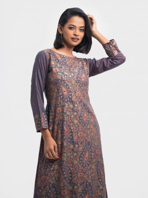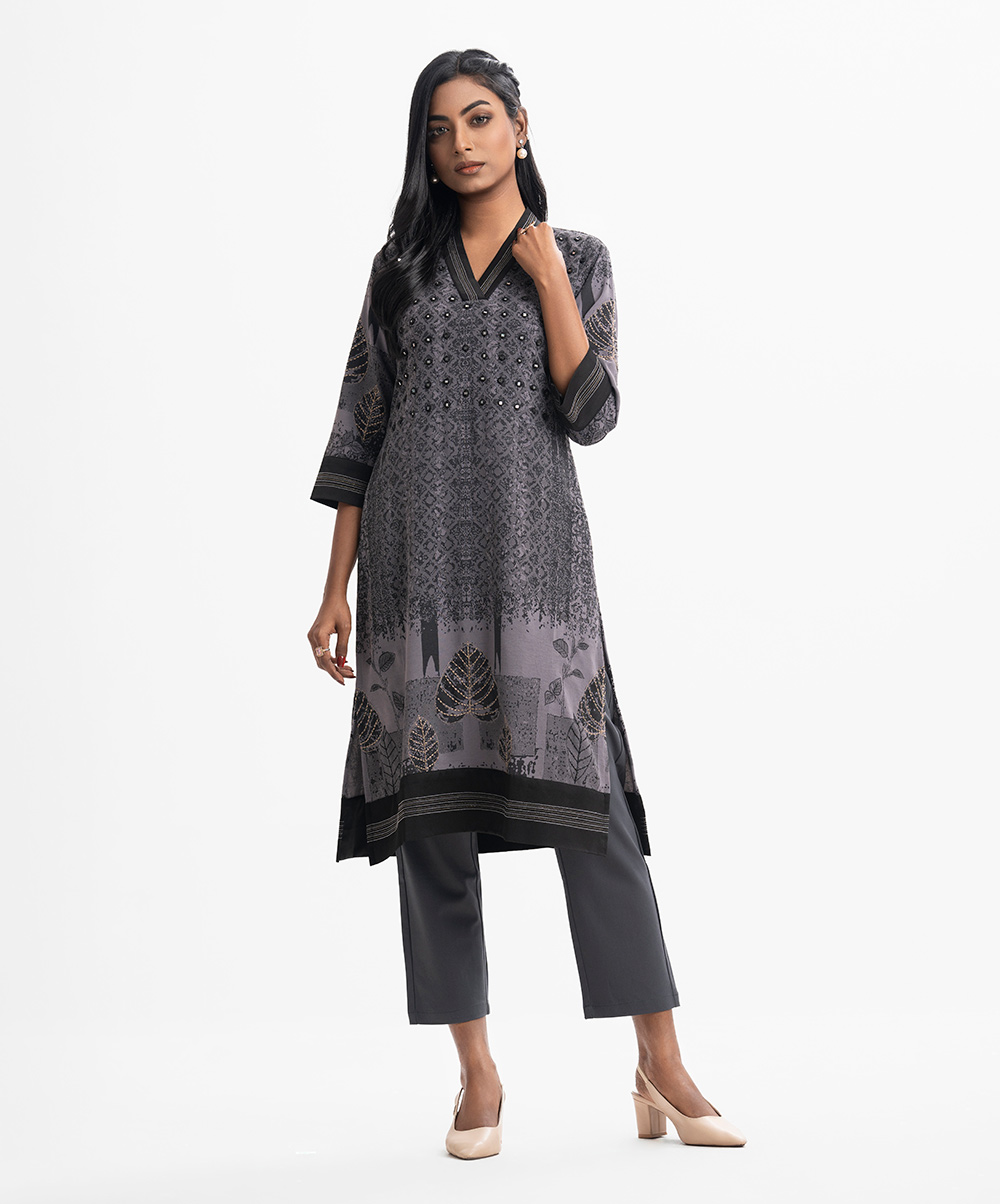 Kimono-neck A-line kameez in blended gergette fabric. Matching patch on the collar and cuffs. Embroidery at the front.