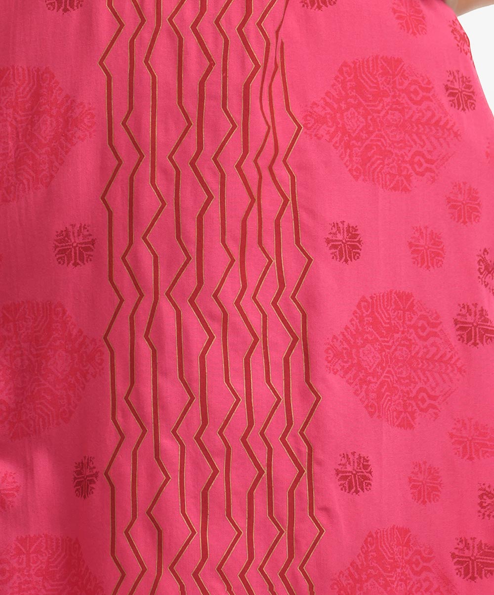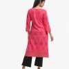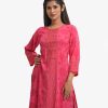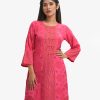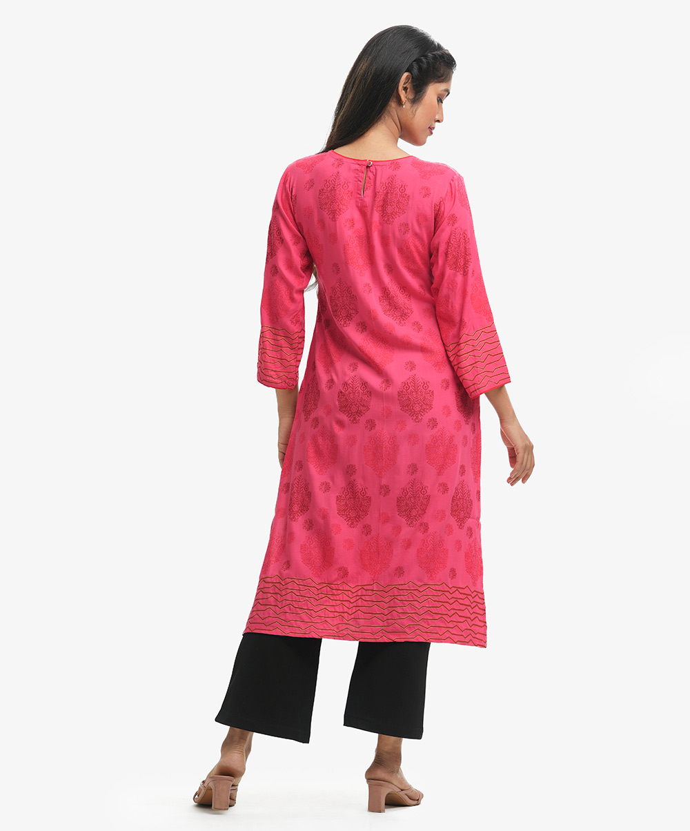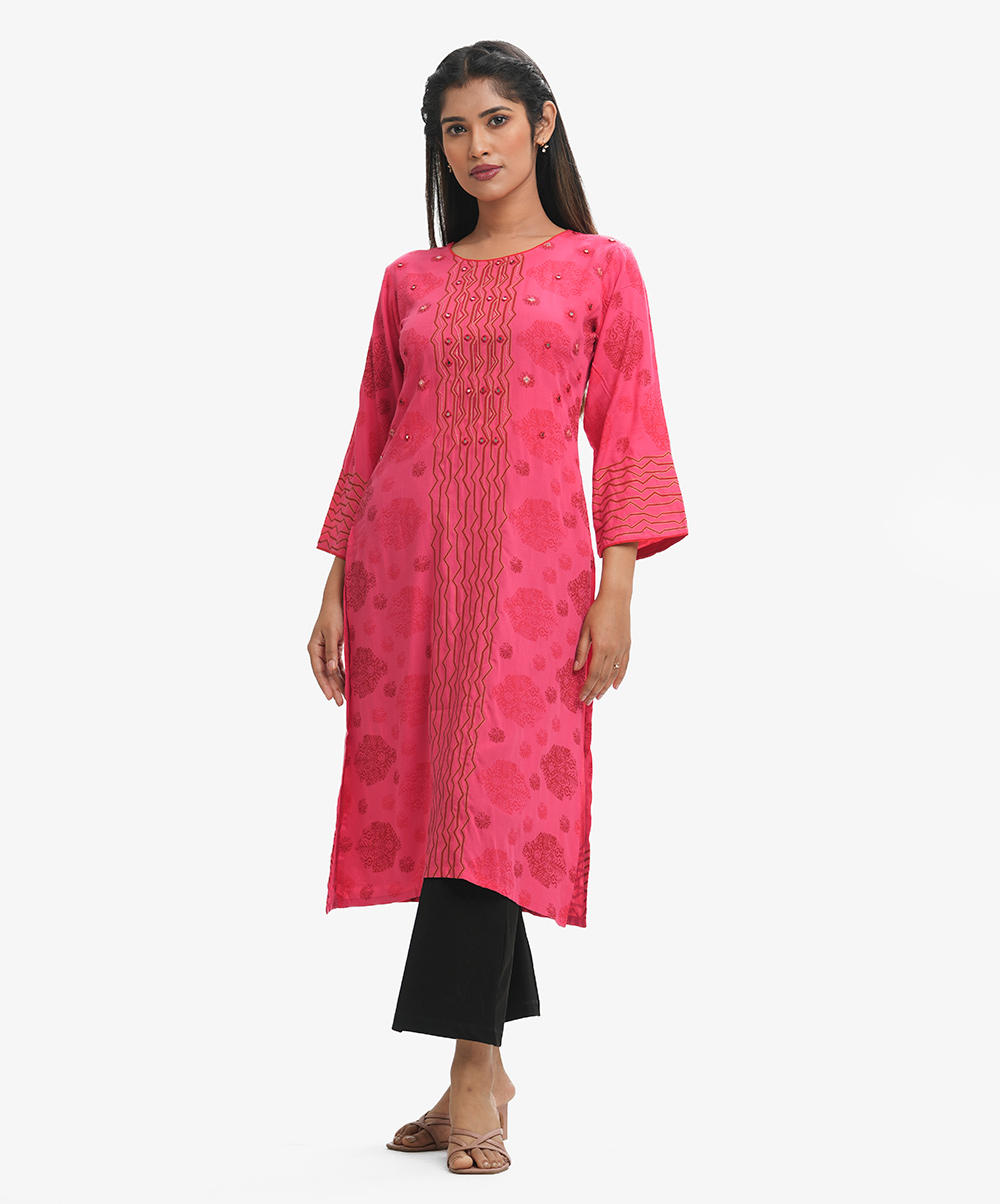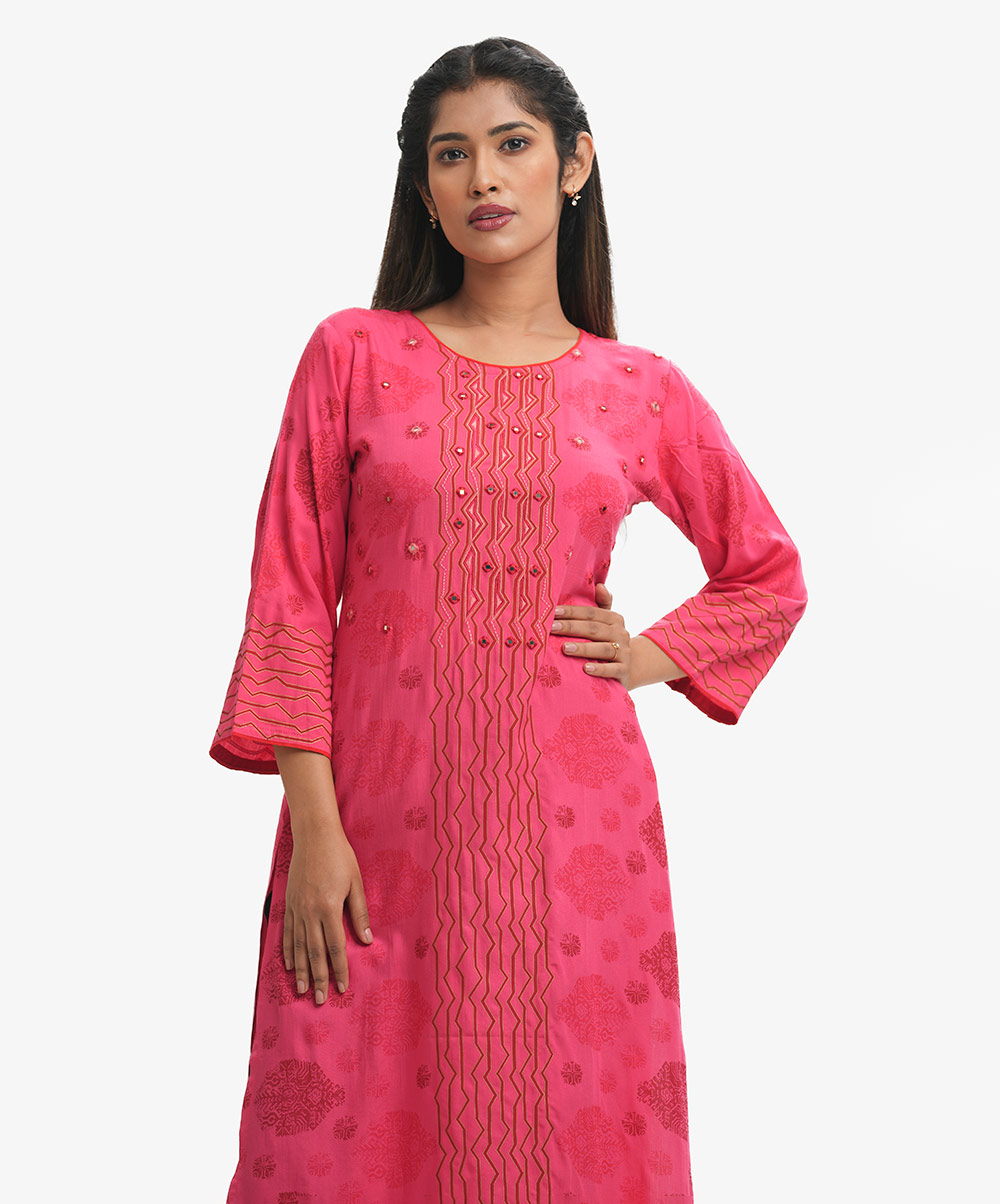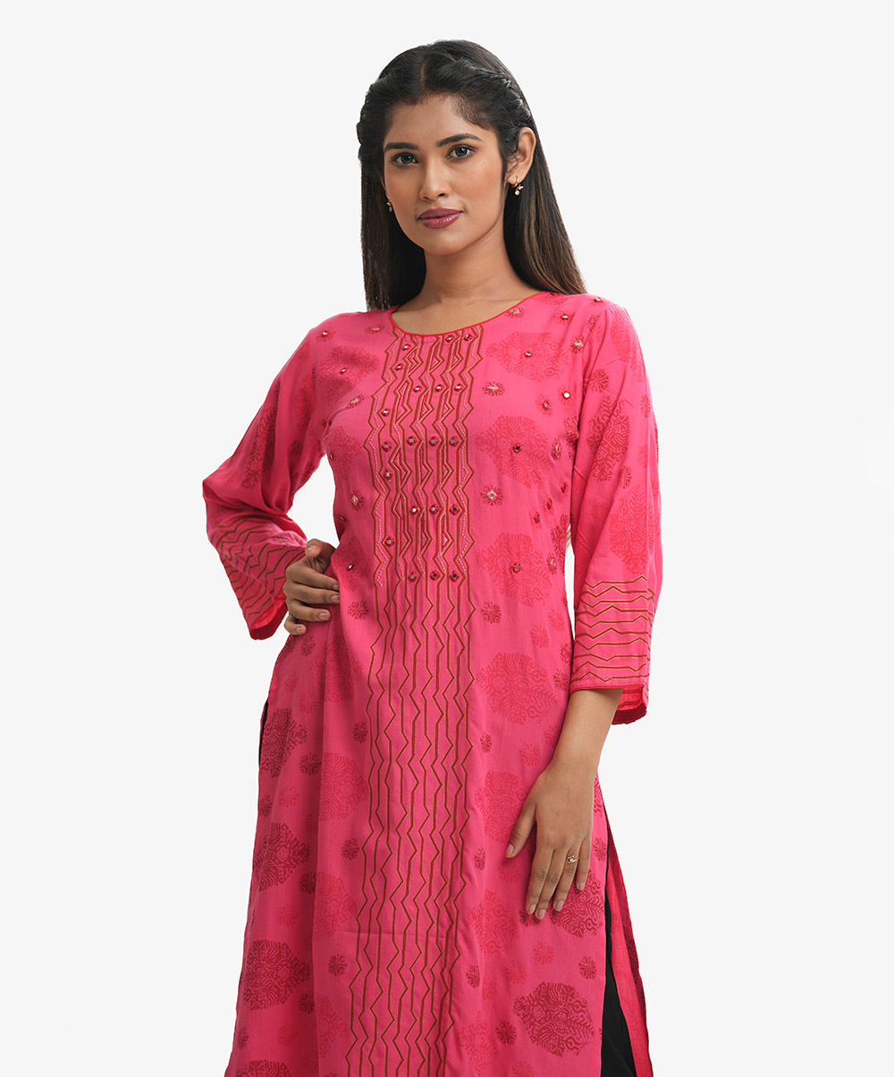 Round neck straight kameez in viscose fabric. Three-quarter sleeves with embroidery at the front.