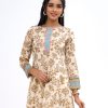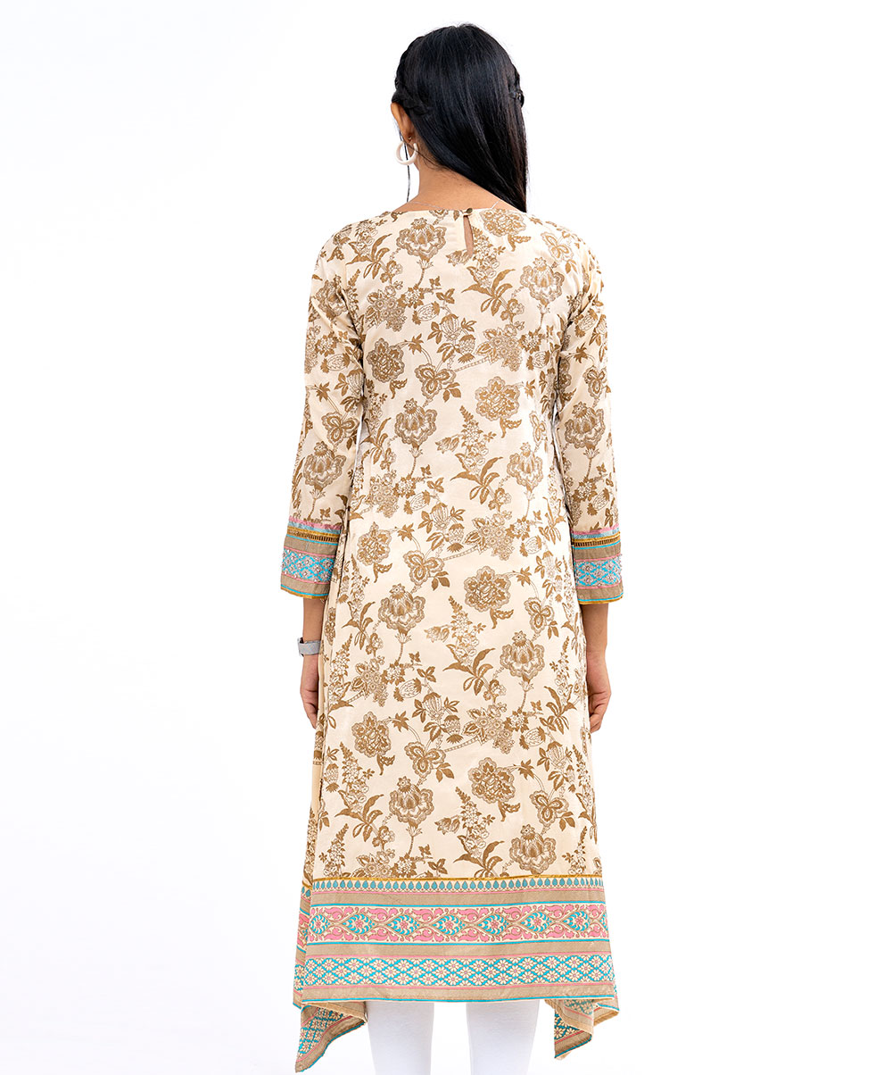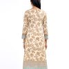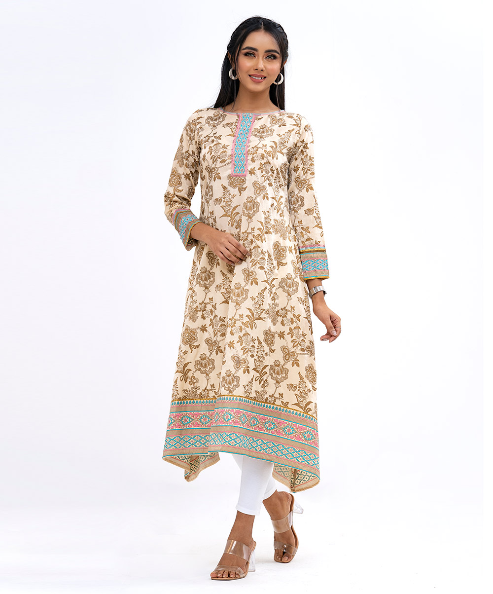 Single kameez, long length, full sleeve, white color, swiss velvet fabric, boat neck, A-line, handwork on top front, sleeve and hem. Allover metallic color print.