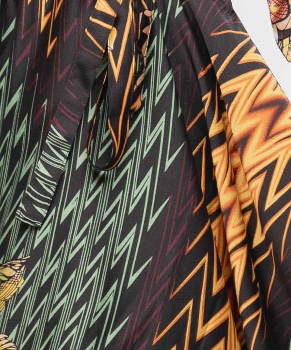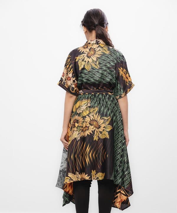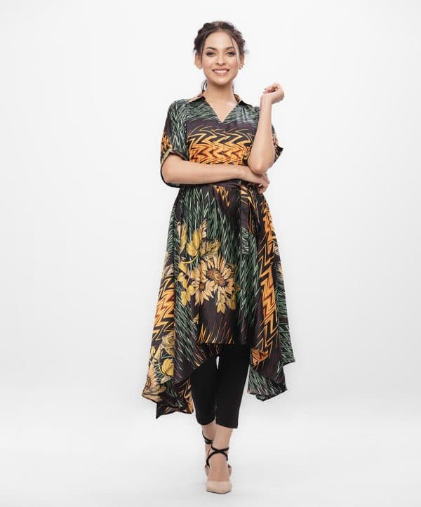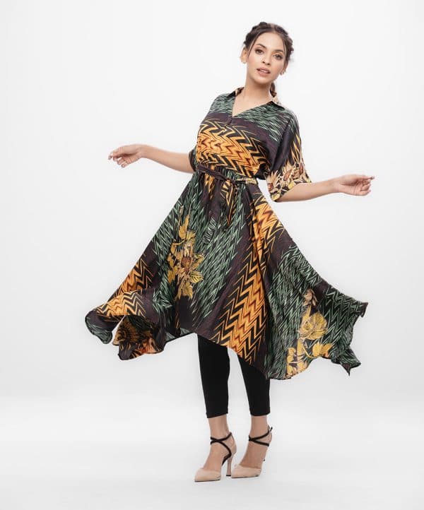 printed long tunic with drop sholder short sleeve. handkerchief hemline and shirt collar. belt is added at waist line.