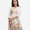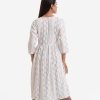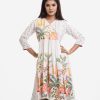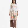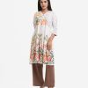 Woman’s printed A-line long tunic in viscose fabric. Three-quarter sleeves, V-neck with wrap design. Gathered waistline.