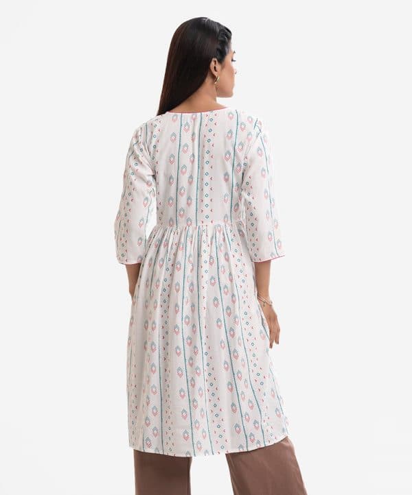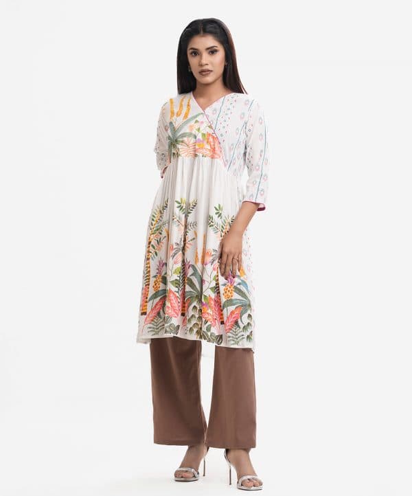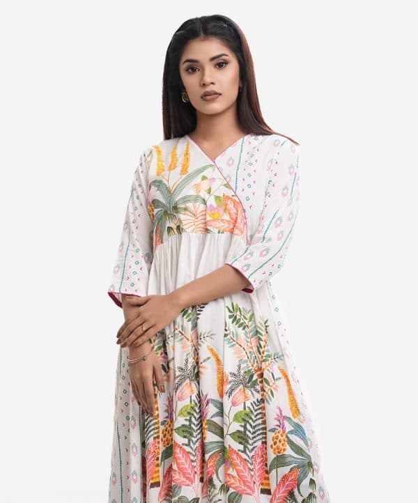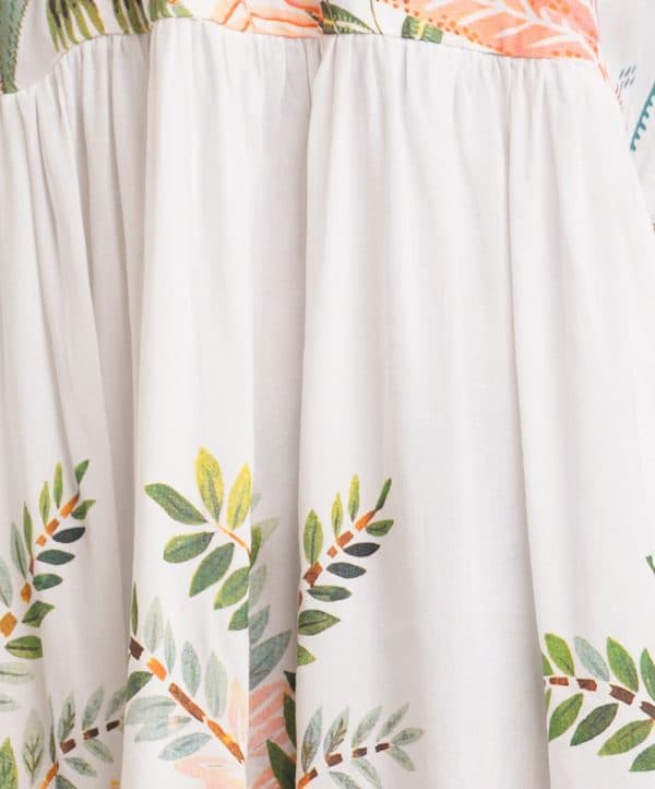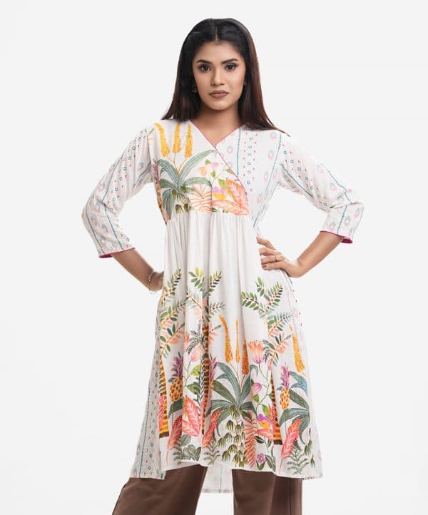 Woman’s printed A-line long tunic in viscose fabric. Three-quarter sleeves, V-neck with wrap design. Gathered waistline.