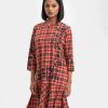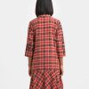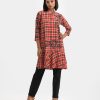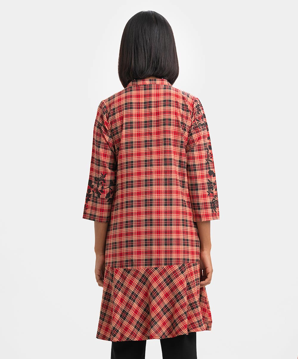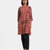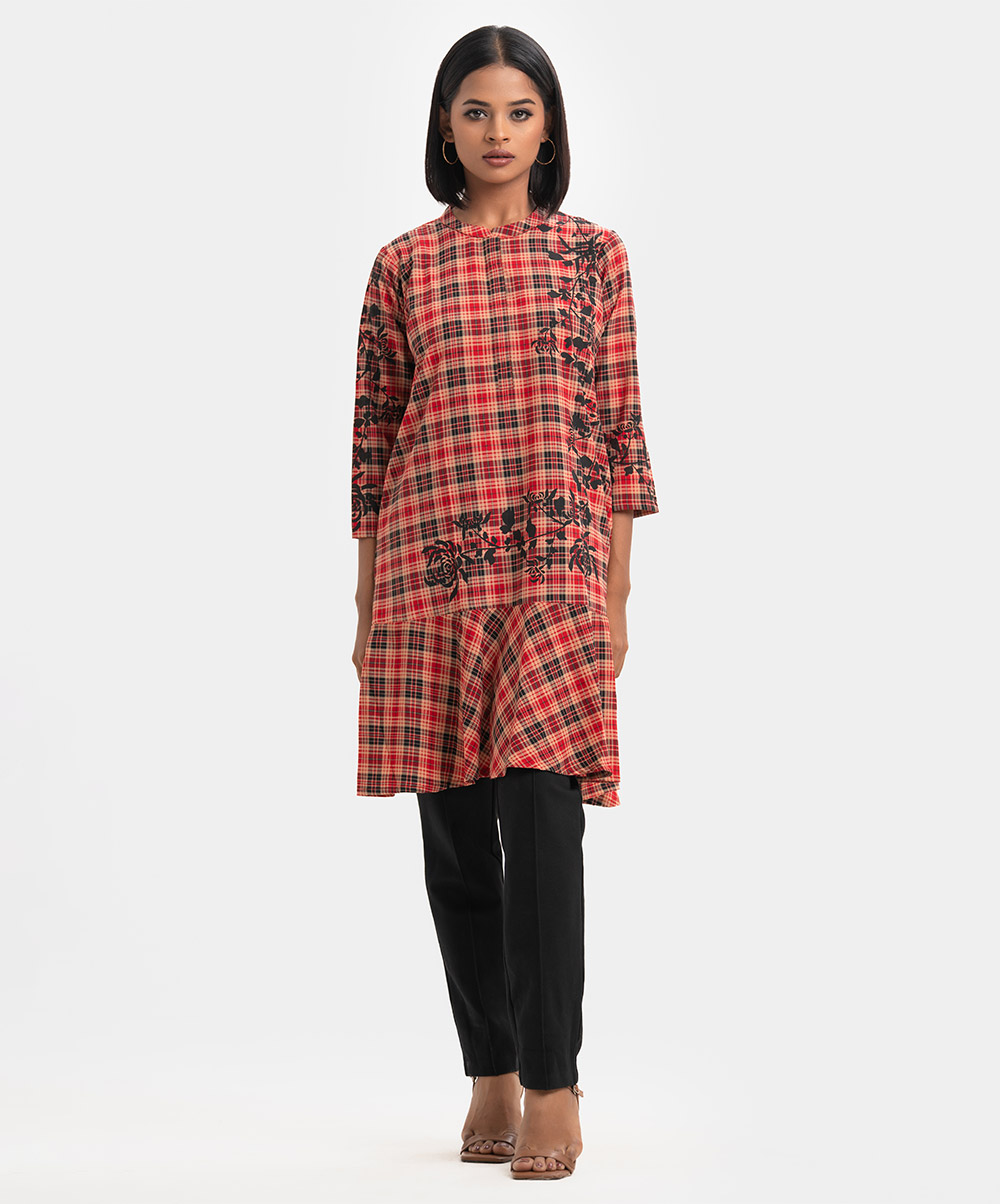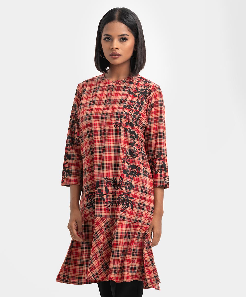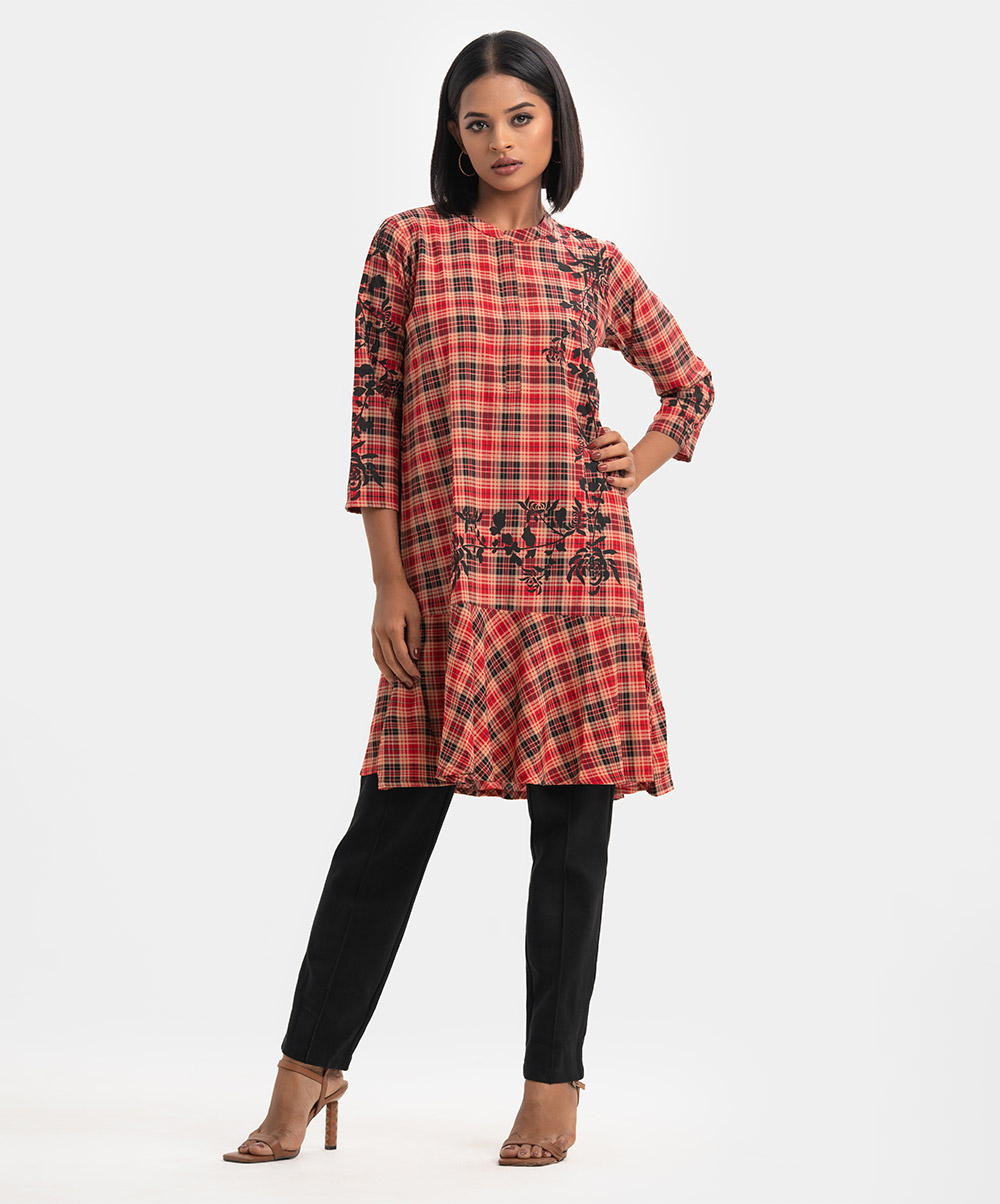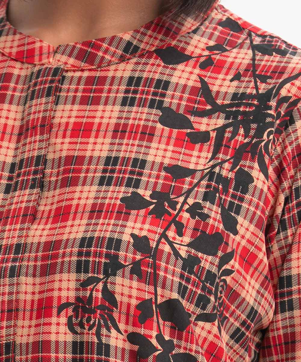 Women’s A-line long tunic in georgette fabric. Stand collar, long-sleeved.