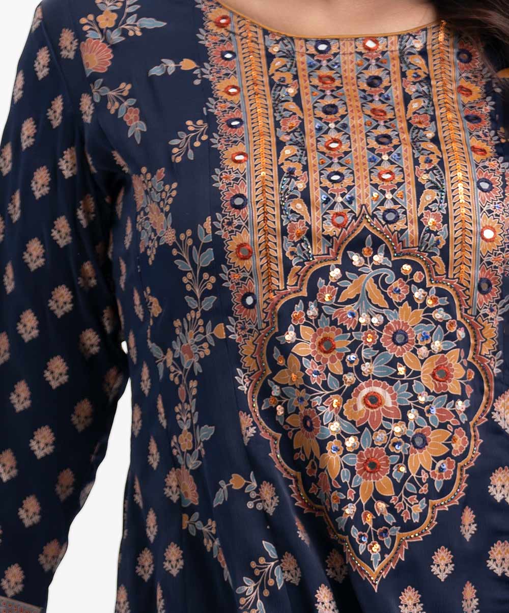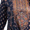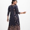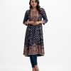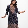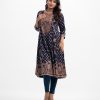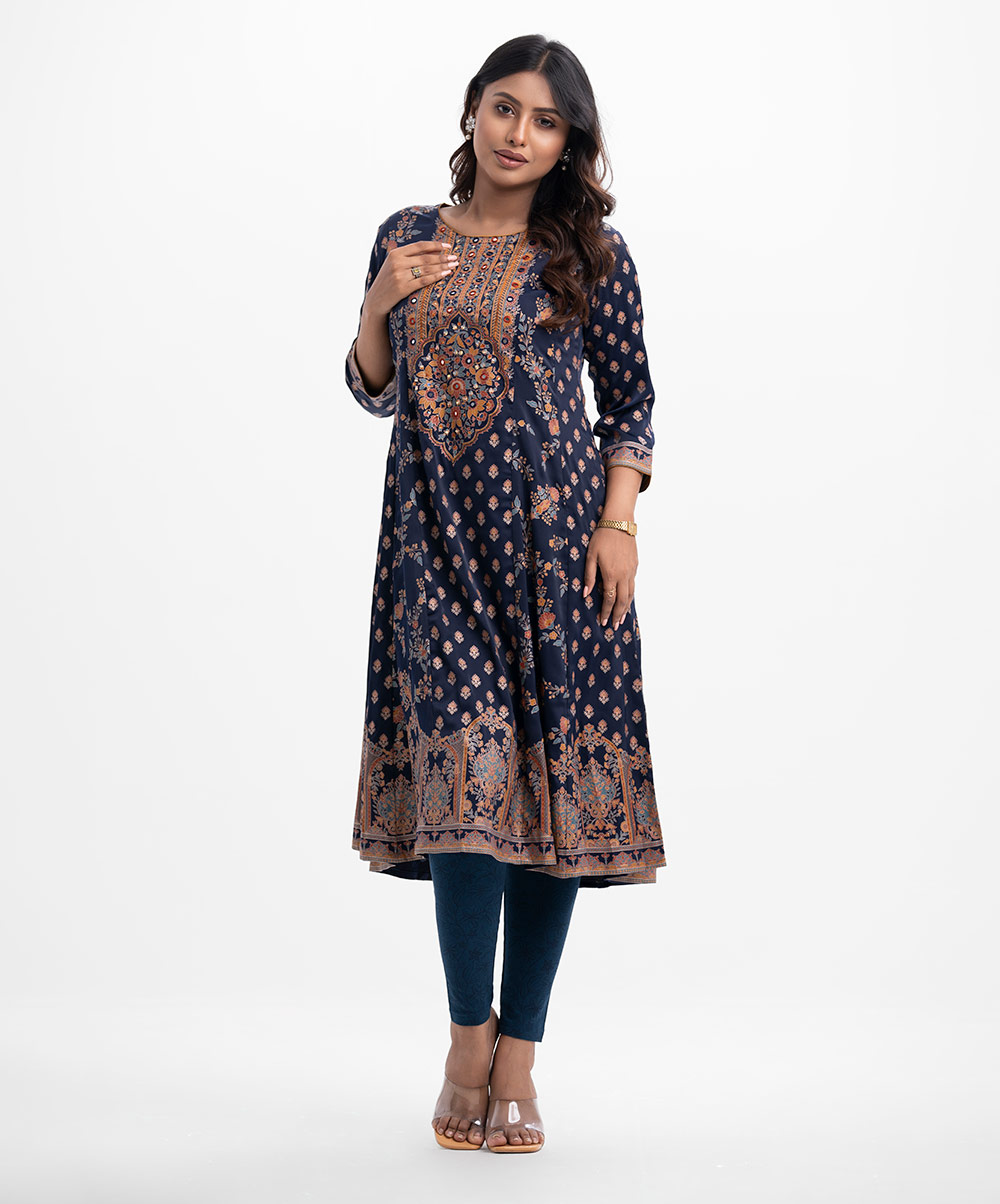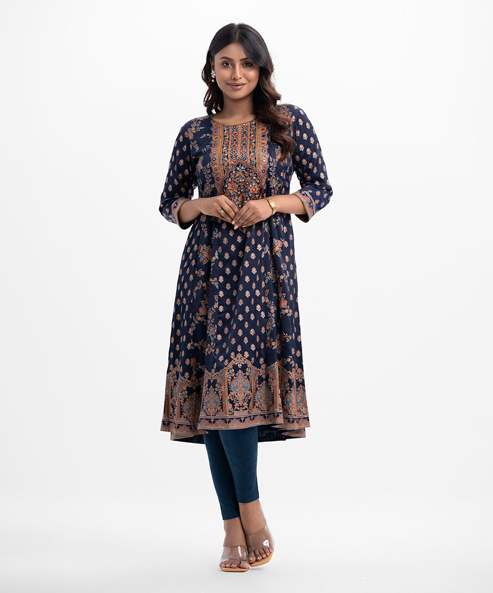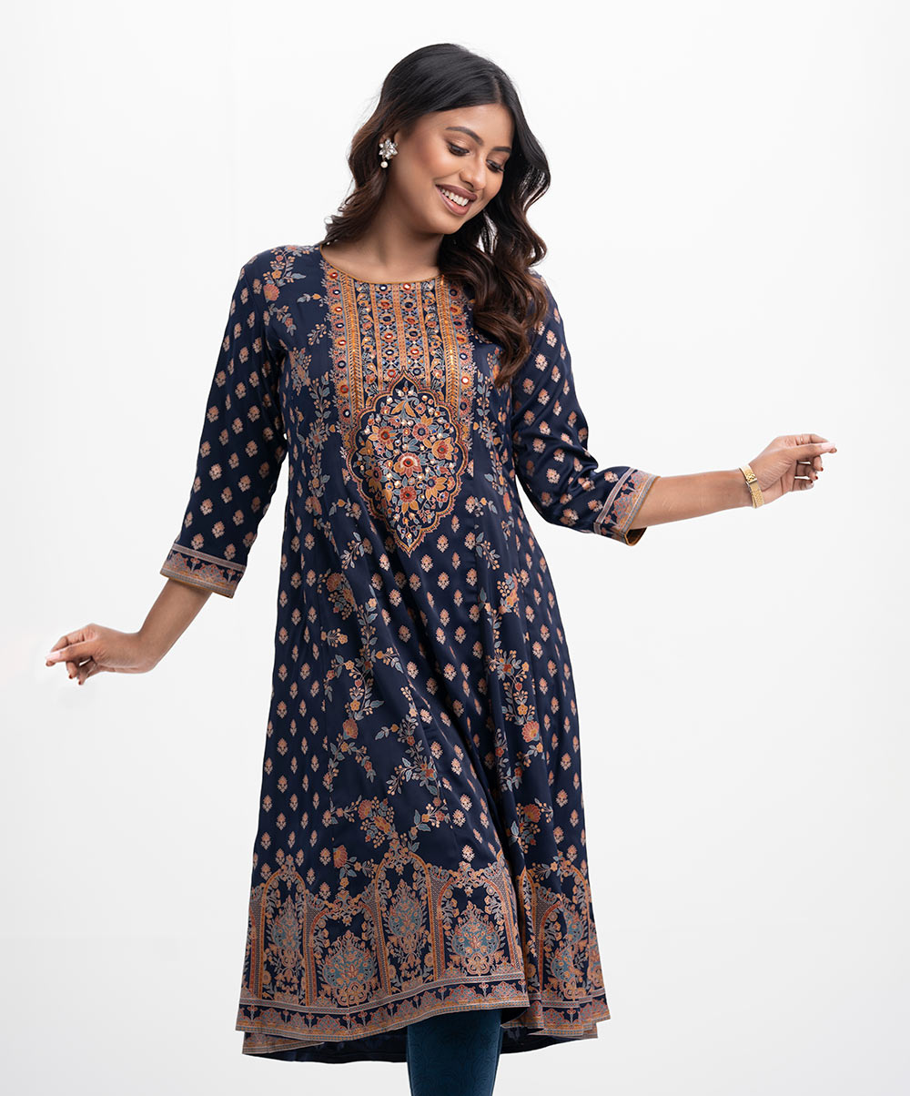 Frock patterned long tunic in crepe fabric. Round neck, three-quarter sleeves, karchupi at the front.