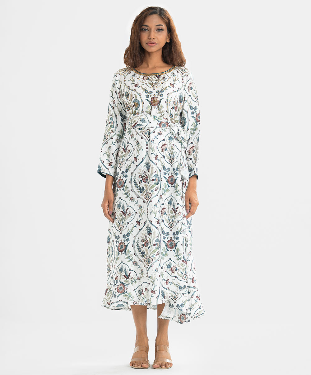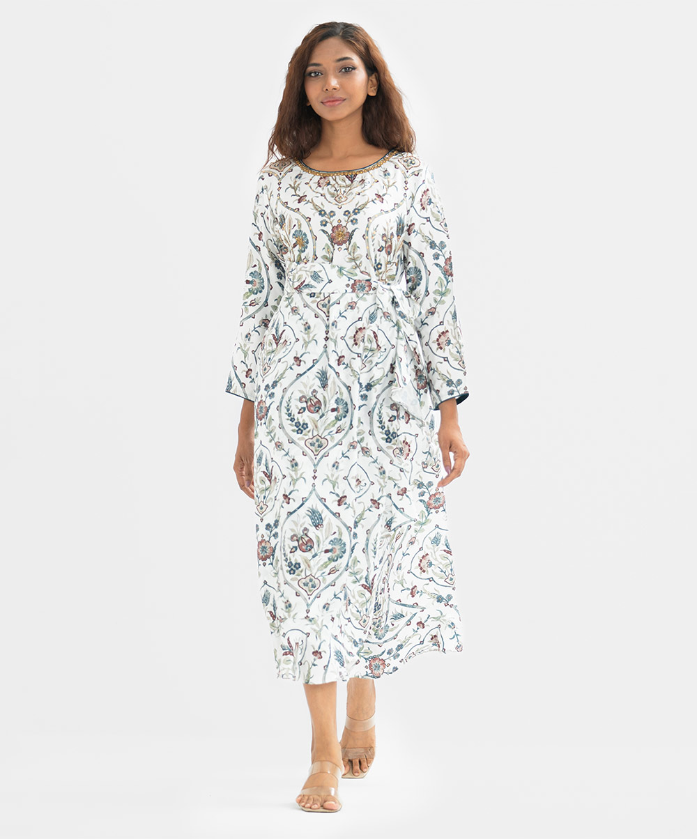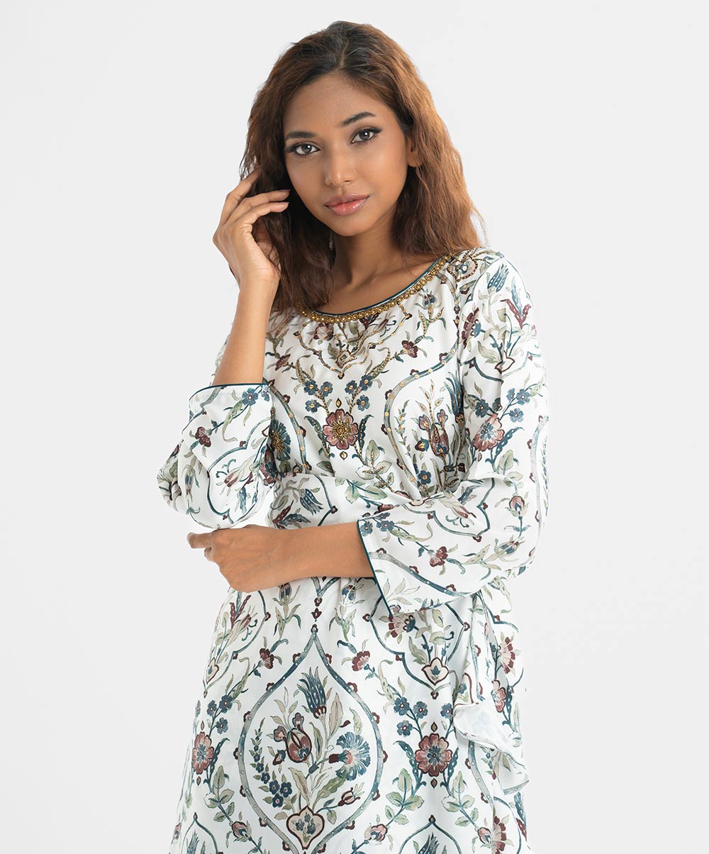 Women’s floral printed long A-line tunic in satin fabric. Boat neck, full sleeves. Karchupi & raffle at front. Belt at the waistline.