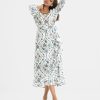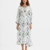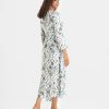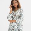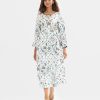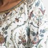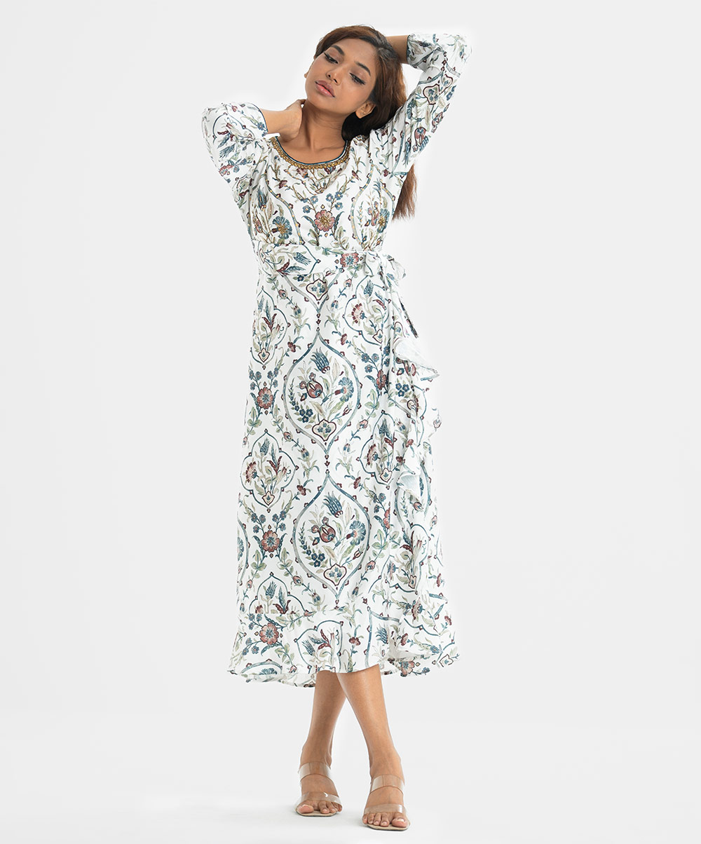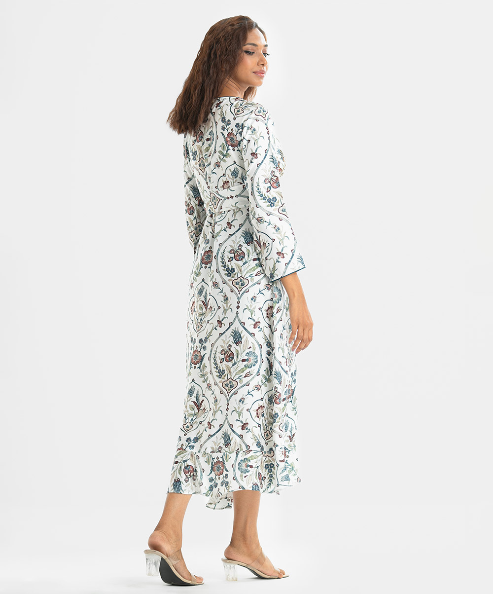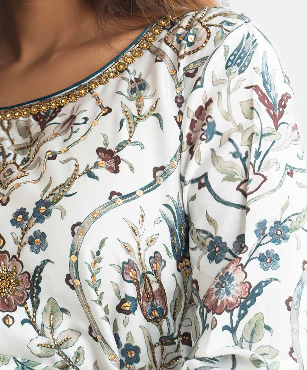 Women’s floral printed long A-line tunic in satin fabric. Boat neck, full sleeves. Karchupi & raffle at front. Belt at the waistline.