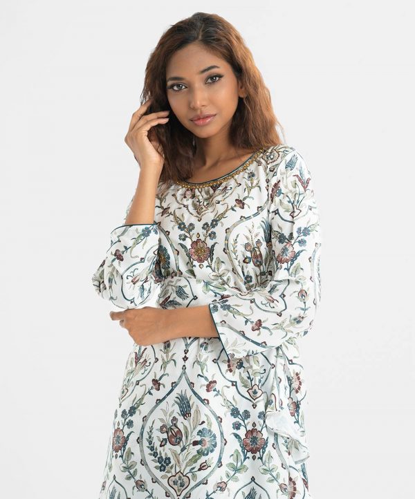 Women’s floral printed long A-line tunic in satin fabric. Boat neck, full sleeves. Karchupi & raffle at front. Belt at the waistline.