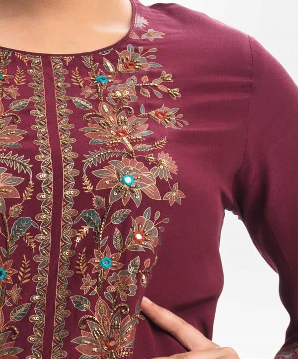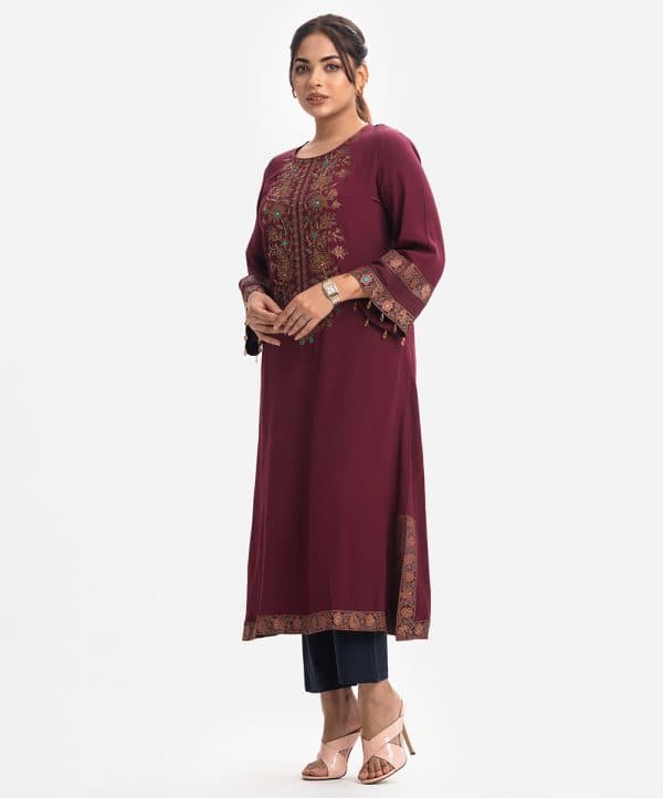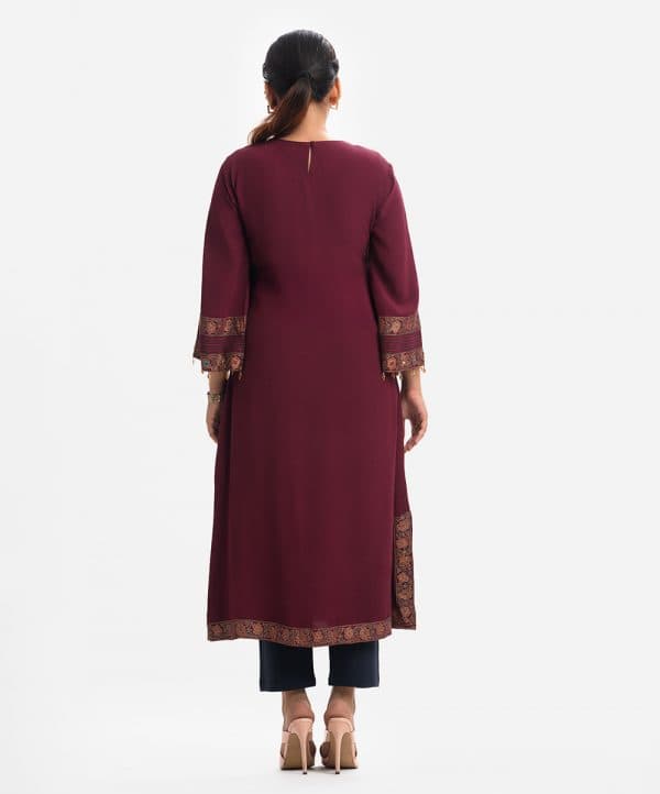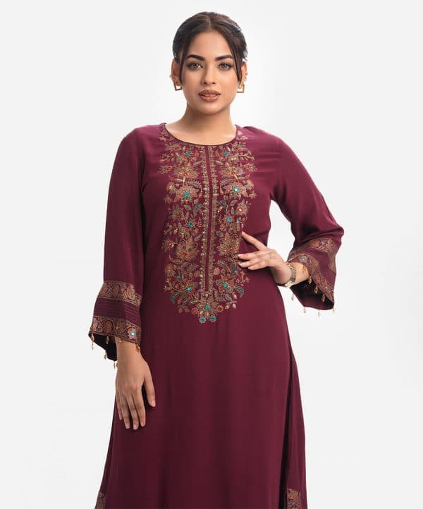Round neck exclusive long tunic in silk-viscose blended fabric from Nargisus by Le Reve. Karchupi and jewelled tassel details at the front and bell sleeves.
