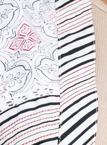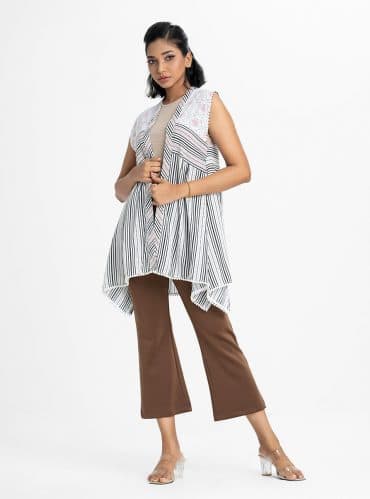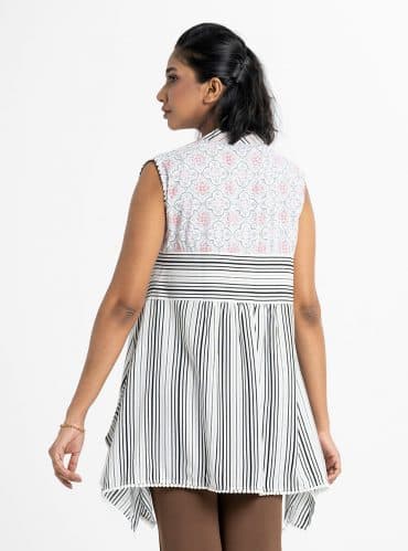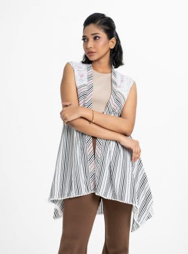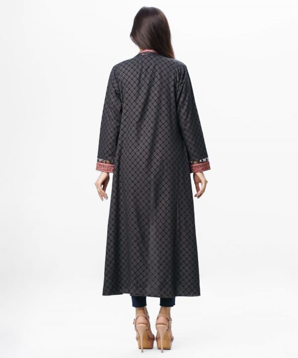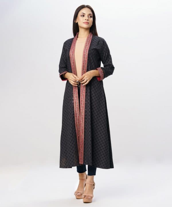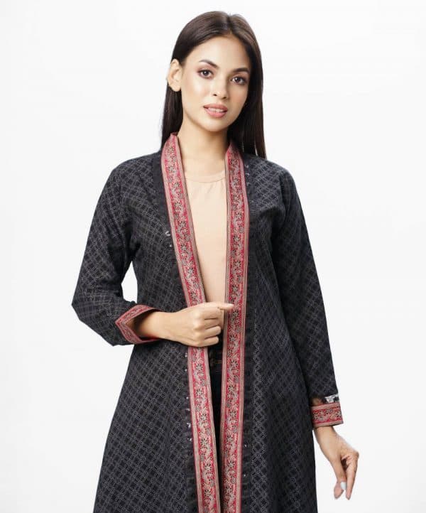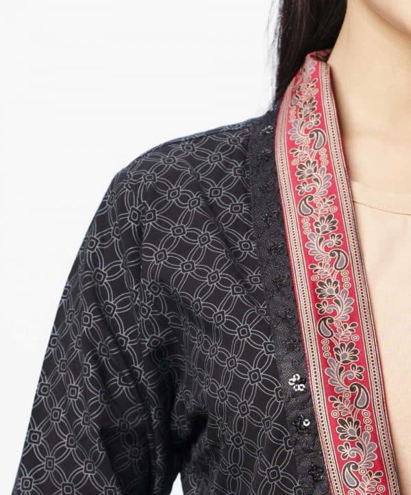 The long shrug is made of black-colored viscose fabric, allover printed, full sleeve, and use of the printed border and sequins fabric in neckline and sleeve.