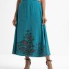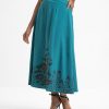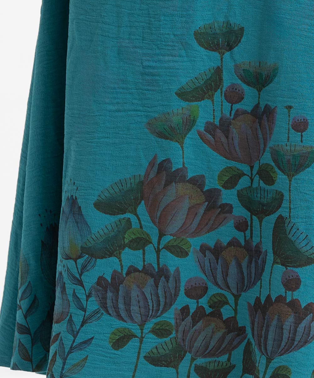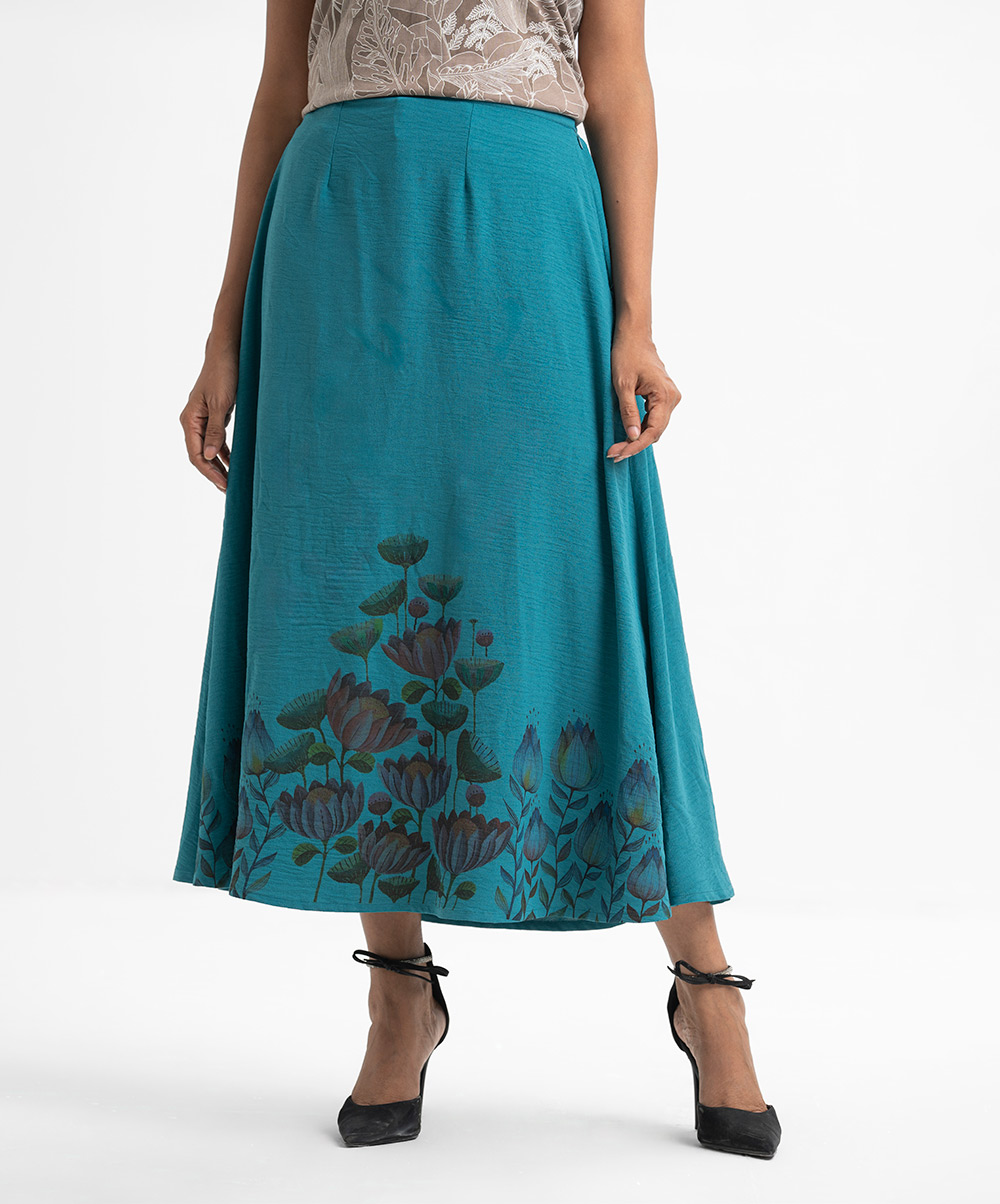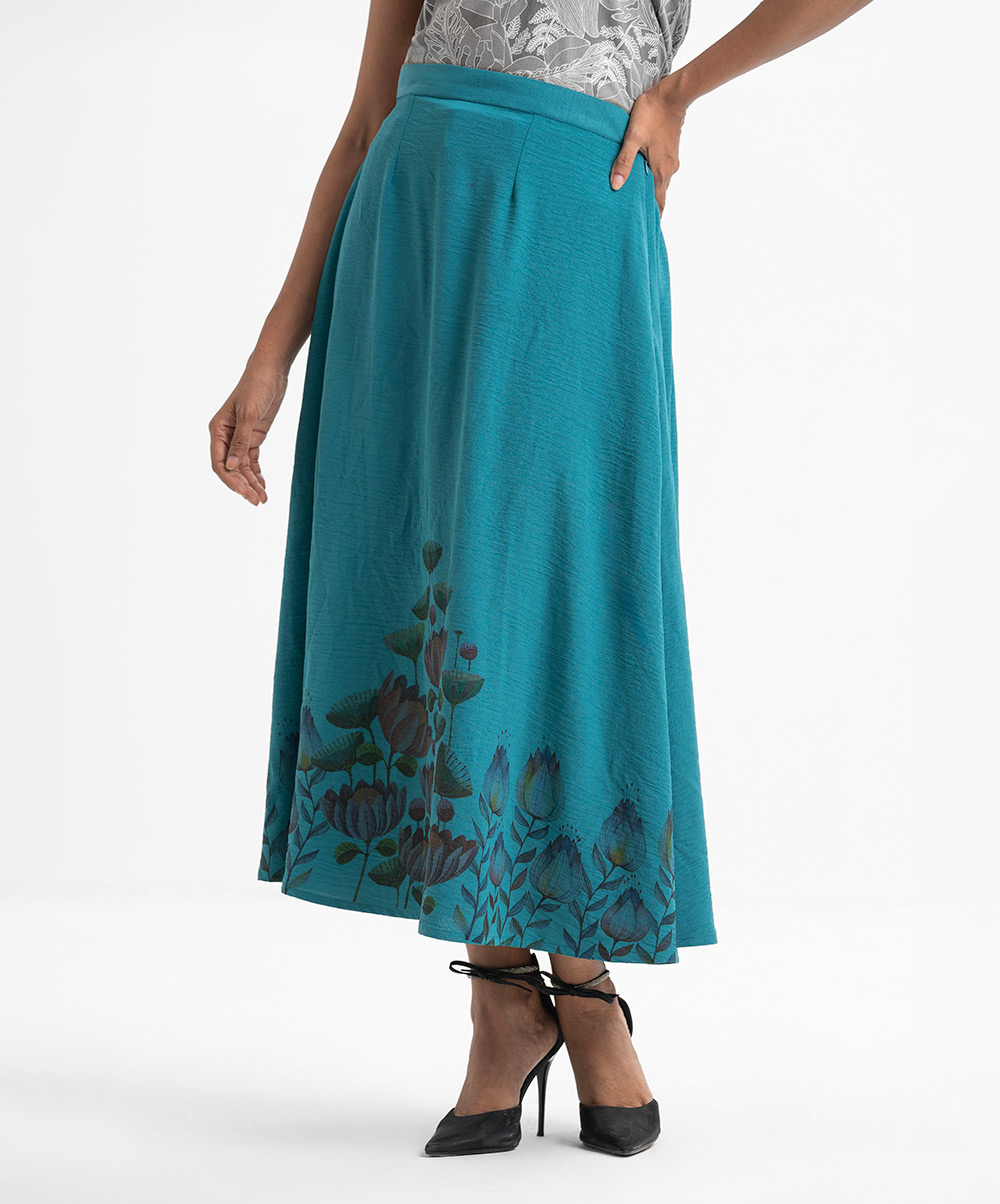 Women’s skirt in stretchable georgette fabric. Concealed elasticated waistline with side hidden zipper. Floral print detail at front and inseam pockets.