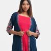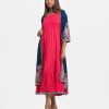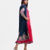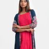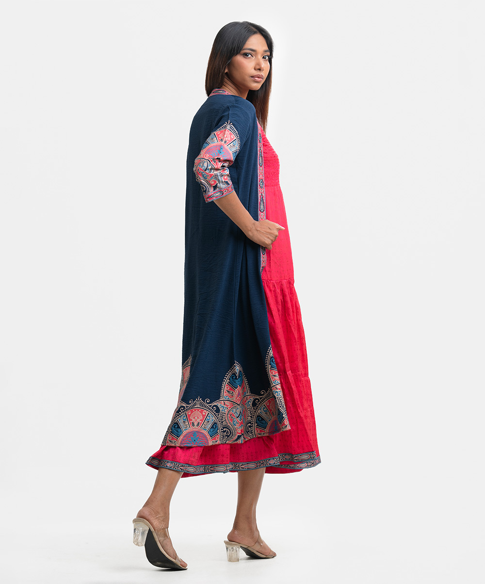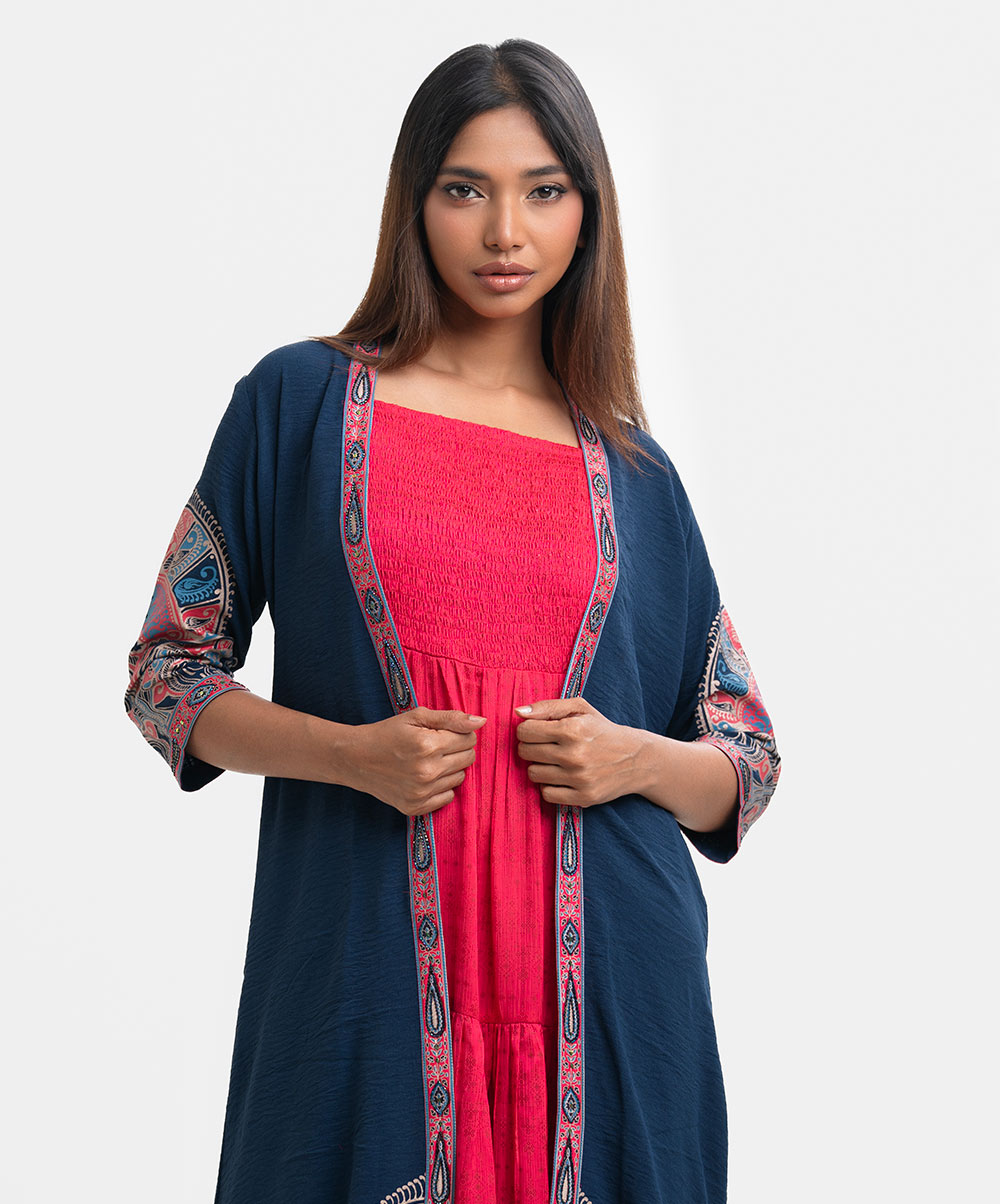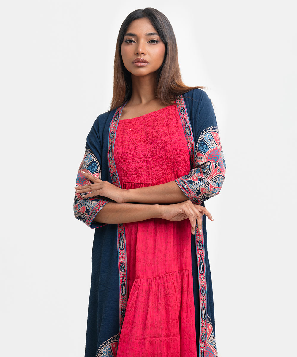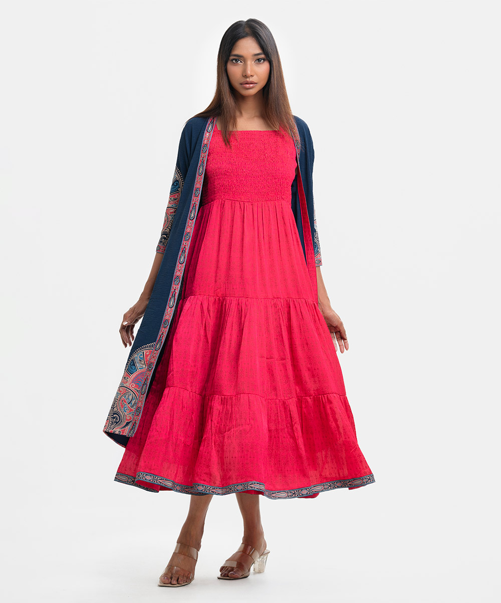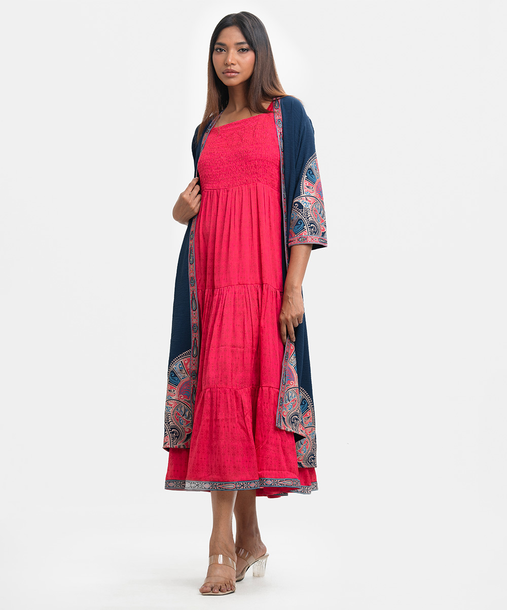 Sleeveless & smocked tiered maxi dress in joom fabric. Complemented with an open front shrug. Karchupi details at the front.