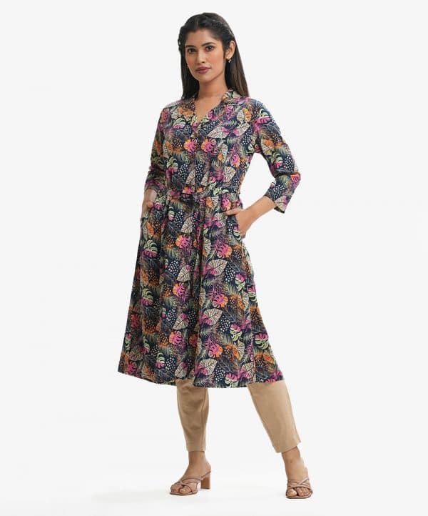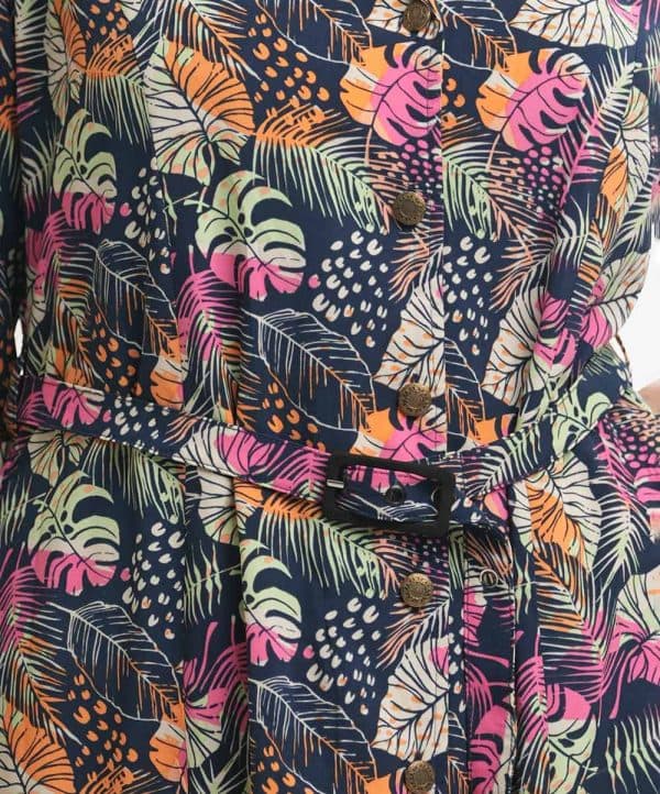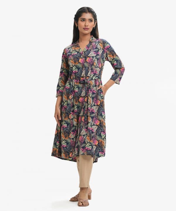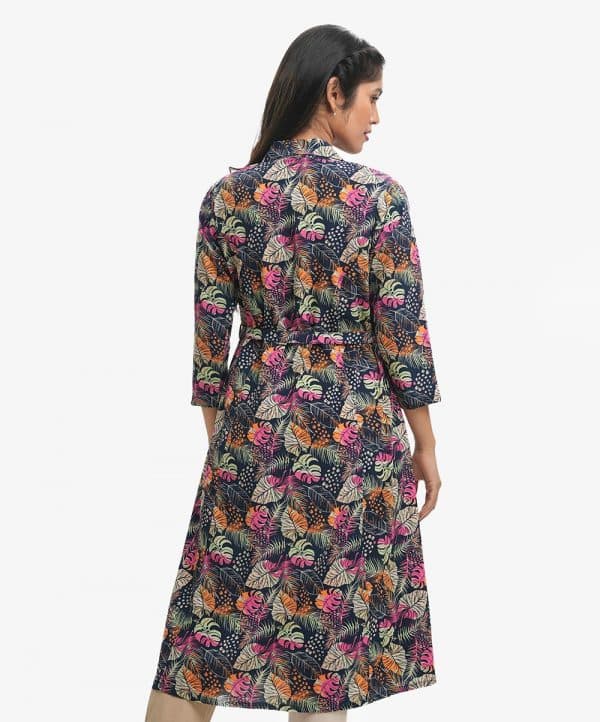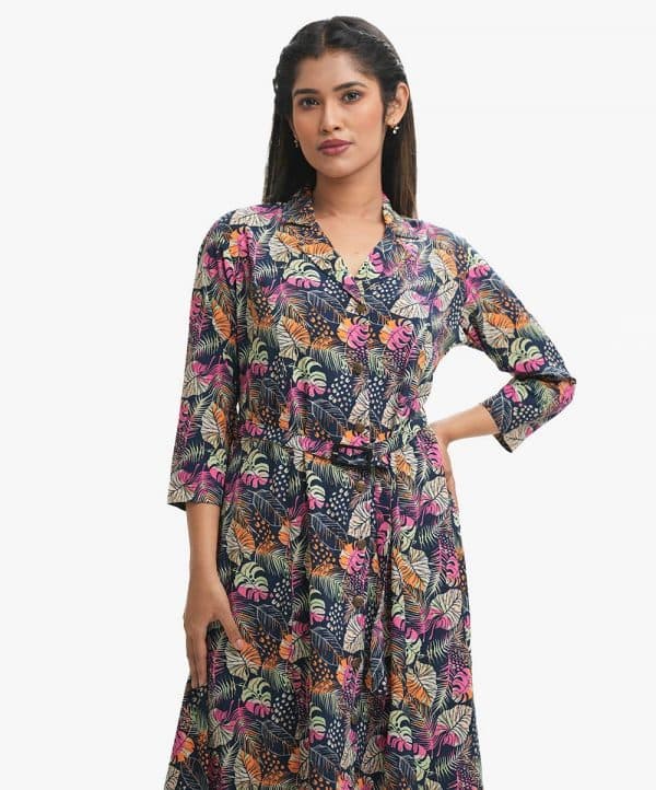 Women’s A-line Maxi in printed georgette fabric. Lapel collar, three-quarter sleeves. Buttons opening, waistbelt and inseam side pockets.