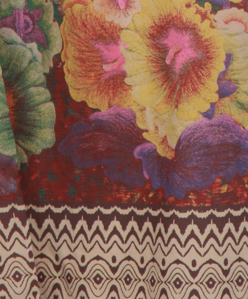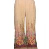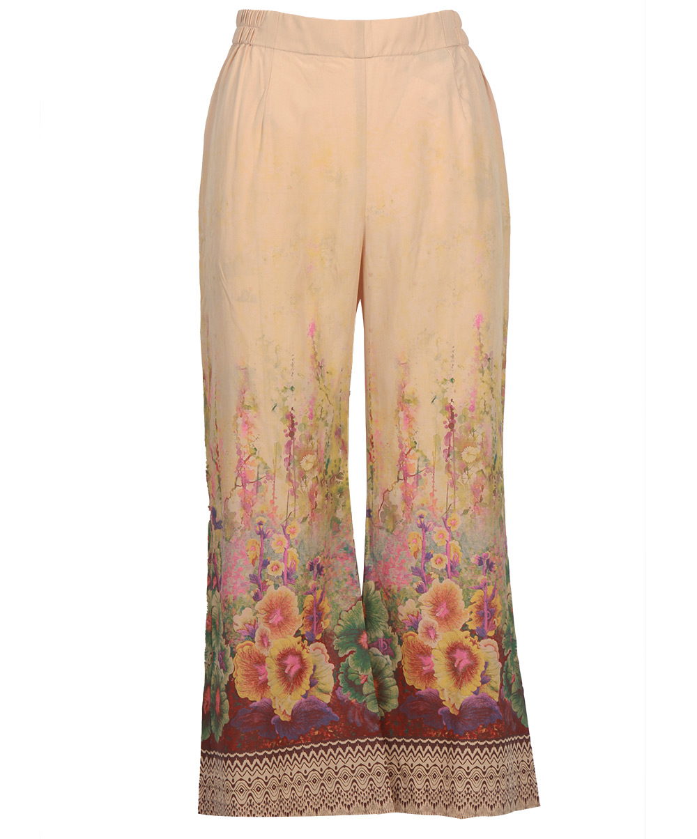 Light brown viscose palazzo with floral print on leg opening.