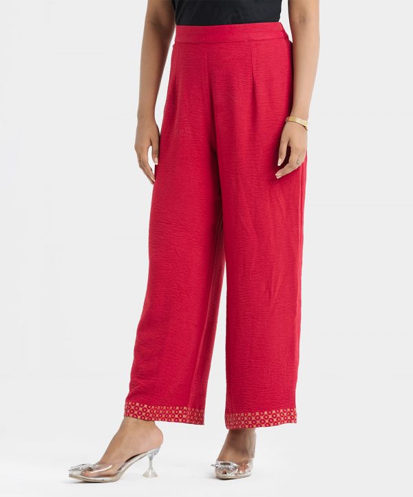 Women’s palazzo in stretchable georgette fabric. Concealed elasticated waistline. Print details on leg lines.