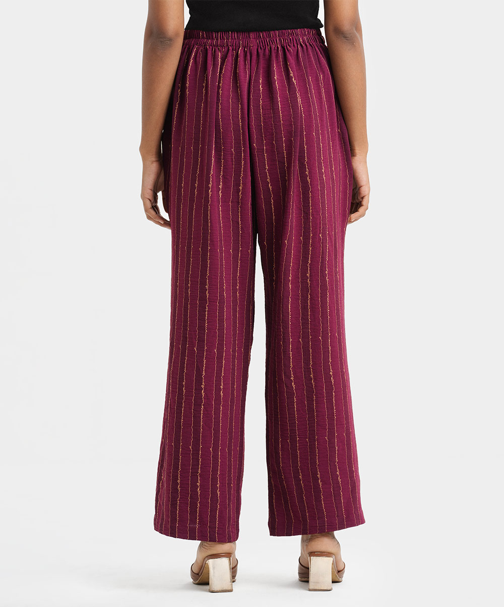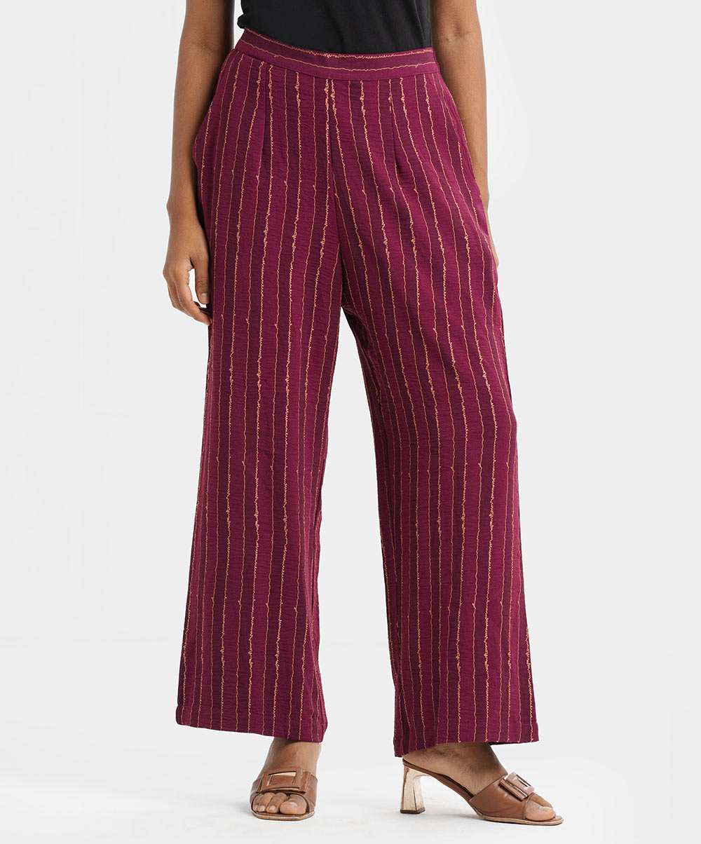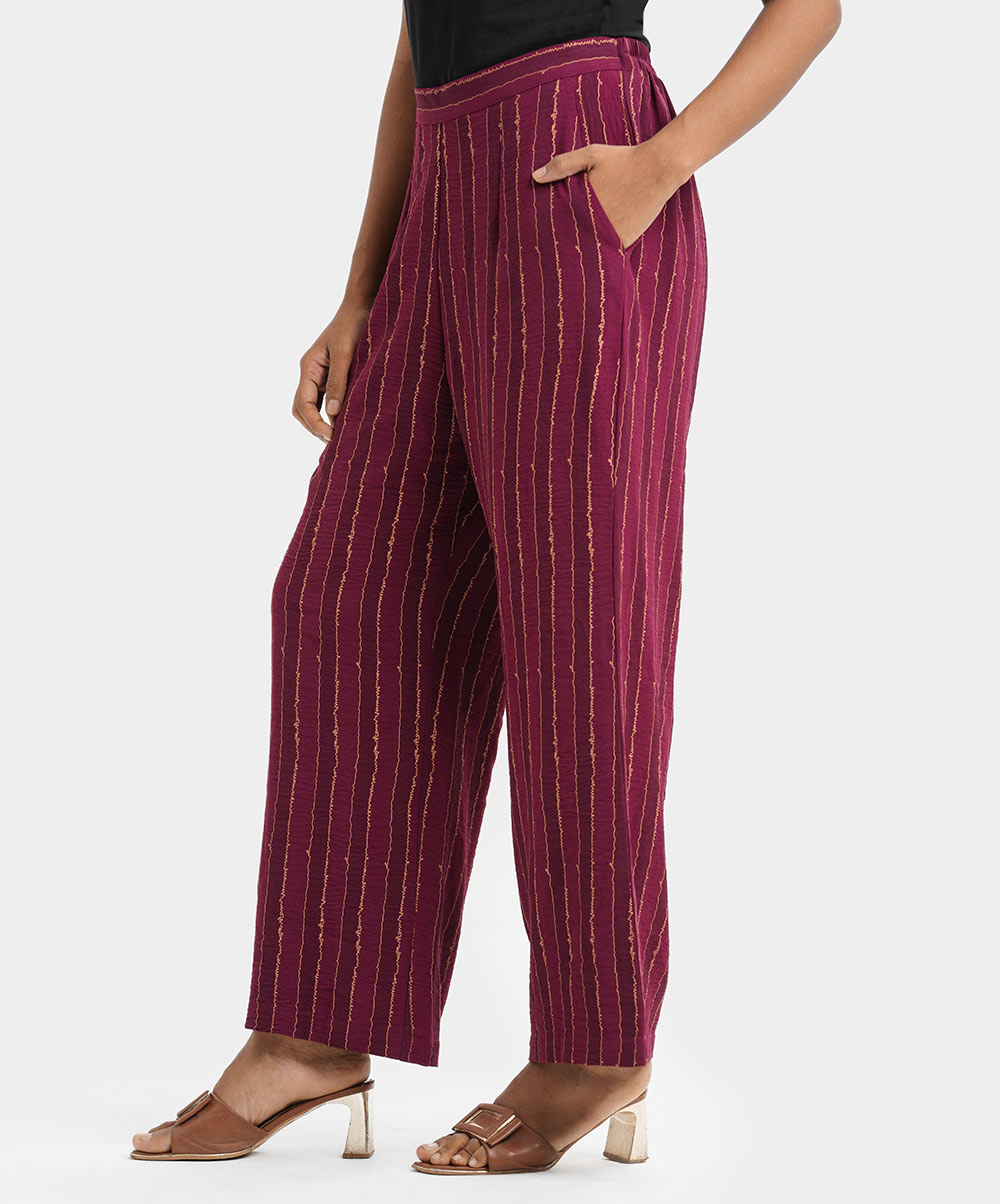 Women’s printed pant style palazzo in stretchable georgette fabric. Concealed elasticated waistline with inseam pockets.