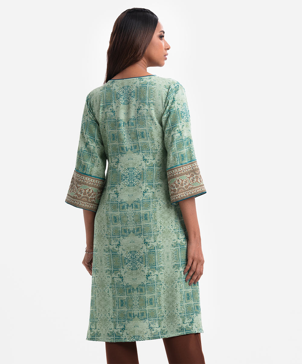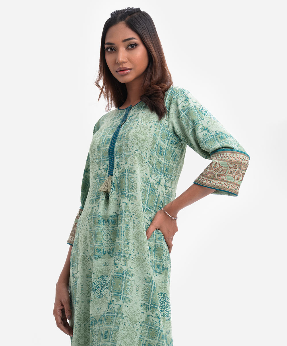 Women’s printed A-line maternity tunic in stretchable georgette fabric. Round neck with placket and bell sleeves. Tassel attached at placket and lace attached at sleeves.
