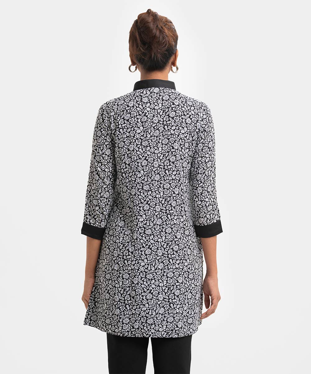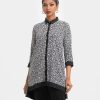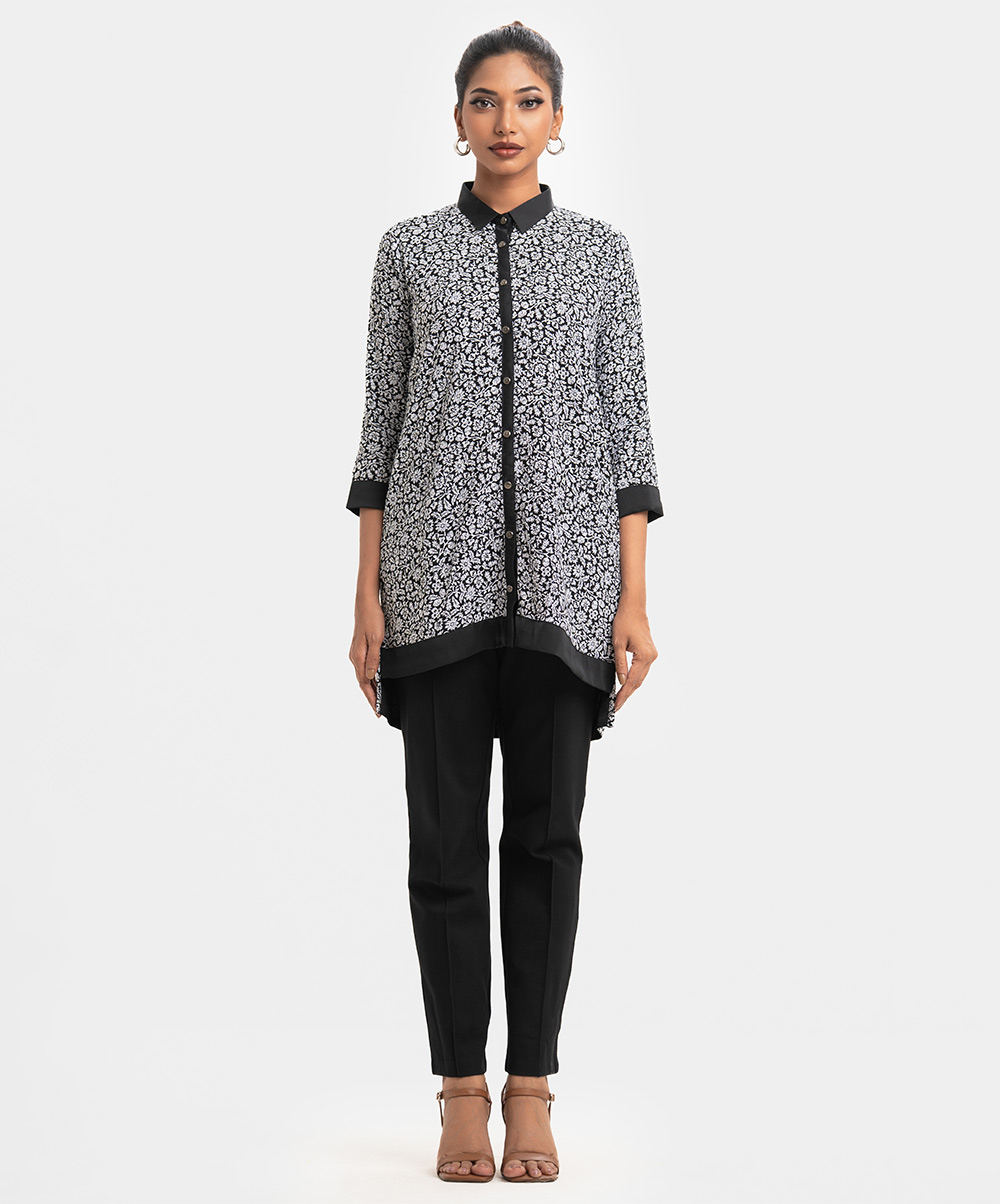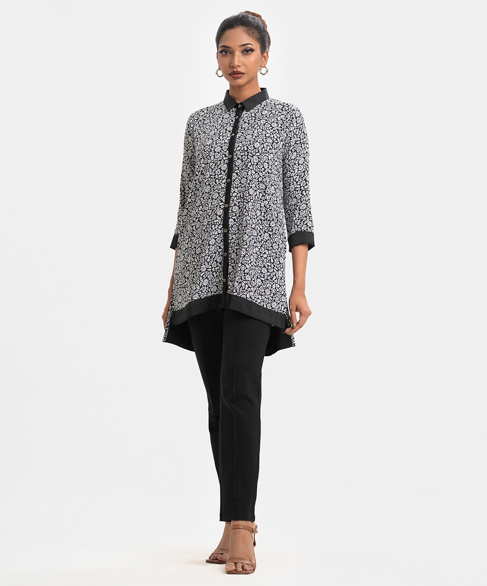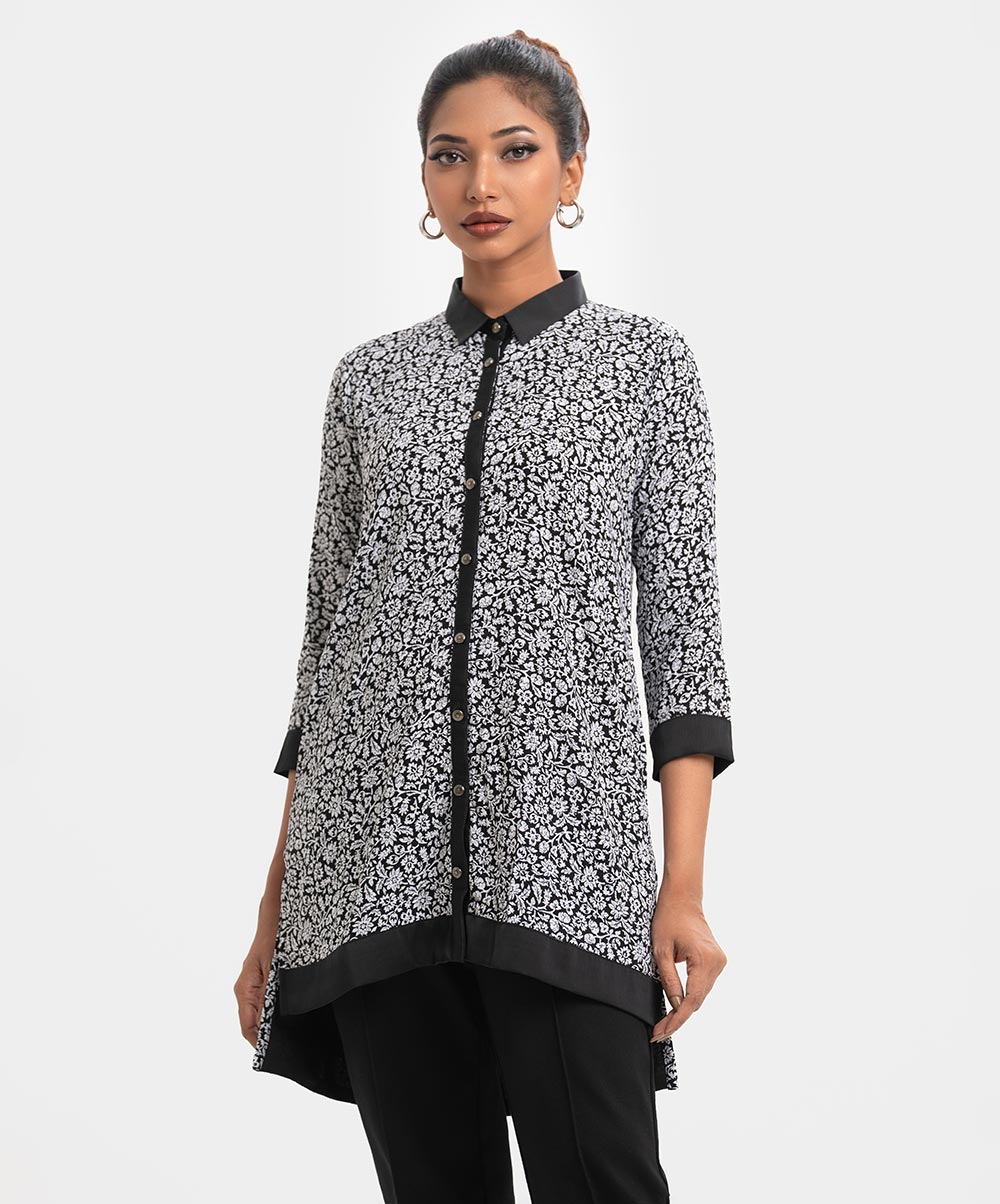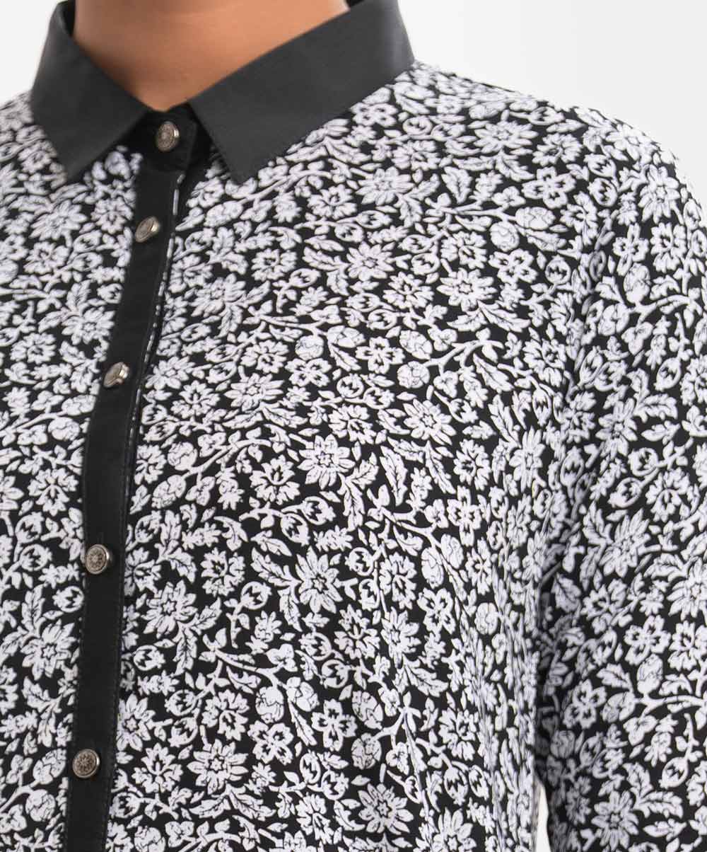 Printed shirt style maternity tunic in viscose fabric. Classic collar with buttons placket and full sleeves.