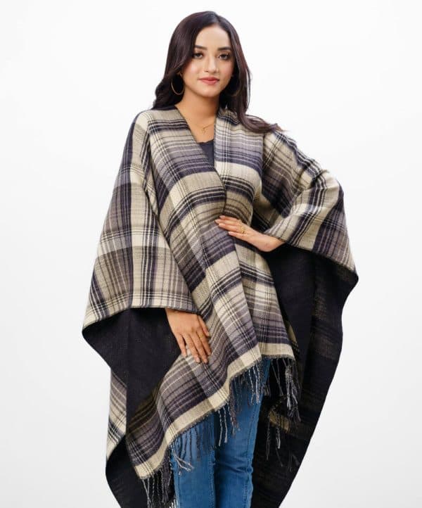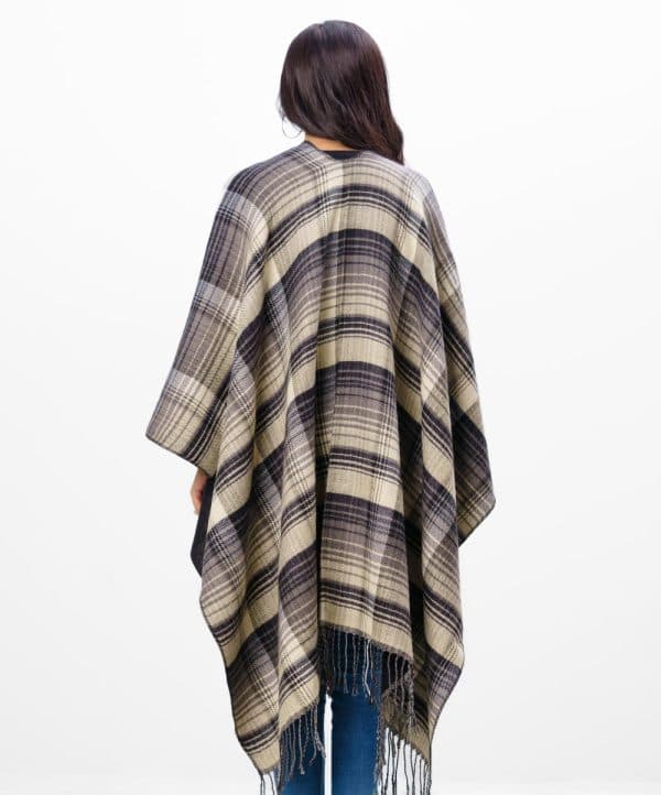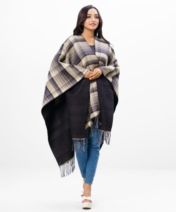 Brown and Black patterned Poncho in soft blended woollen fabric with an open front.