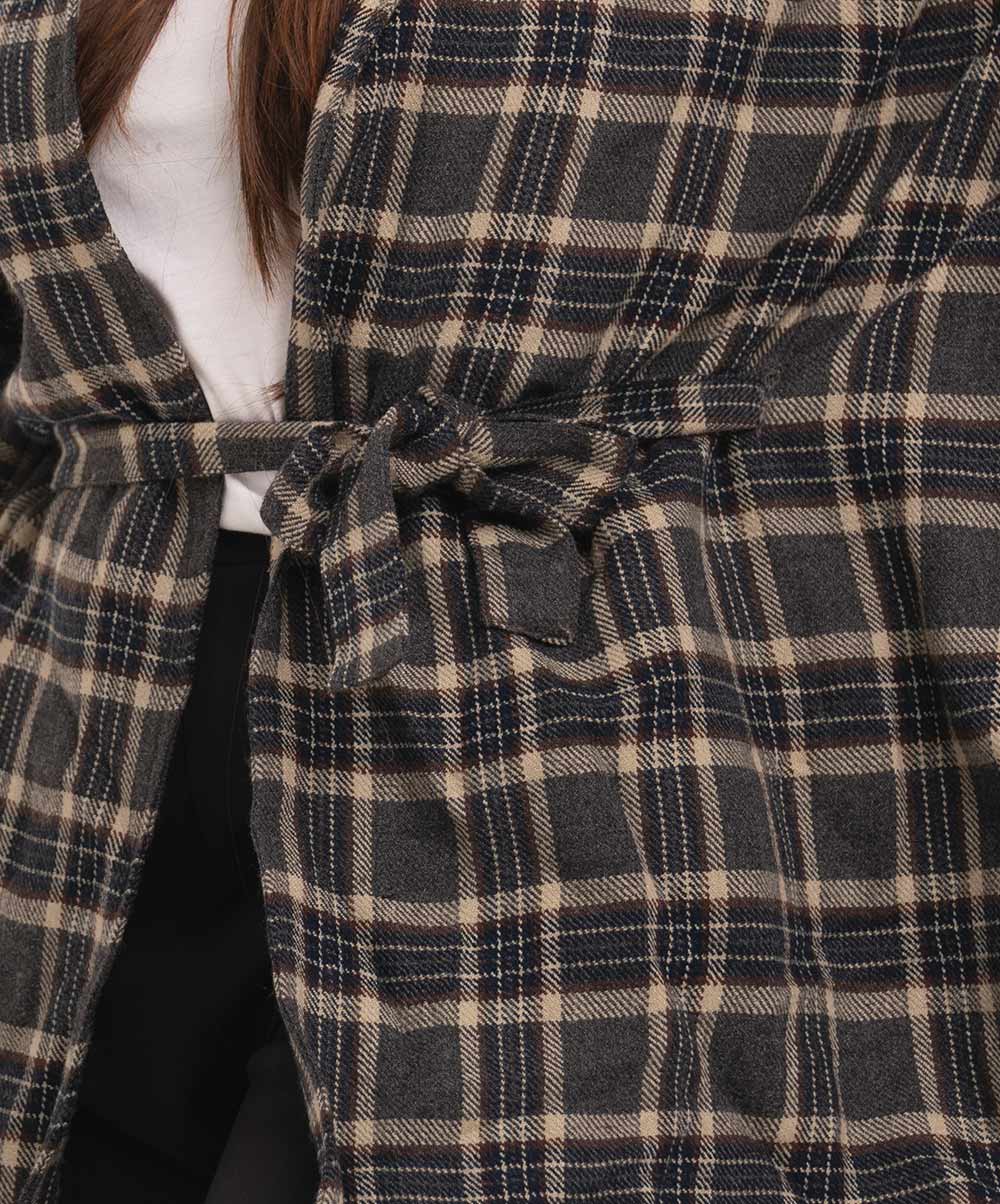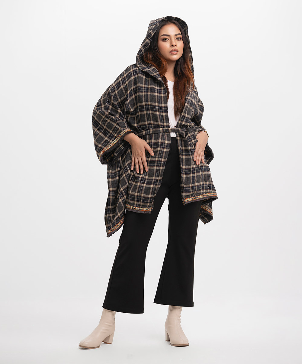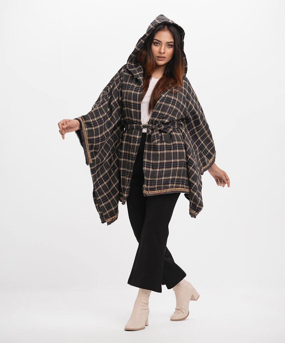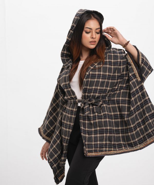 Women’s winter hoodie style poncho in cotton flannel fabric. Waistbelt and frayed lace at the border.