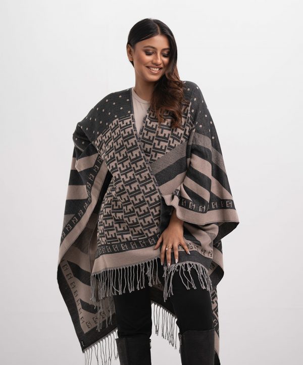 Women’s triangle-shaped winter poncho in woolen fabric. Comes with fringe trim at the border.