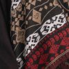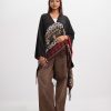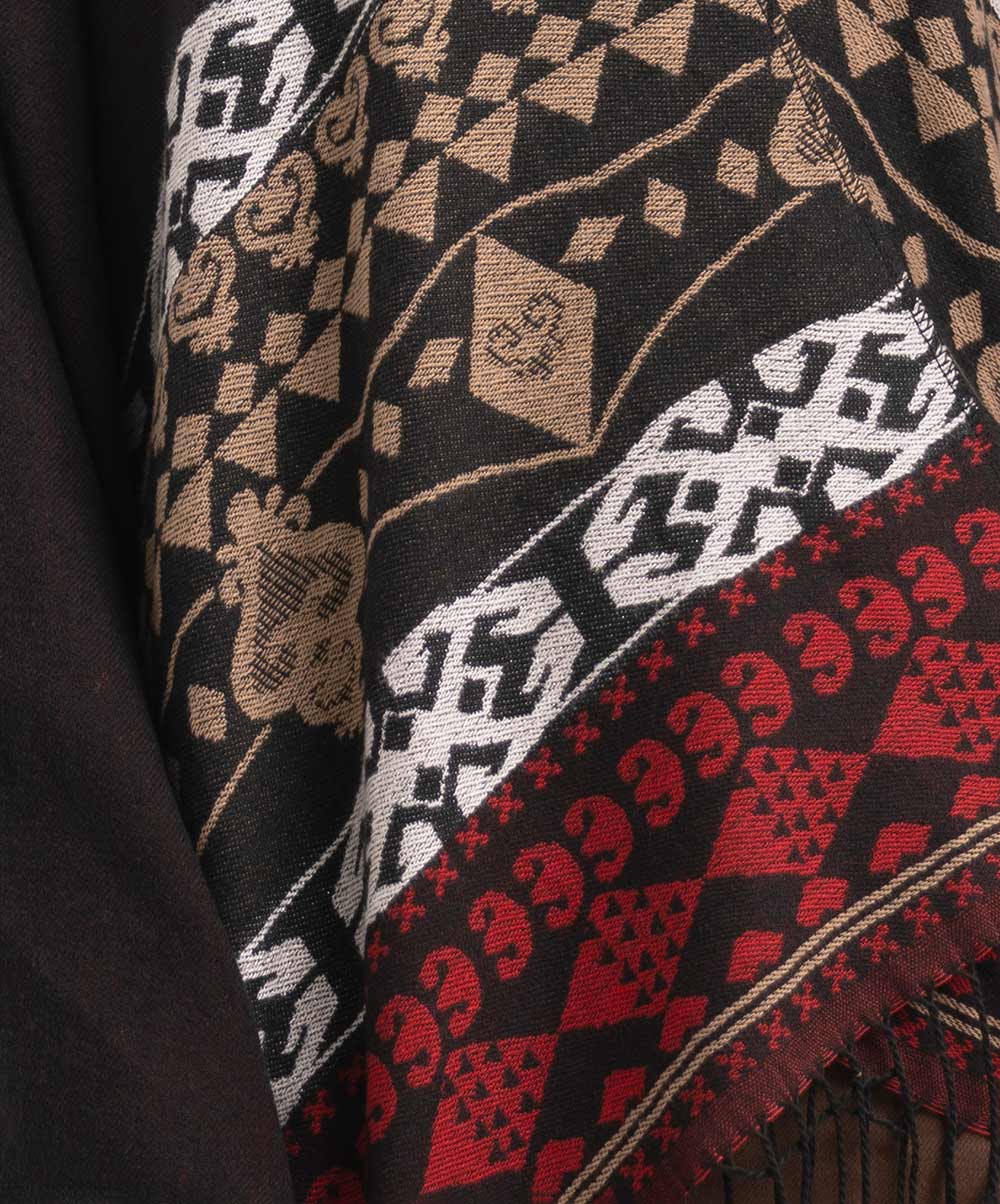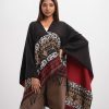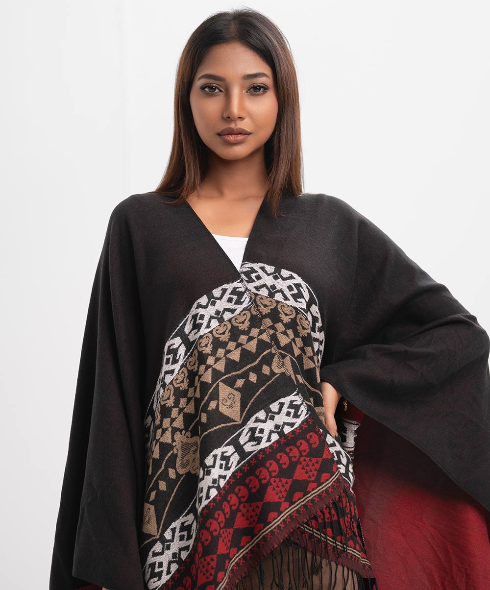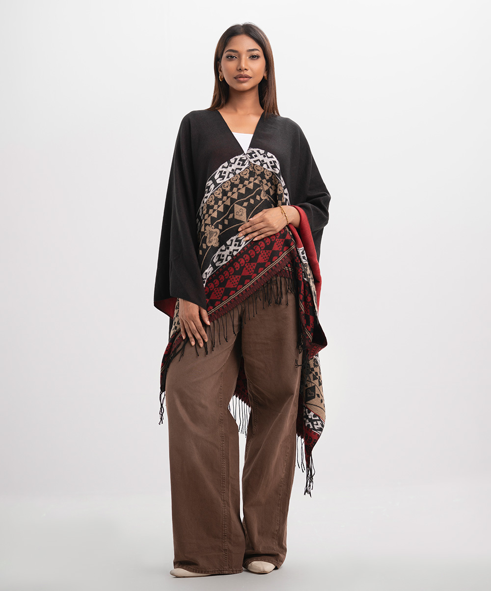 Women’s triangle-shaped winter poncho in woolen fabric. Comes with fringe trim at the border.