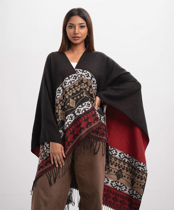 Women’s triangle-shaped winter poncho in woolen fabric. Comes with fringe trim at the border.