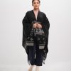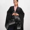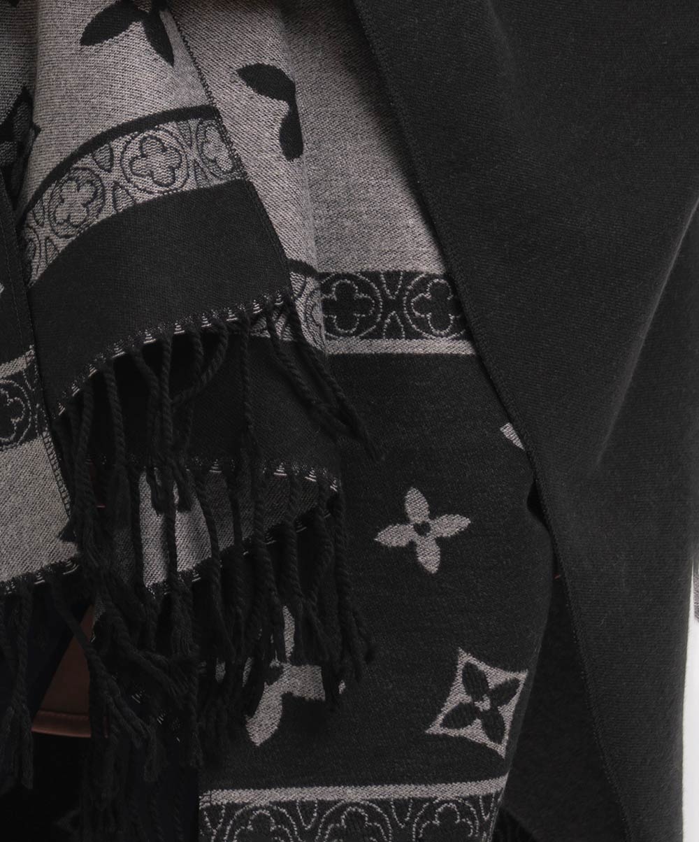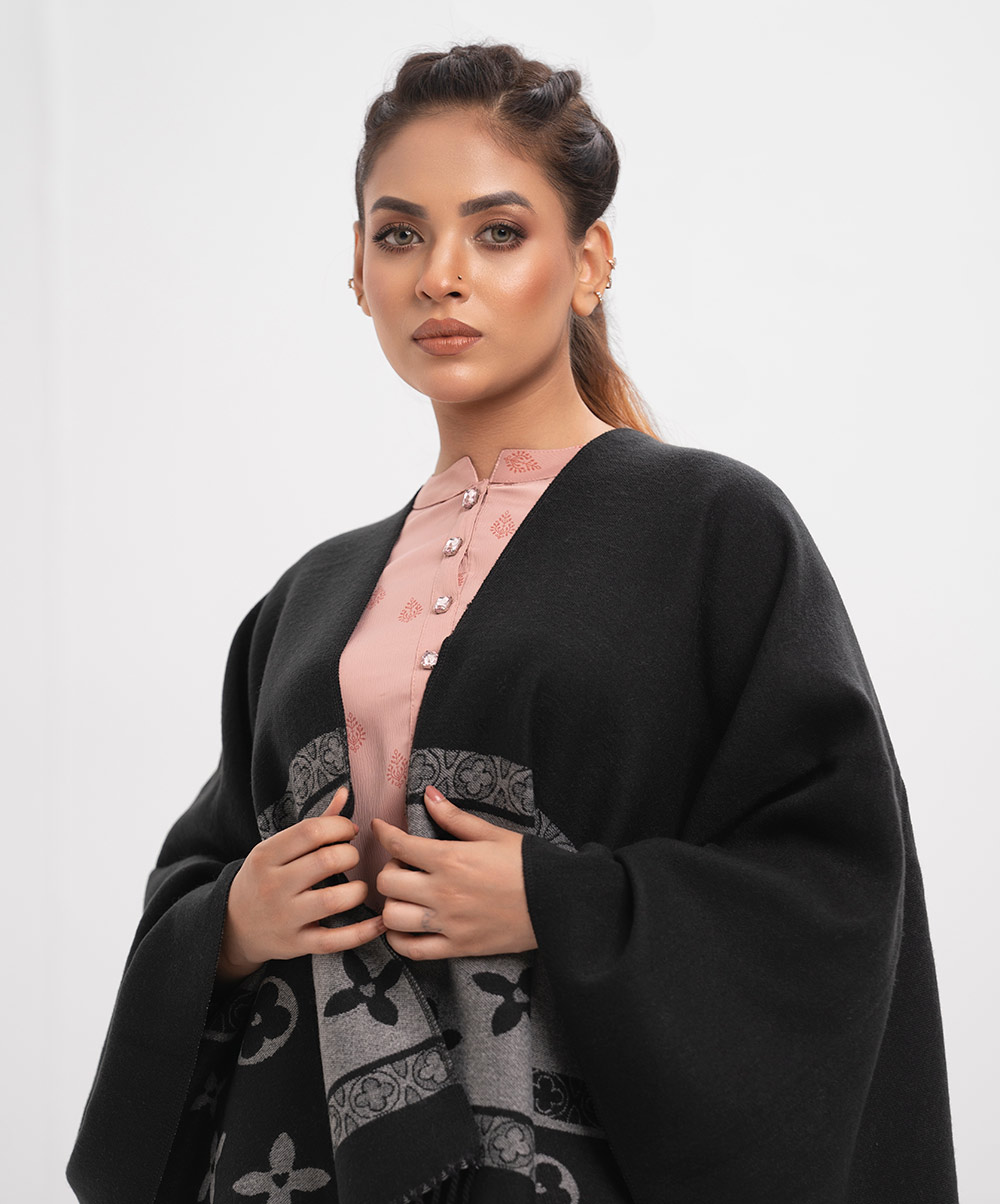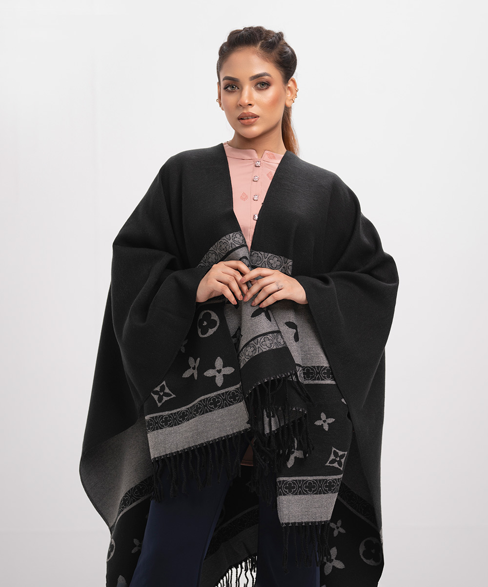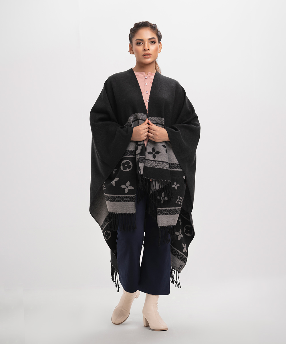 Women’s triangle-shaped winter poncho in woolen fabric. Comes with fringe trim at the border.