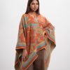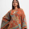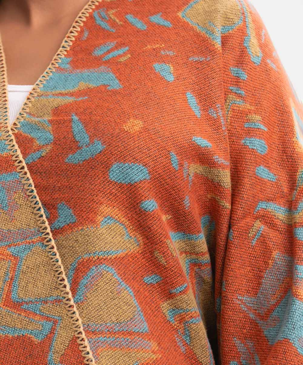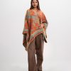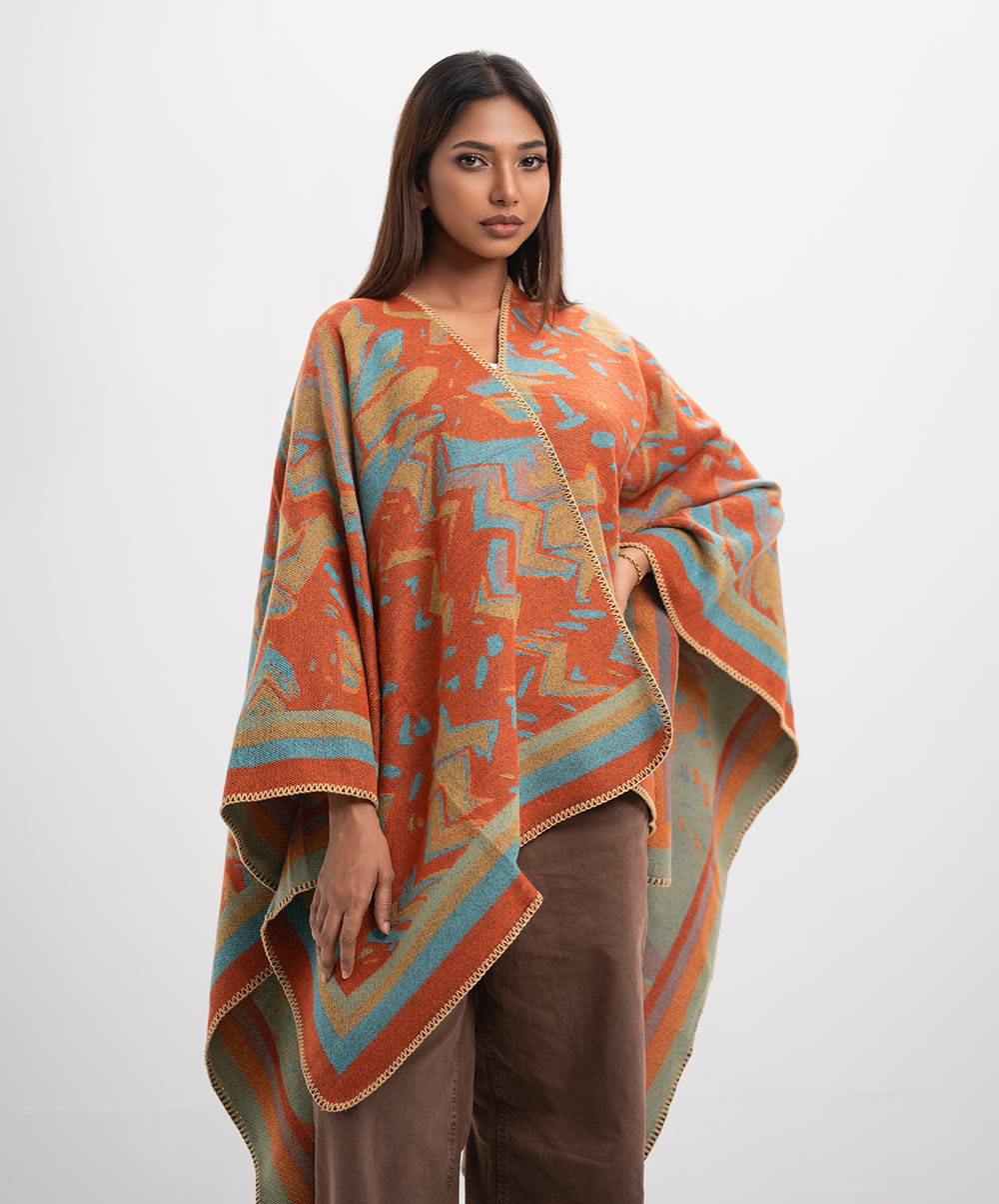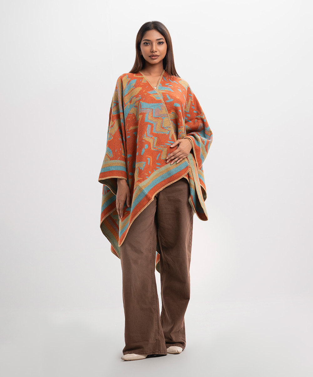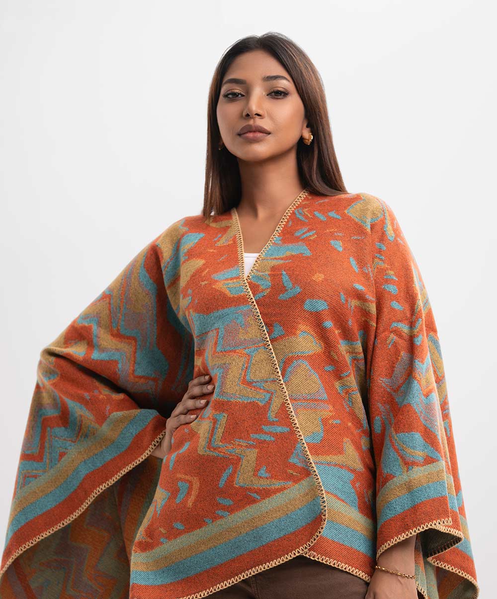Women’s triangle-shaped winter poncho in woolen fabric. Comes with fringe trim at the border.