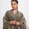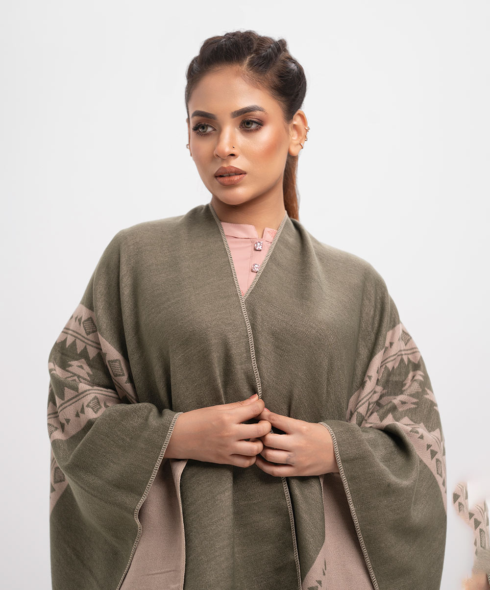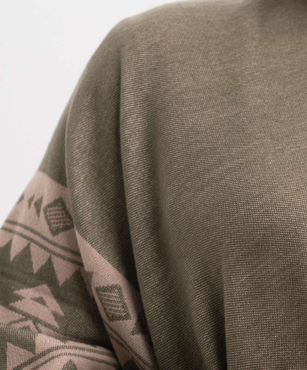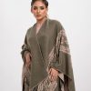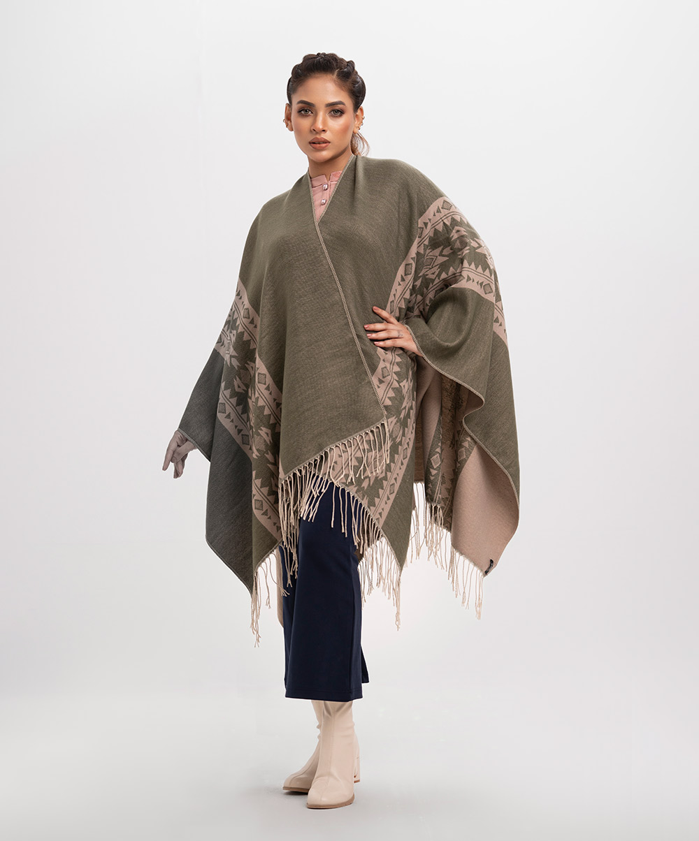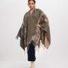 Women’s triangle-shaped winter poncho in woolen fabric. Comes with fringe trim at the border.