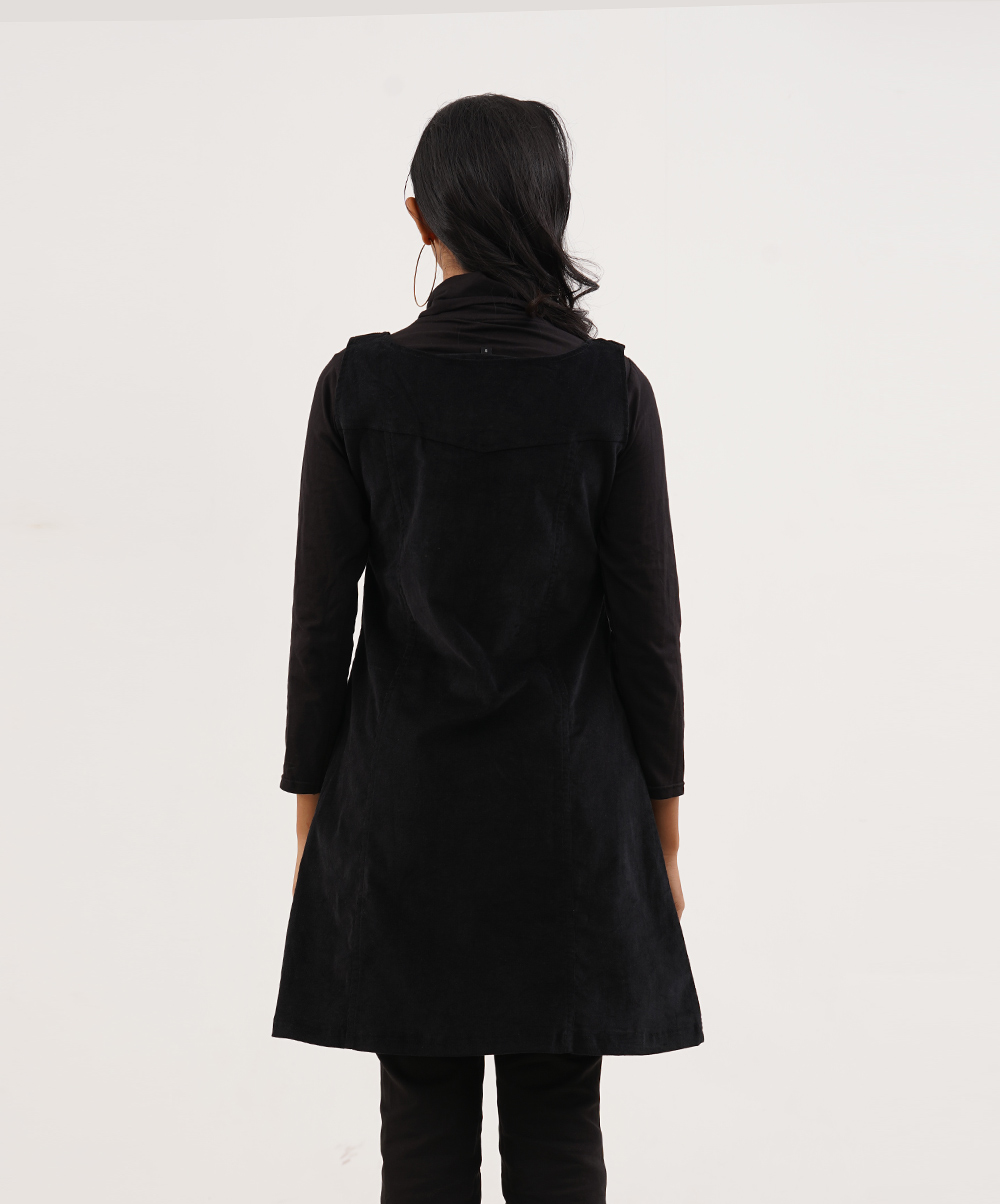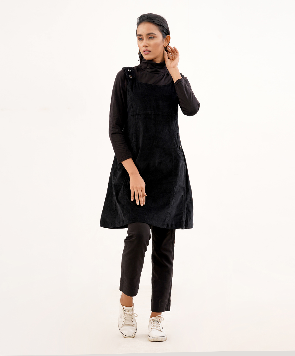 Solid black dungaree in corduroy fabric. It has cut and sew portions, front pockets and metal button.