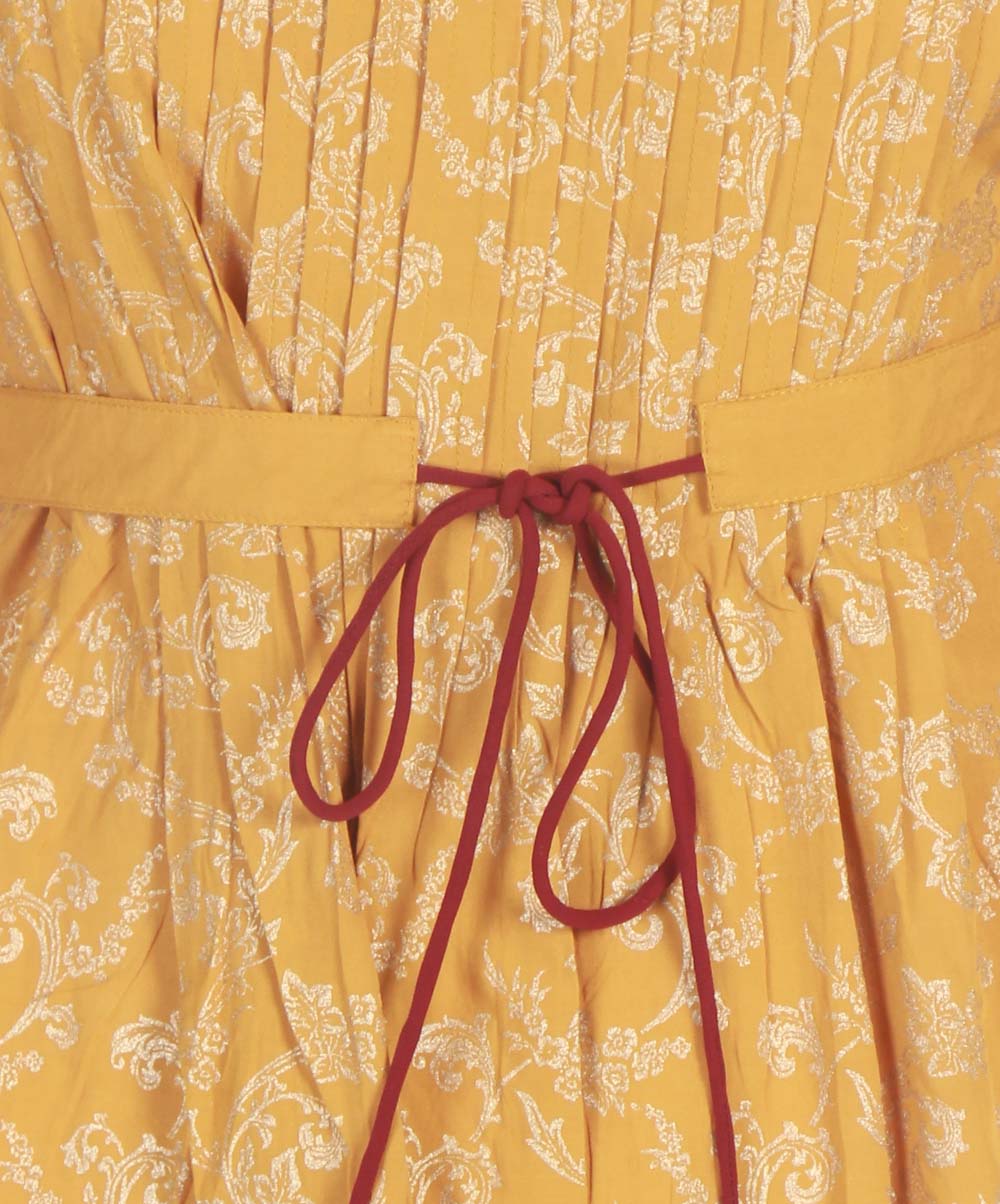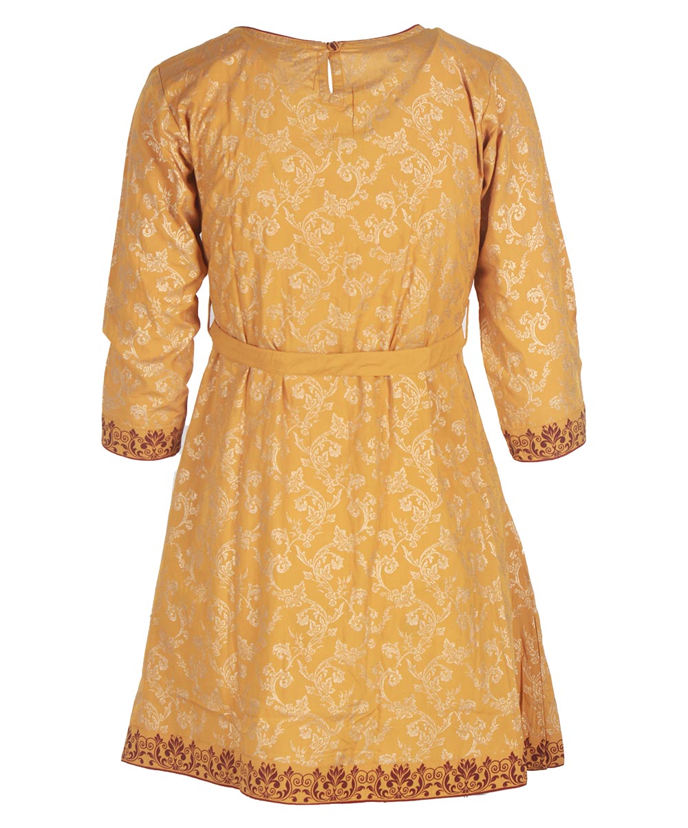 Gold color A-line printed viscose tunic with pleats in front. Embellished with a waist belt and printed patchwork on sleeves opening and hemline.
