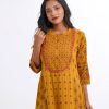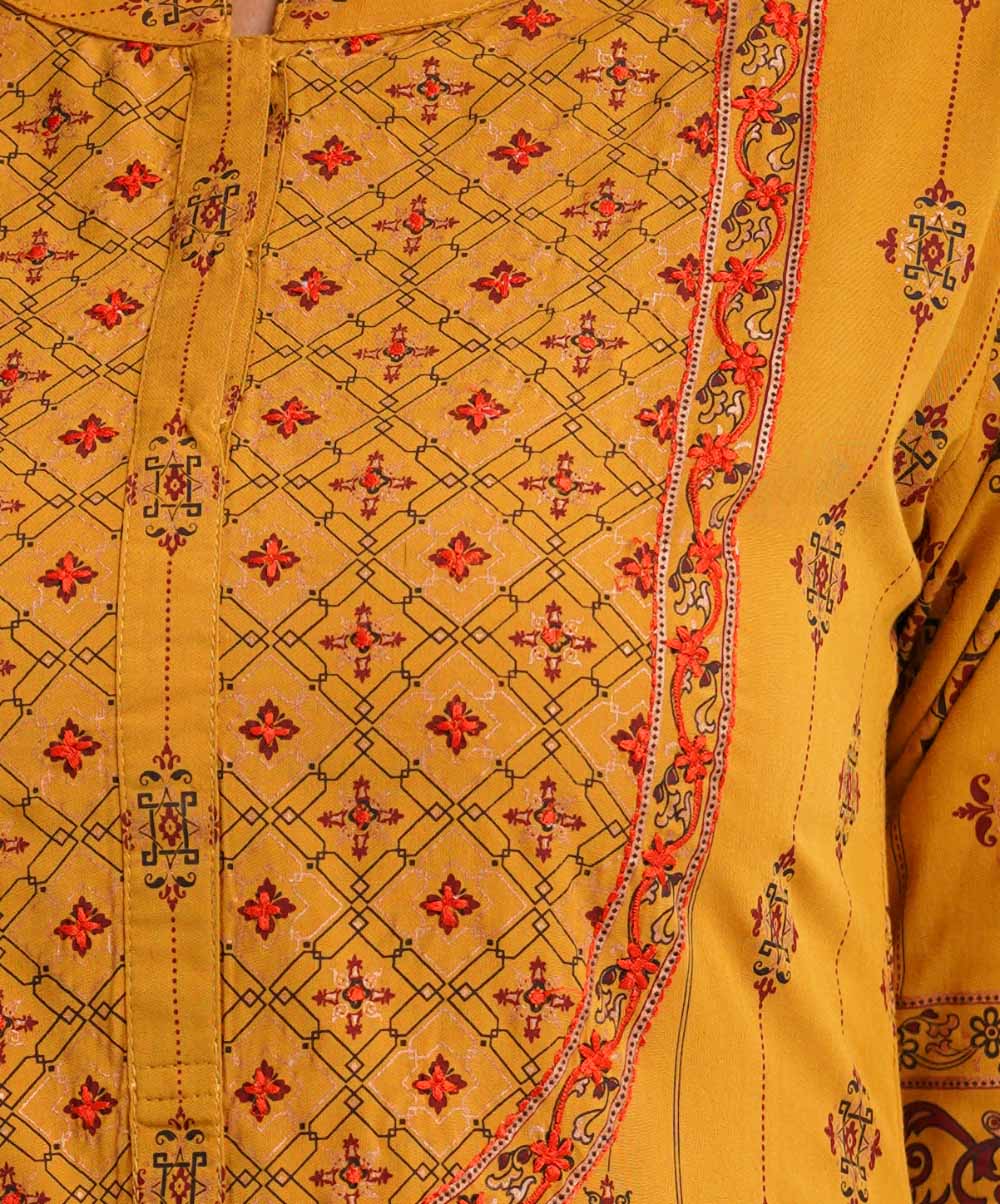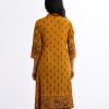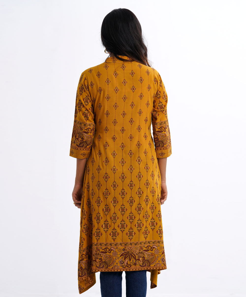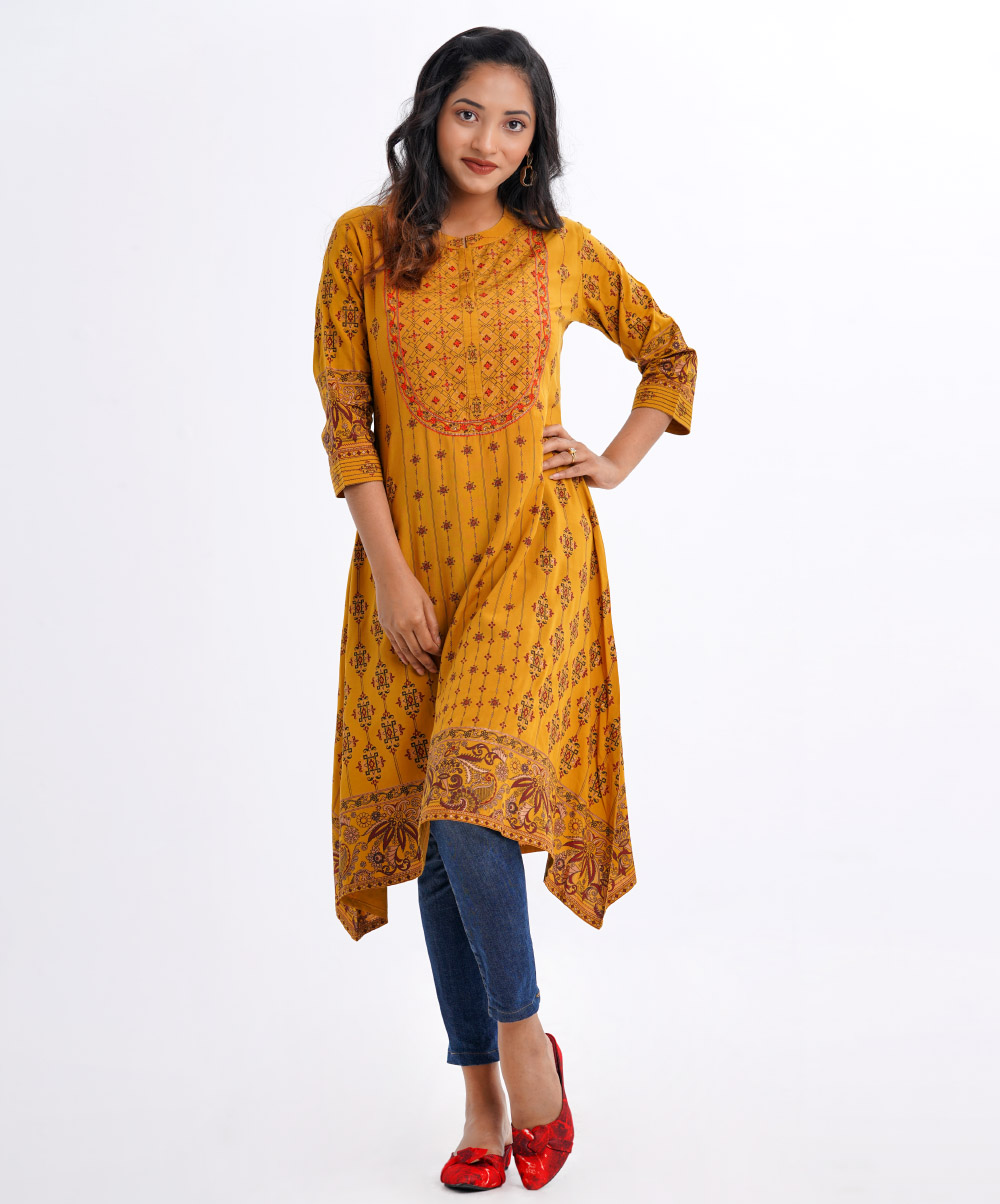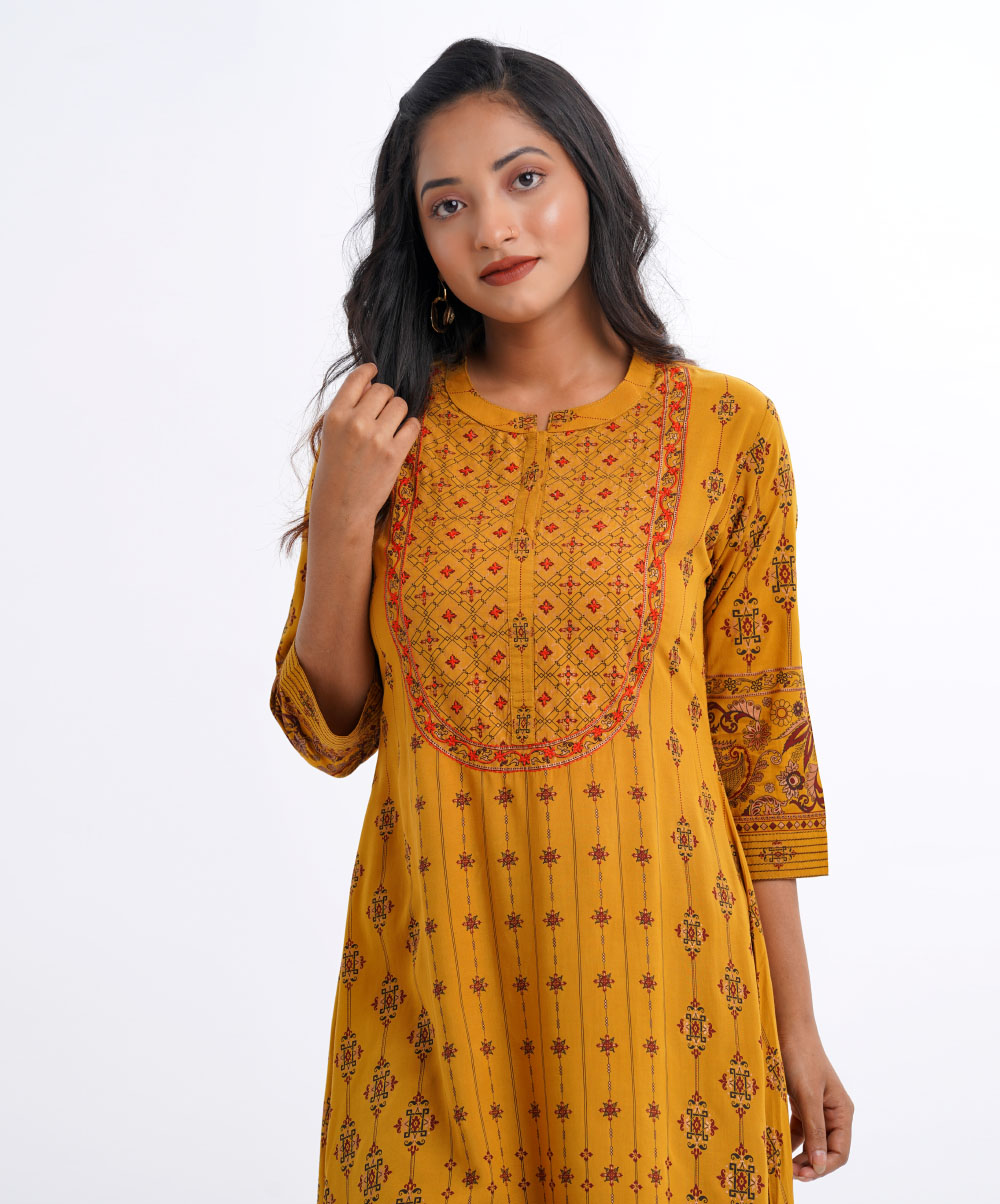 All-over printed Long length a-line Kameez with the embroidered yoke on the front part. Low mock neck with 3-quarter sleeves.