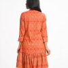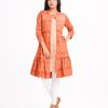 Orange & Brown shrug style Tunic in Viscose fabric. Designed with a band neck and roll-up three-quarter sleeves. Embellished with karchupi at the top front. Spliced gathered hemline.