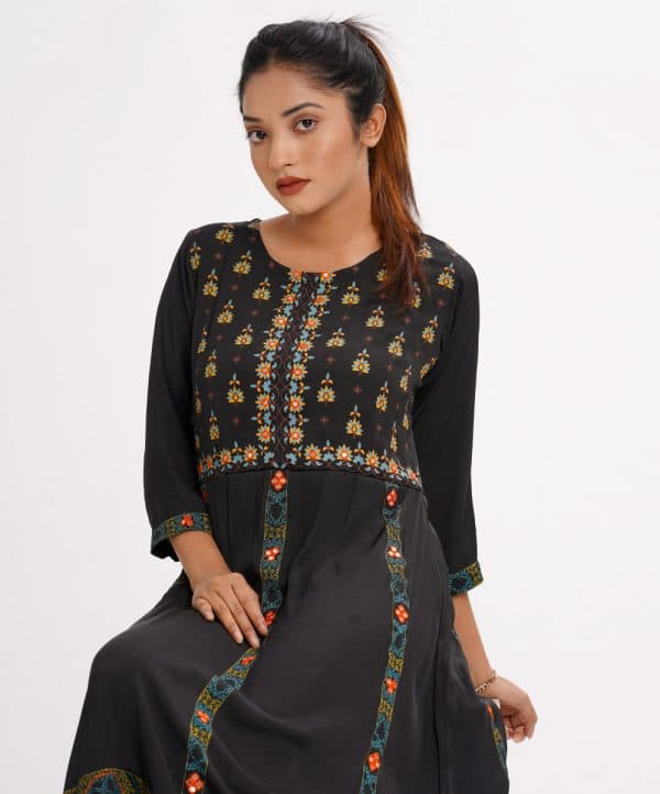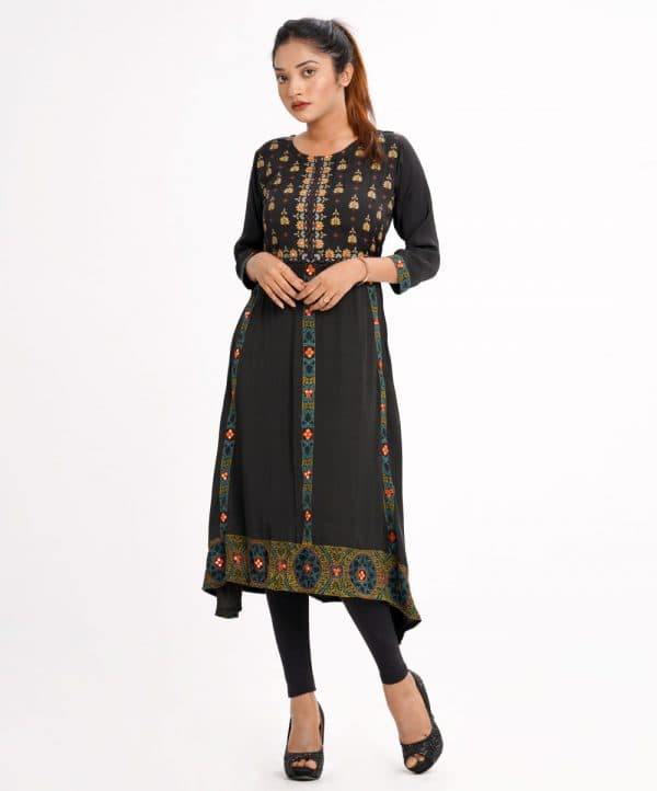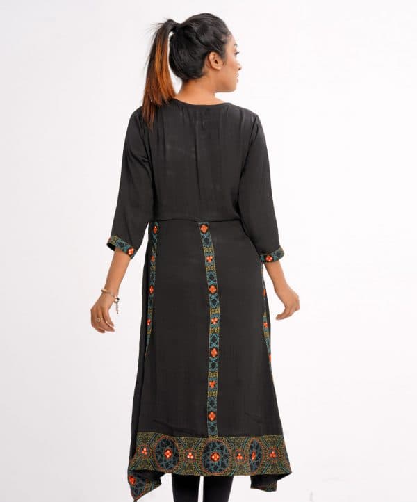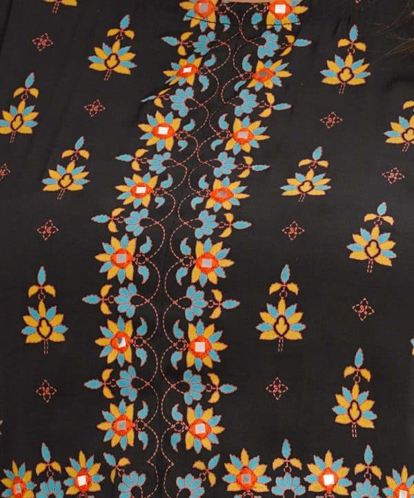 Black all-over printed A-line Tunic in Georgette fabric. Designed with a round neck and three-quarter sleeves. Embellished with embroidery at the front and back. Elongated hemline. Single button opening at the back. Unlined.