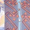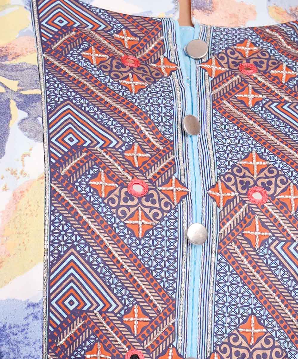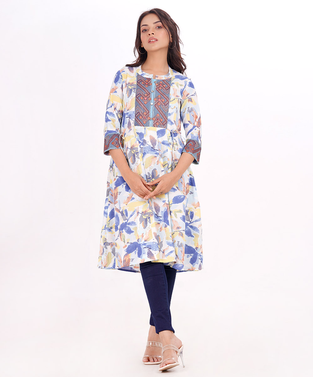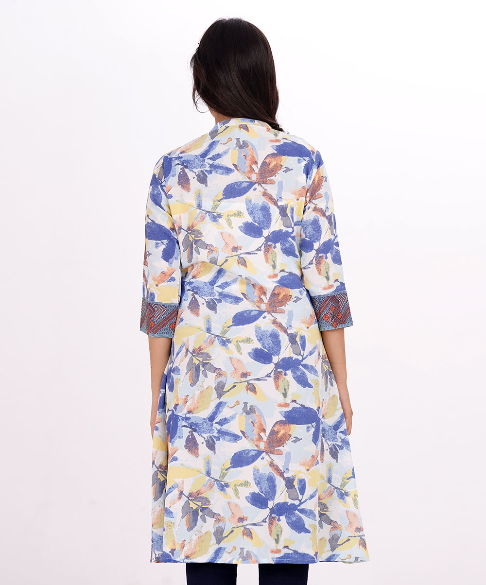 White pattern A-line Tunic in printed Georgette fabric. Features a band collar with hook closure at the front and three-quarter sleeves. Embellished with fancy buttons and karchupi at the top front. Printed patch attachment at the cuffs. Unlined.