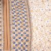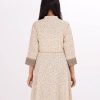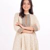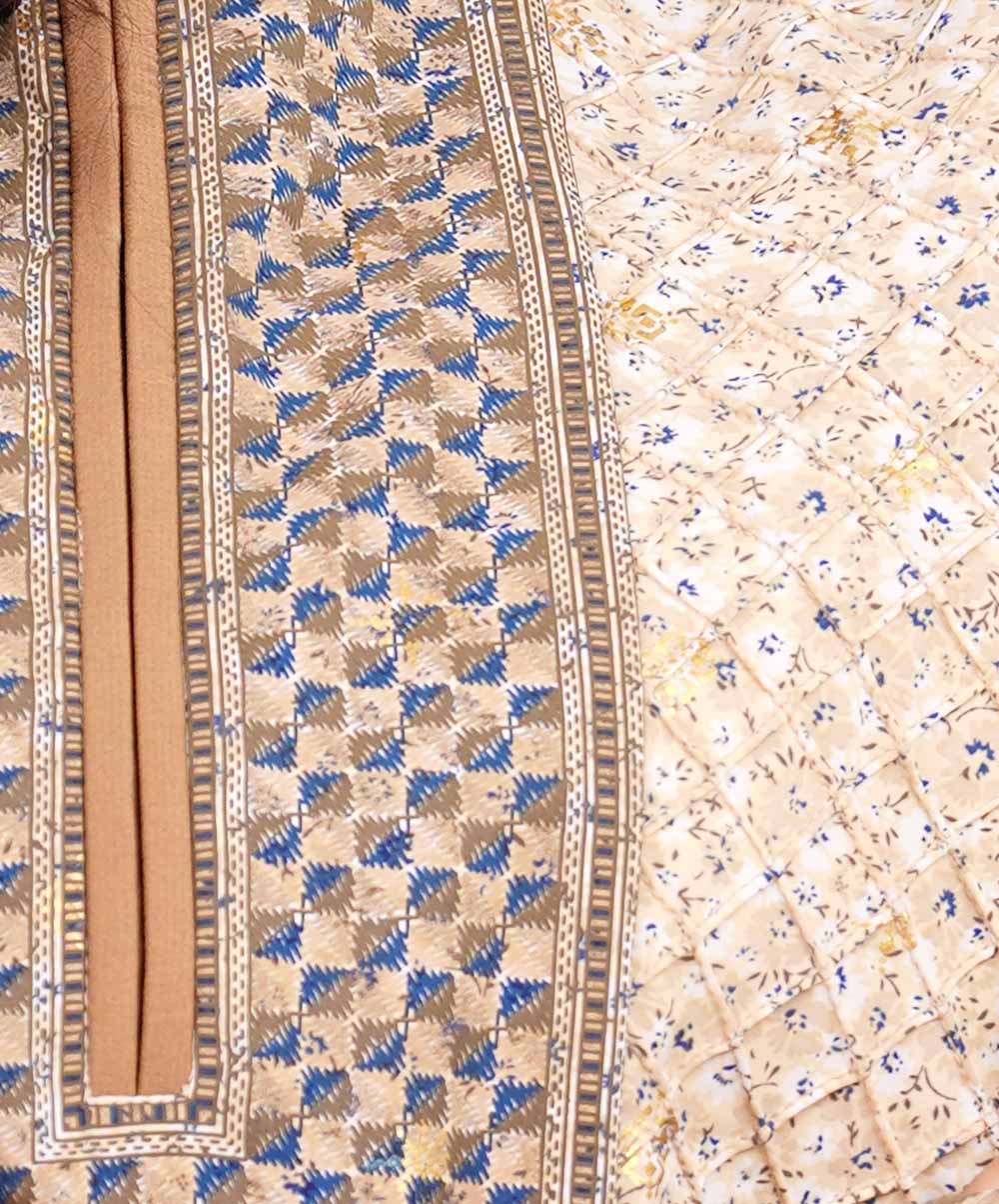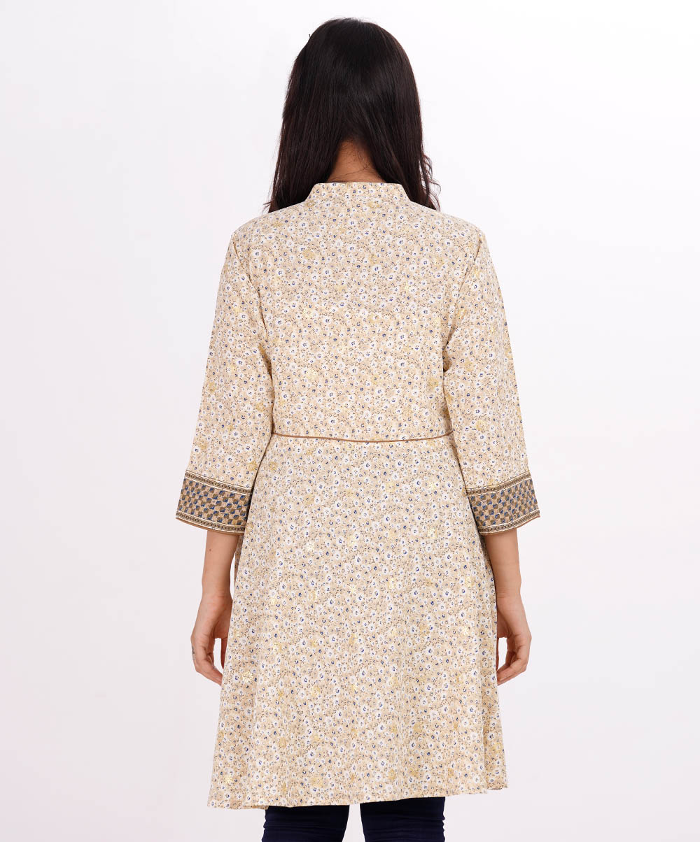 Ivory A-line Tunic in printed Georgette fabric. Features a mandarin neck with hook closure at the front and three-quarter sleeves. Embellished with diamond shaped pin tuck stitches at the top front. Patch attachment at the front, cuffs and hemline. Unlined.