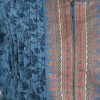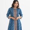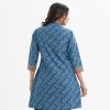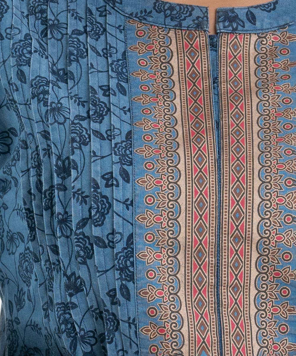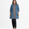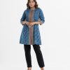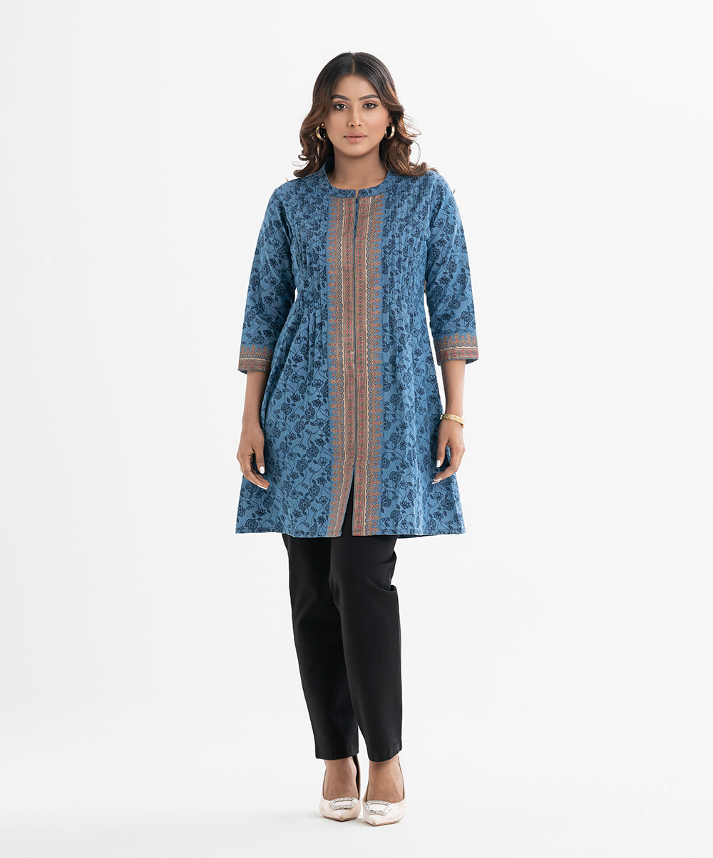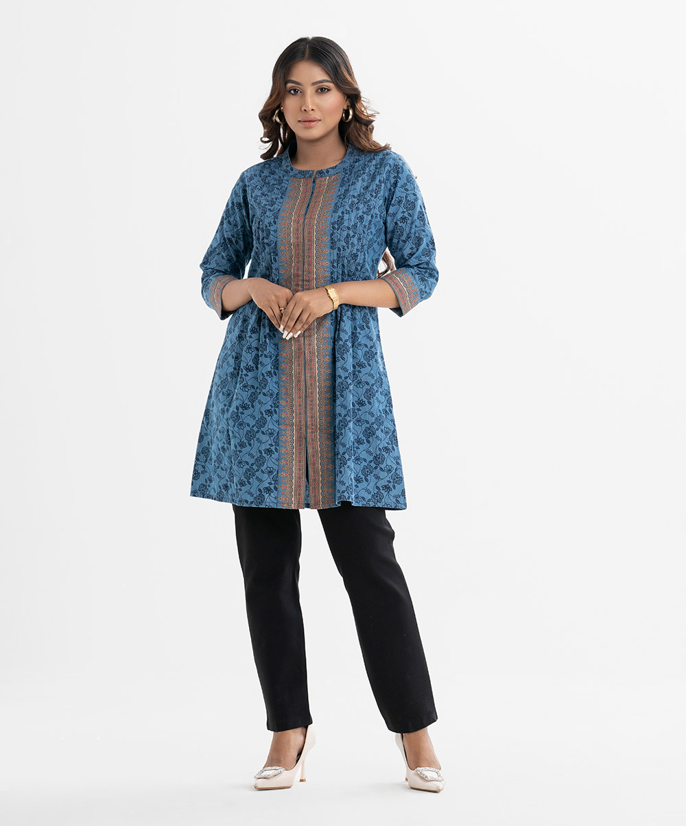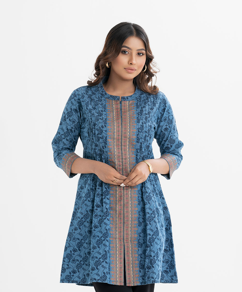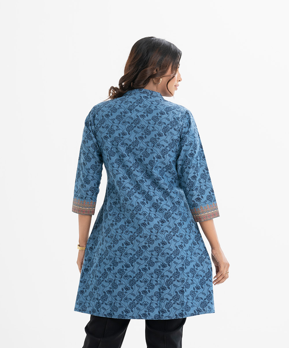 Women’s floral printed A-line tunic in denim fabric. Stand collar, three-quarter sleeves. Patch and pin tuck at front.