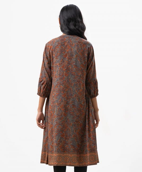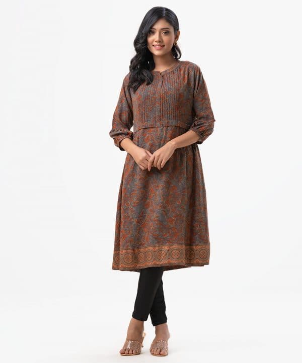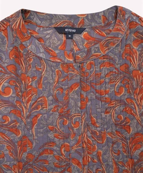 Women’s A-line tunic in printed georgette fabric. Band collar, three quarter sleeves and pintuck at the front.