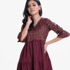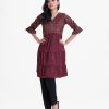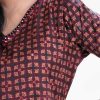 Geometric printed flared style tunic in blended fabric. V-neck, lantern sleeves, gathered waistline. Embroidery at front.