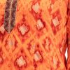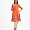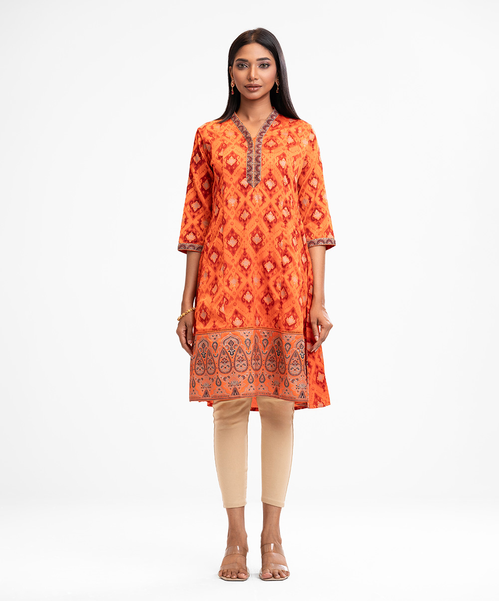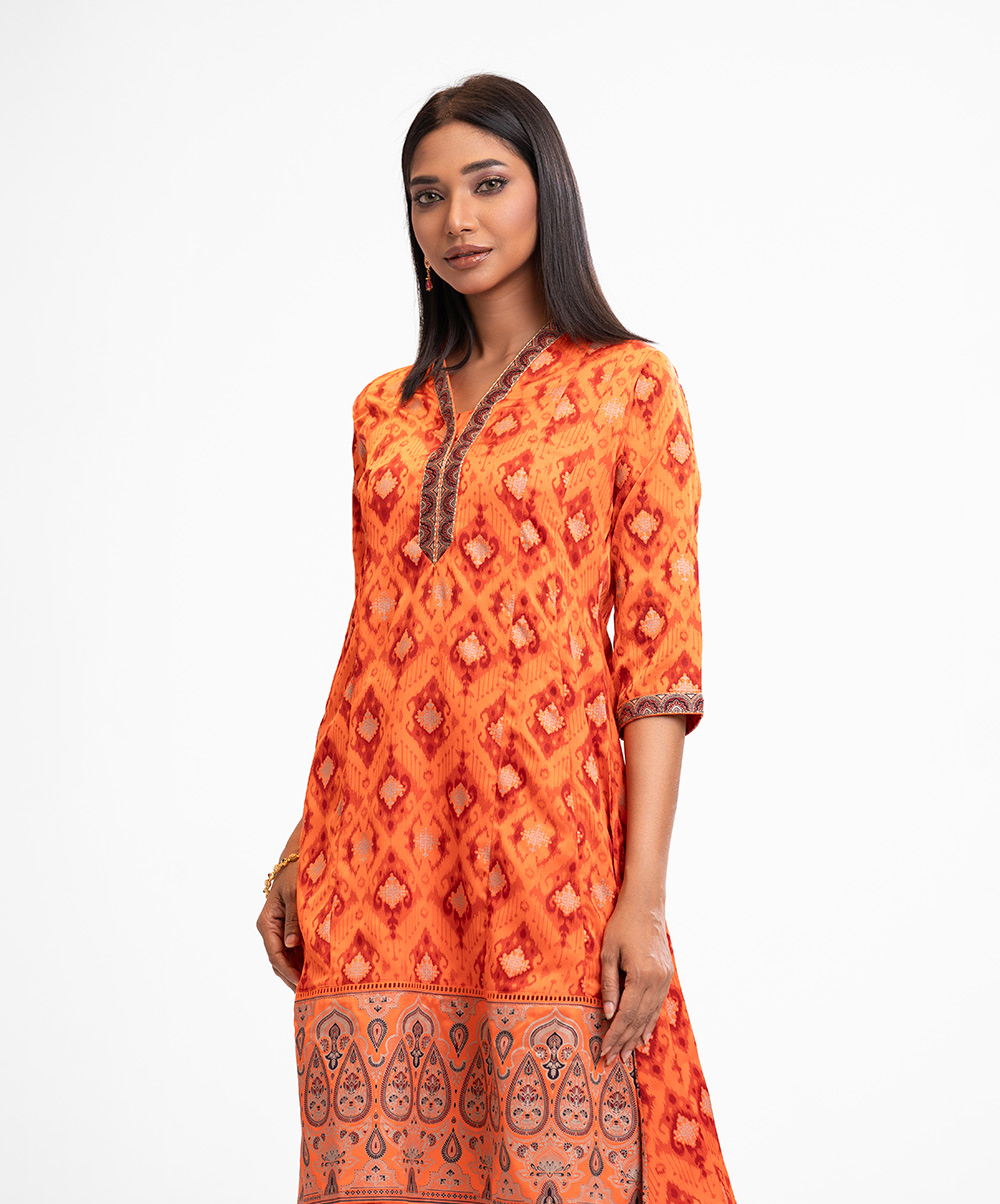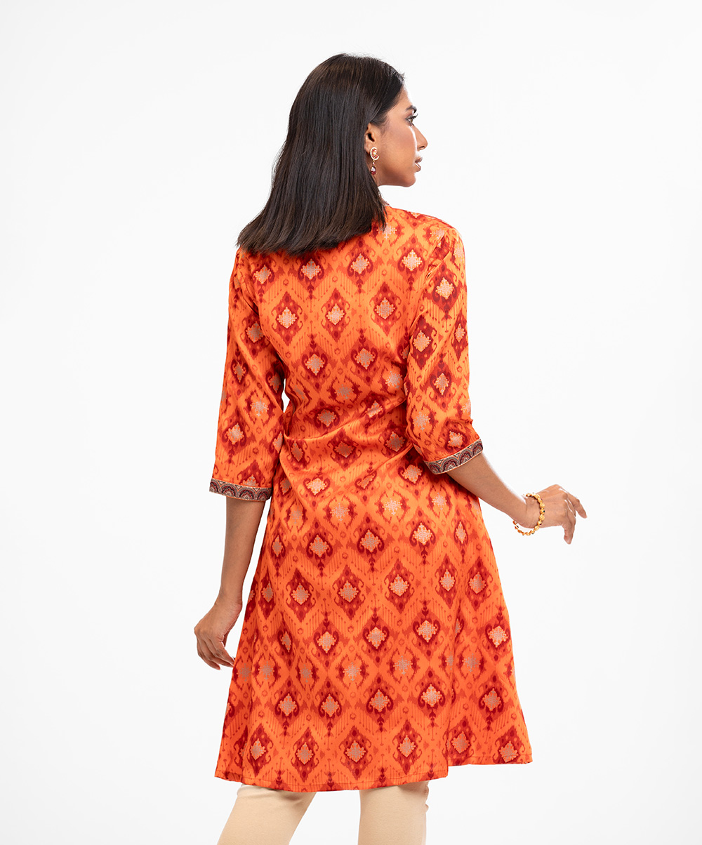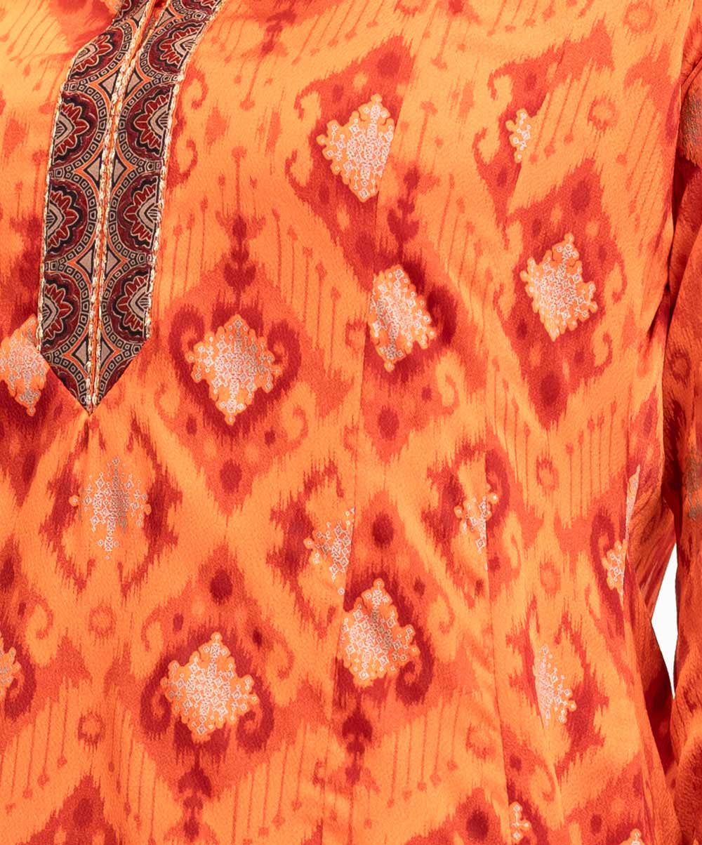 Printed A-line tunic in crepe fabric. V-neck with patched attached and three-quarter sleeved.