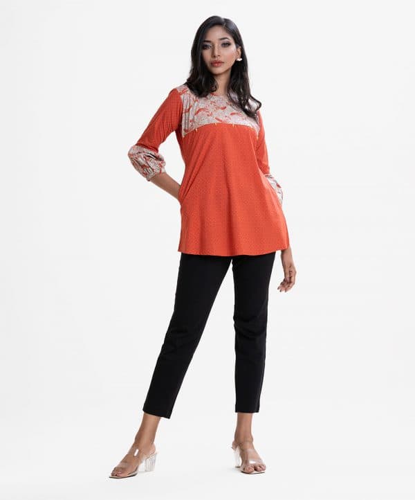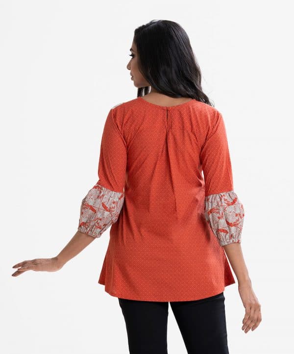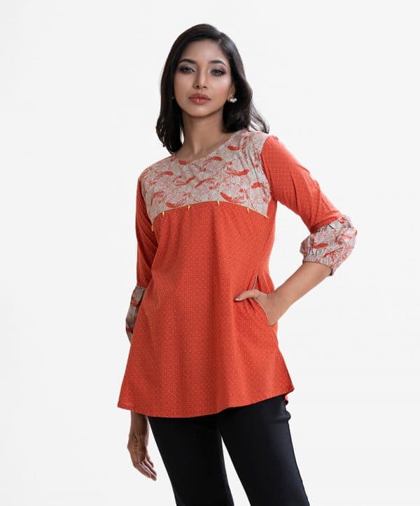 Women’s printed A-line tunic in viscose fabric. Round neck, three quarter sleeves. Embroidery at the front.