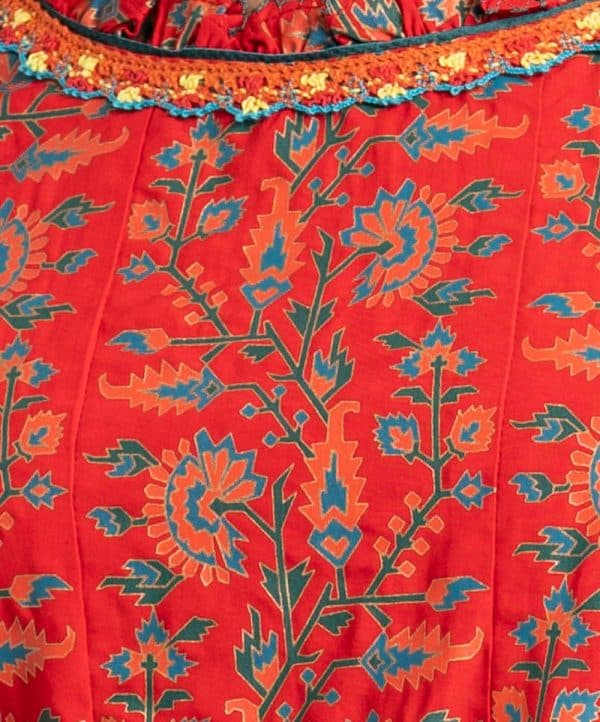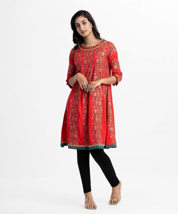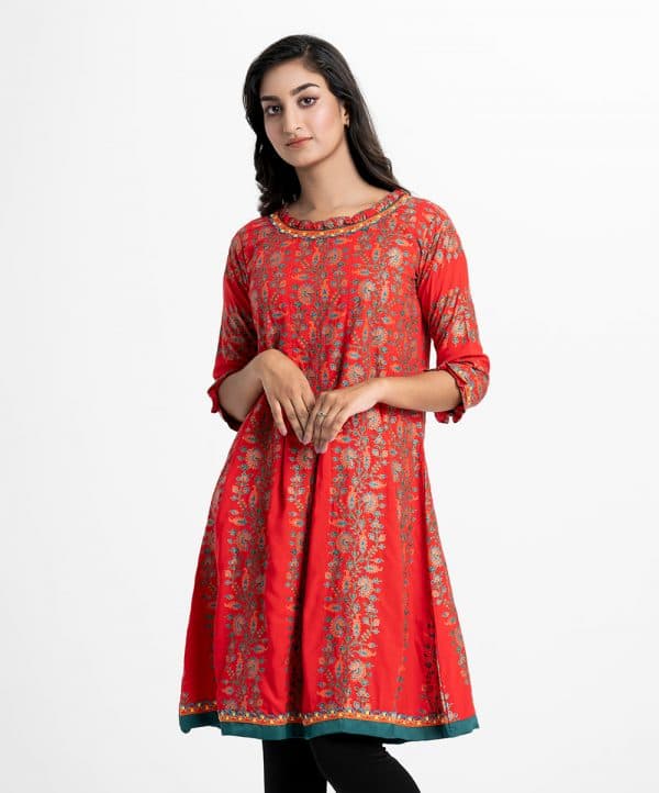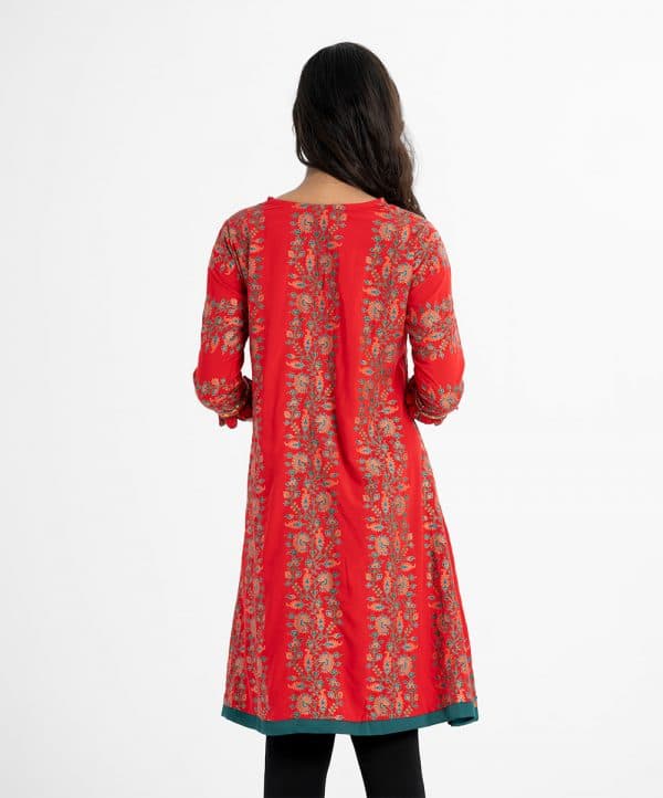 Printed A-line tunic in viscose fabric. Frill trim and lace work at the round neck and three-quarter sleeves.