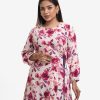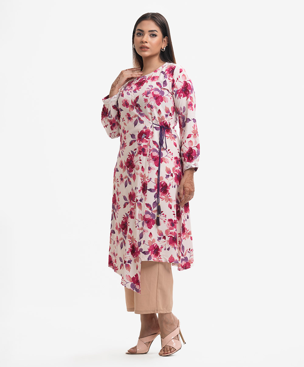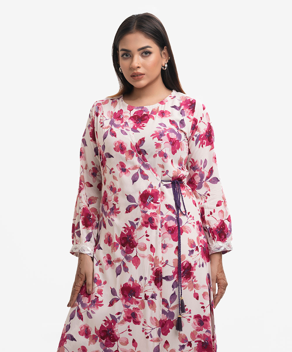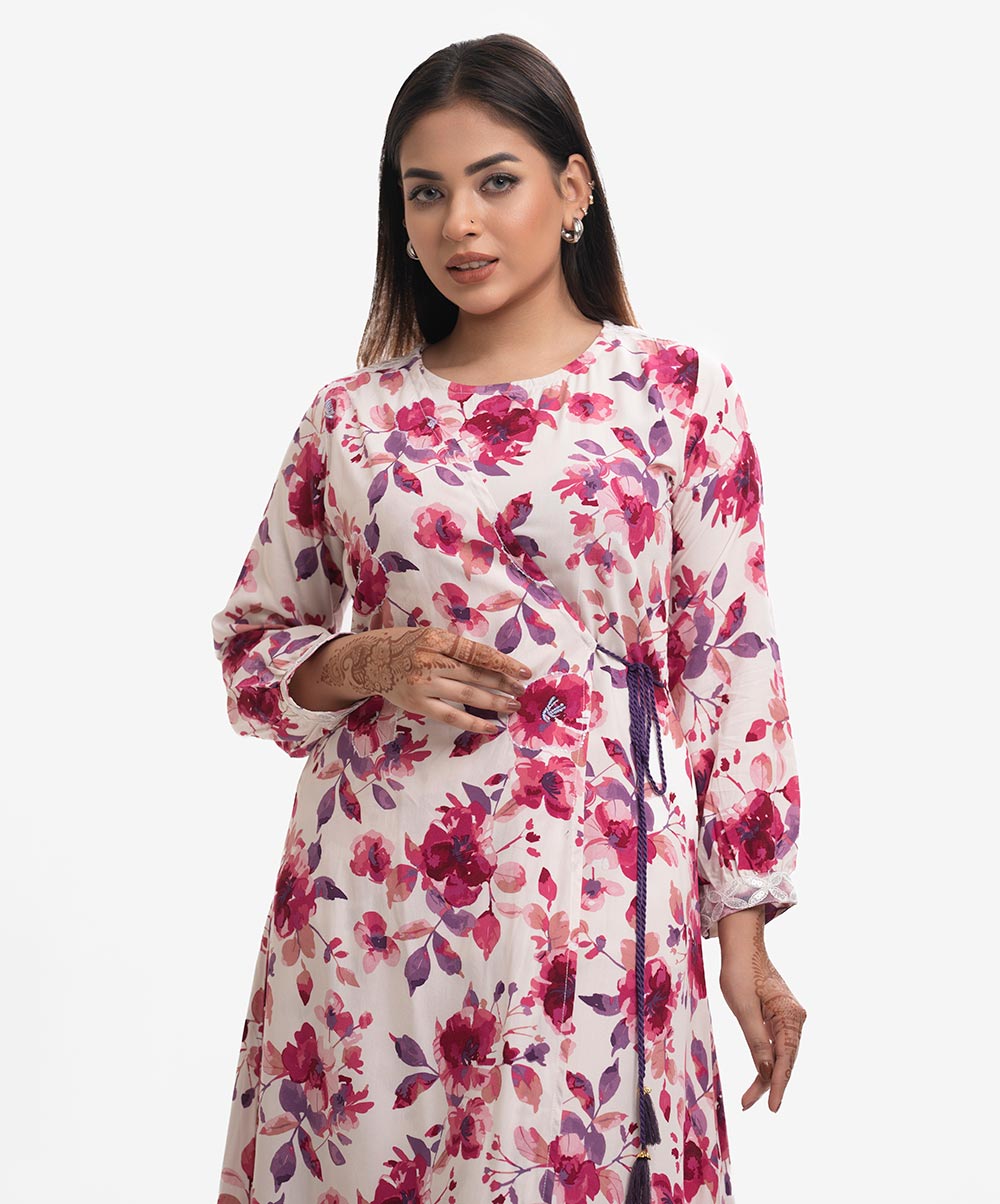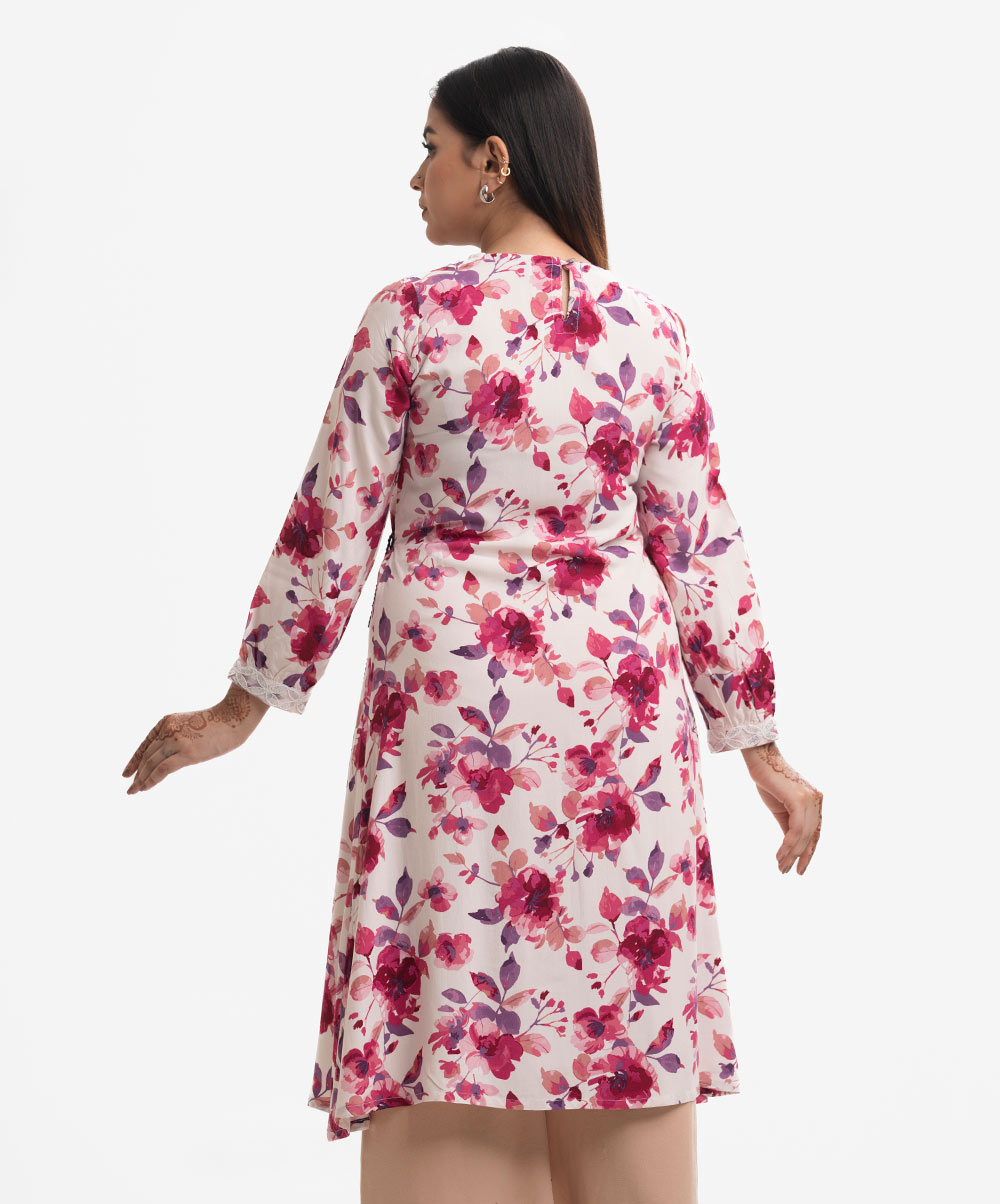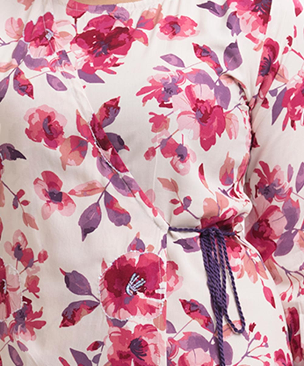 Round neck, retro-wrap style tunic in viscose fabric. Full bishop sleeves, sequin and lace details.