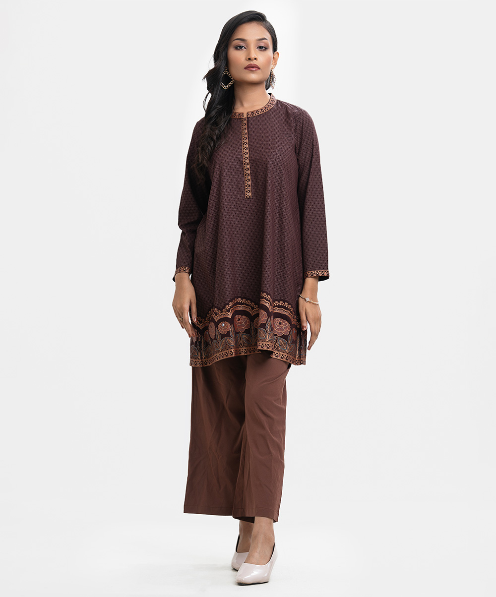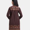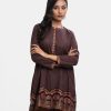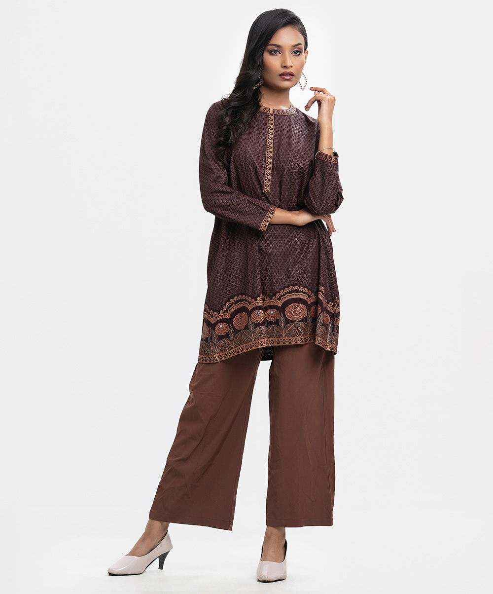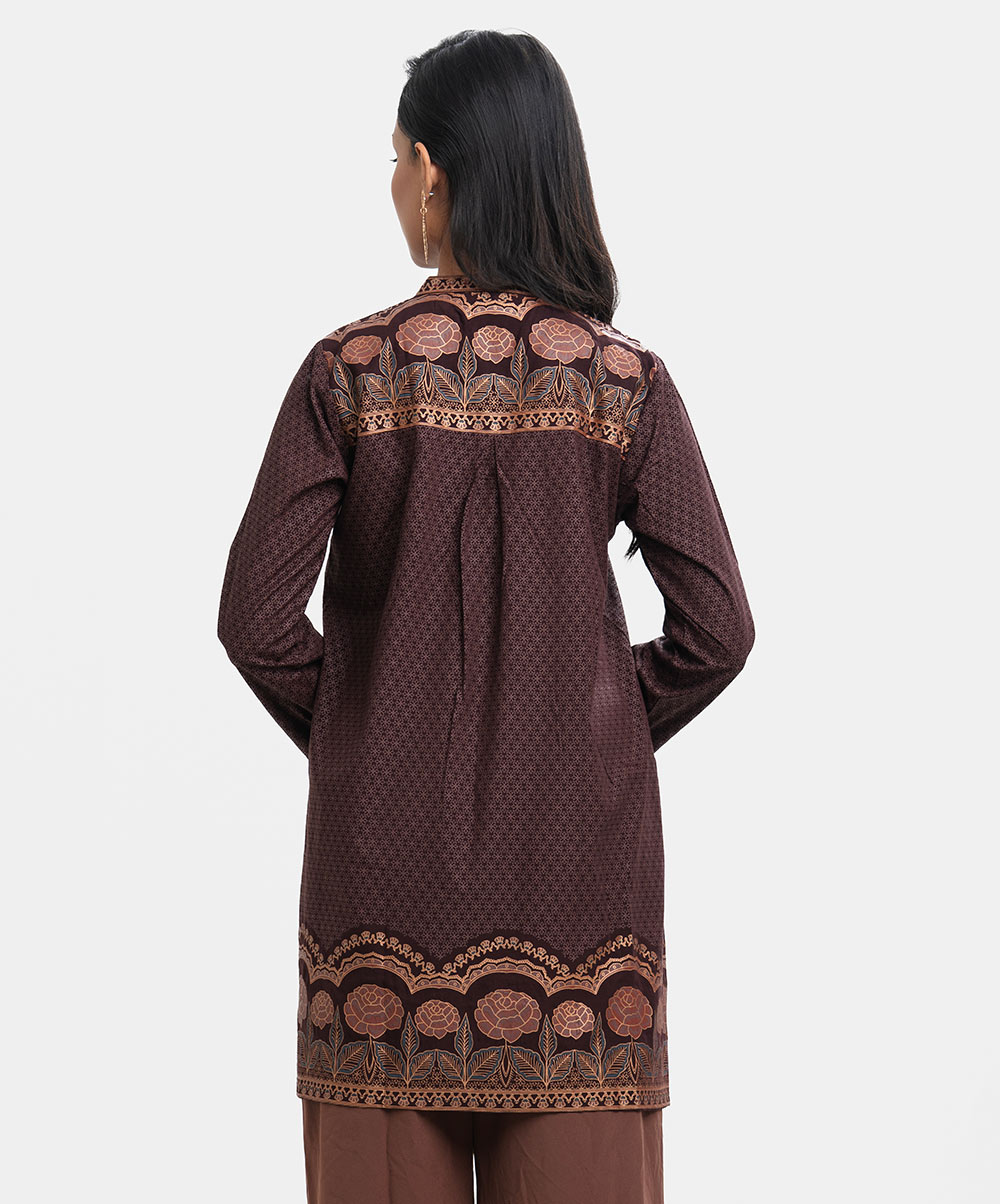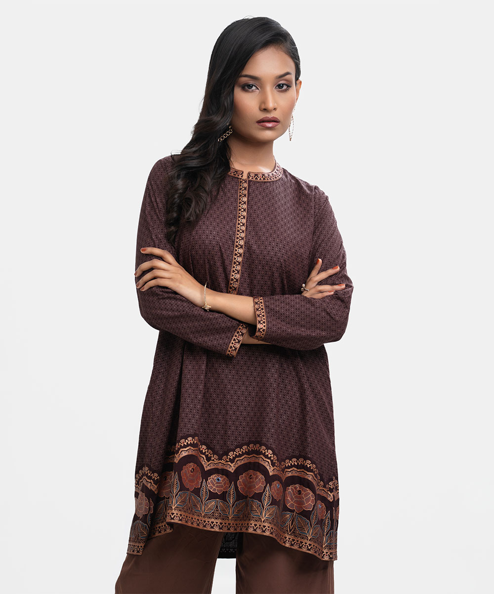 Women’s printed A-line tunic in viscose fabric. Full sleeves, stand collar. Karchupi at collar, sleeves & hemline.
