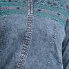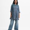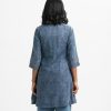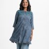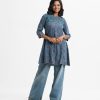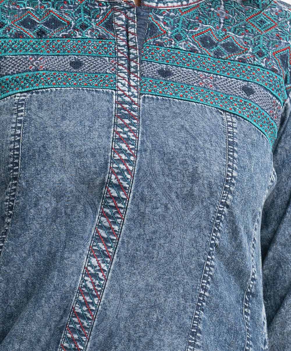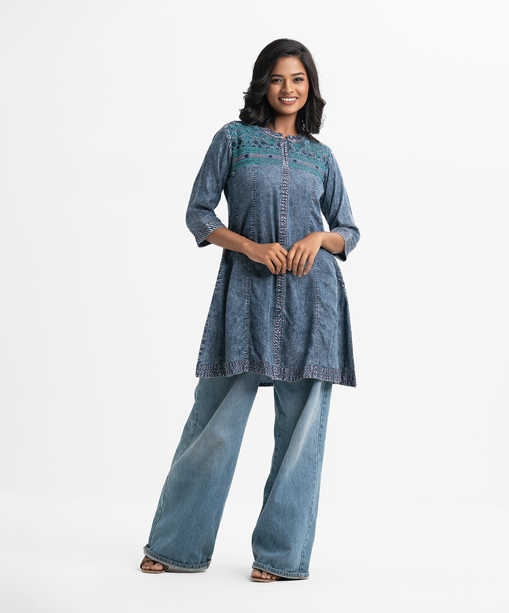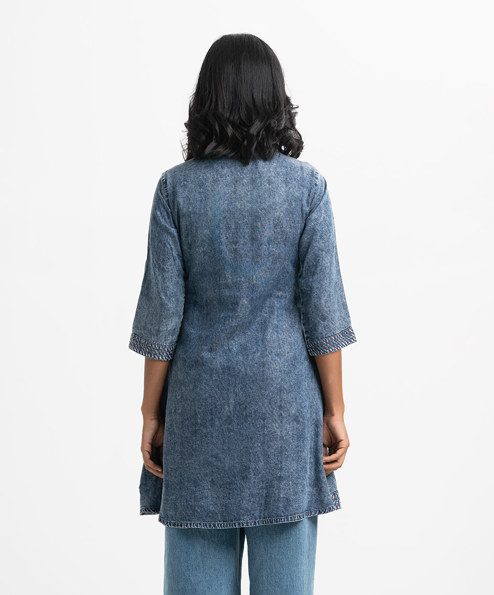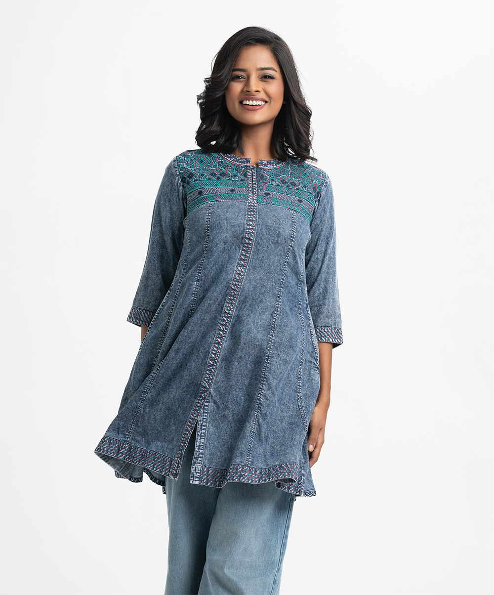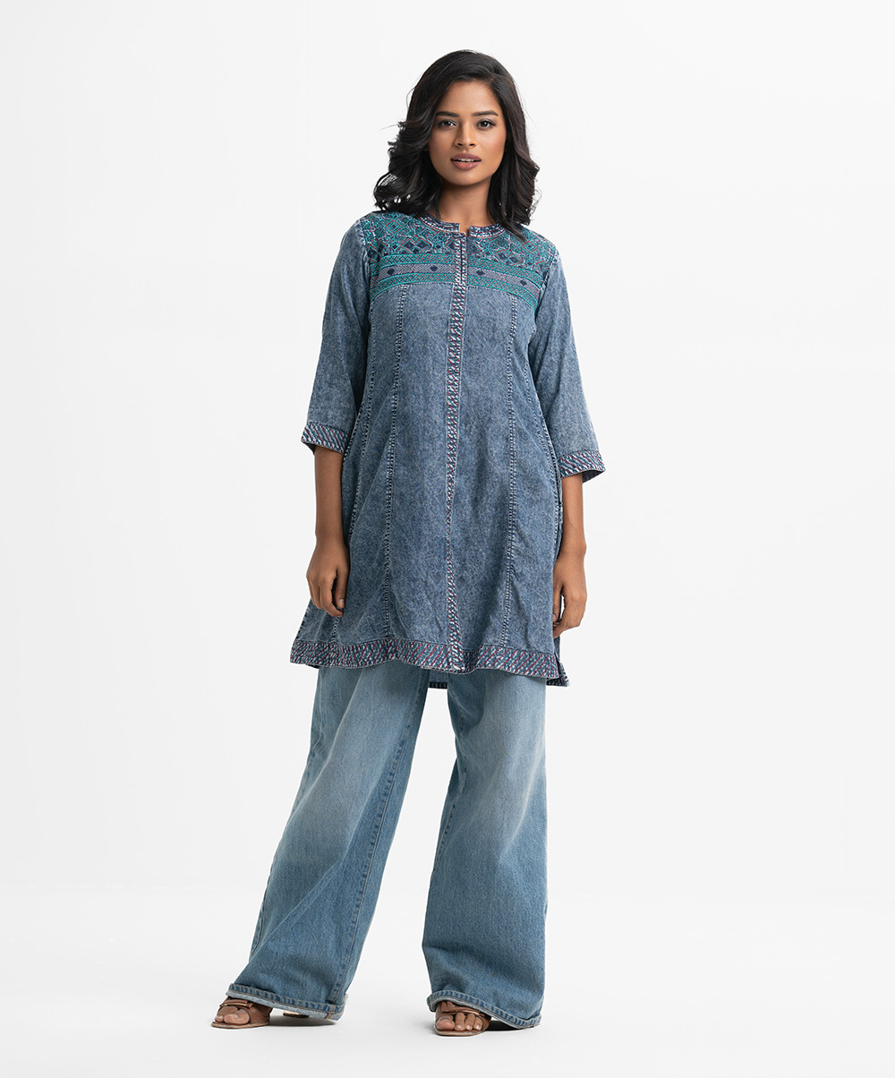 Woman’s printed A-line tunic in denim fabric. Three-quarter sleeves, stand collar. Embroidery at the front and inseam side pockets.