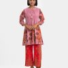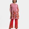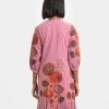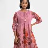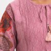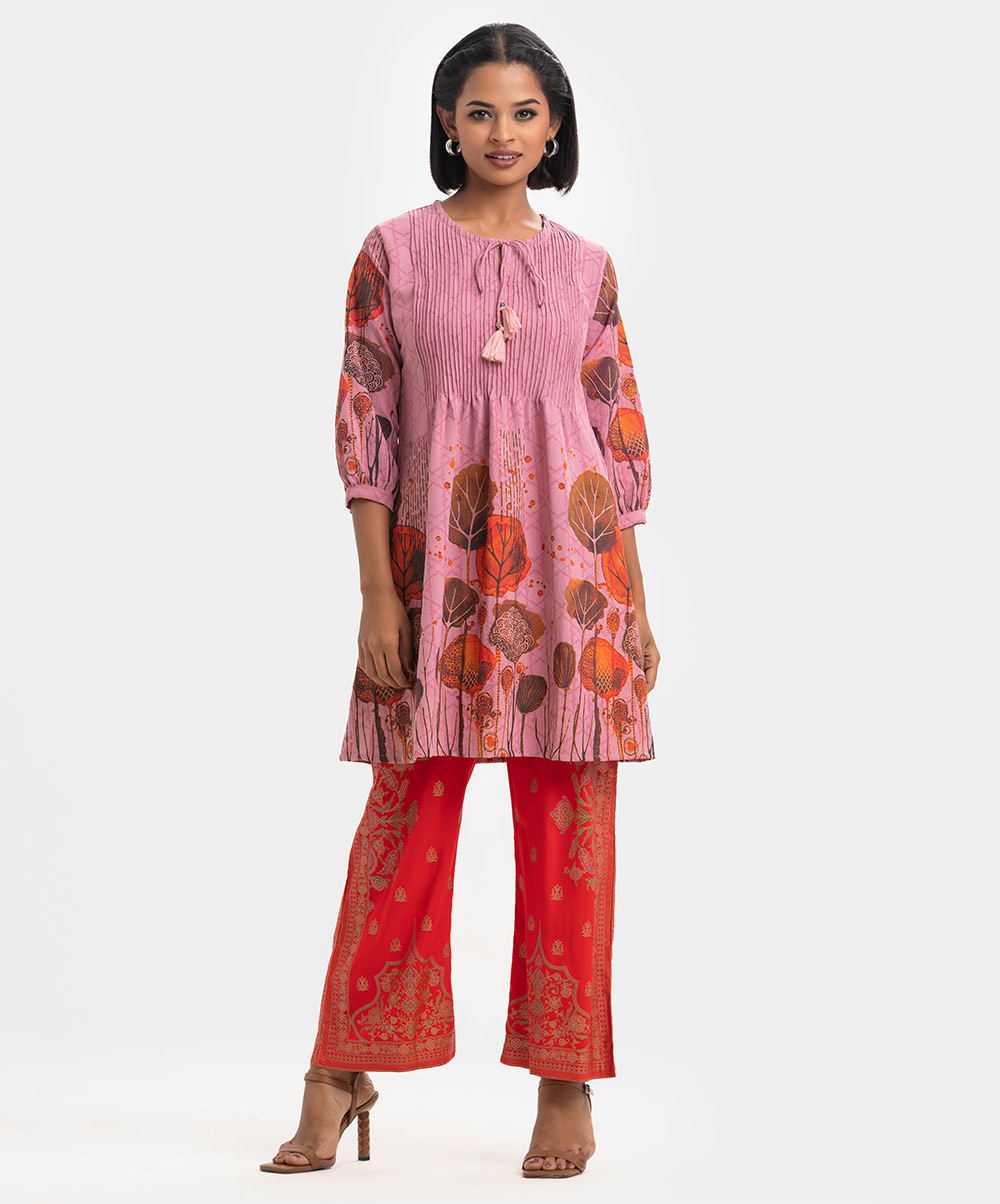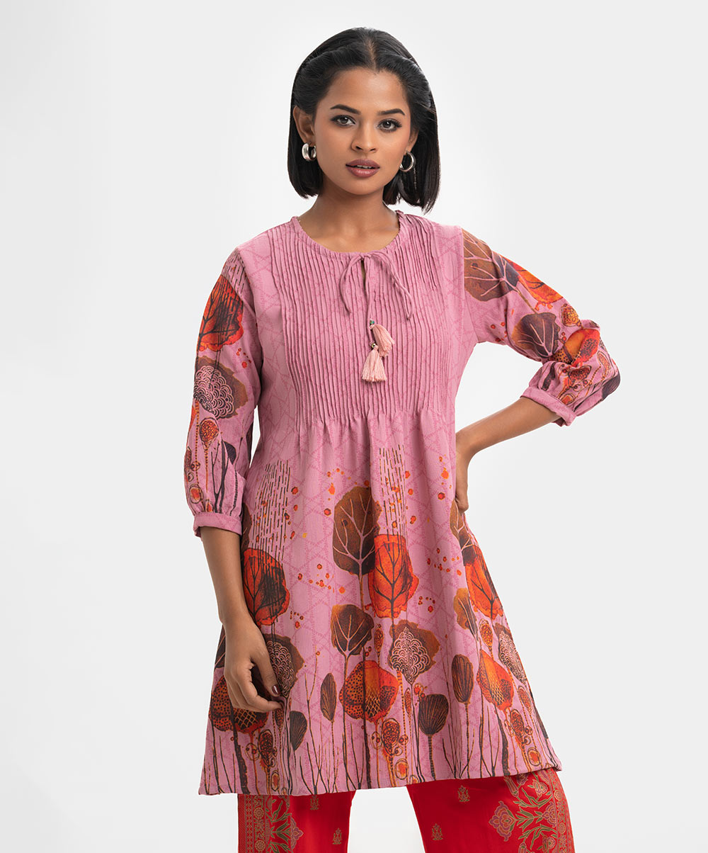 Women’s printed A-line tunic in stretchable georgette fabric. Round neck with slit attached tassel tie, bishop sleeves. Pintuck detail at front.