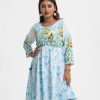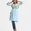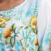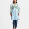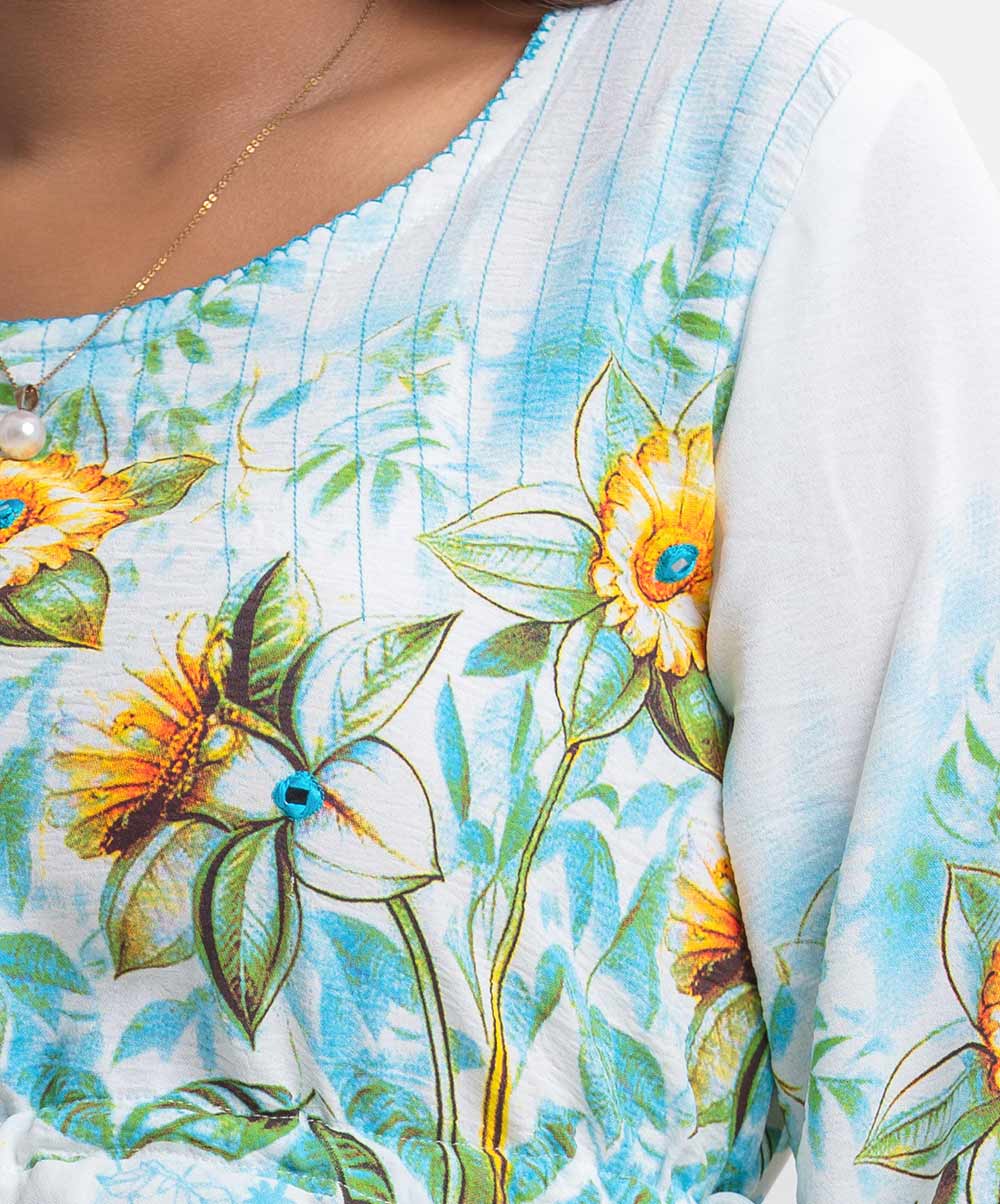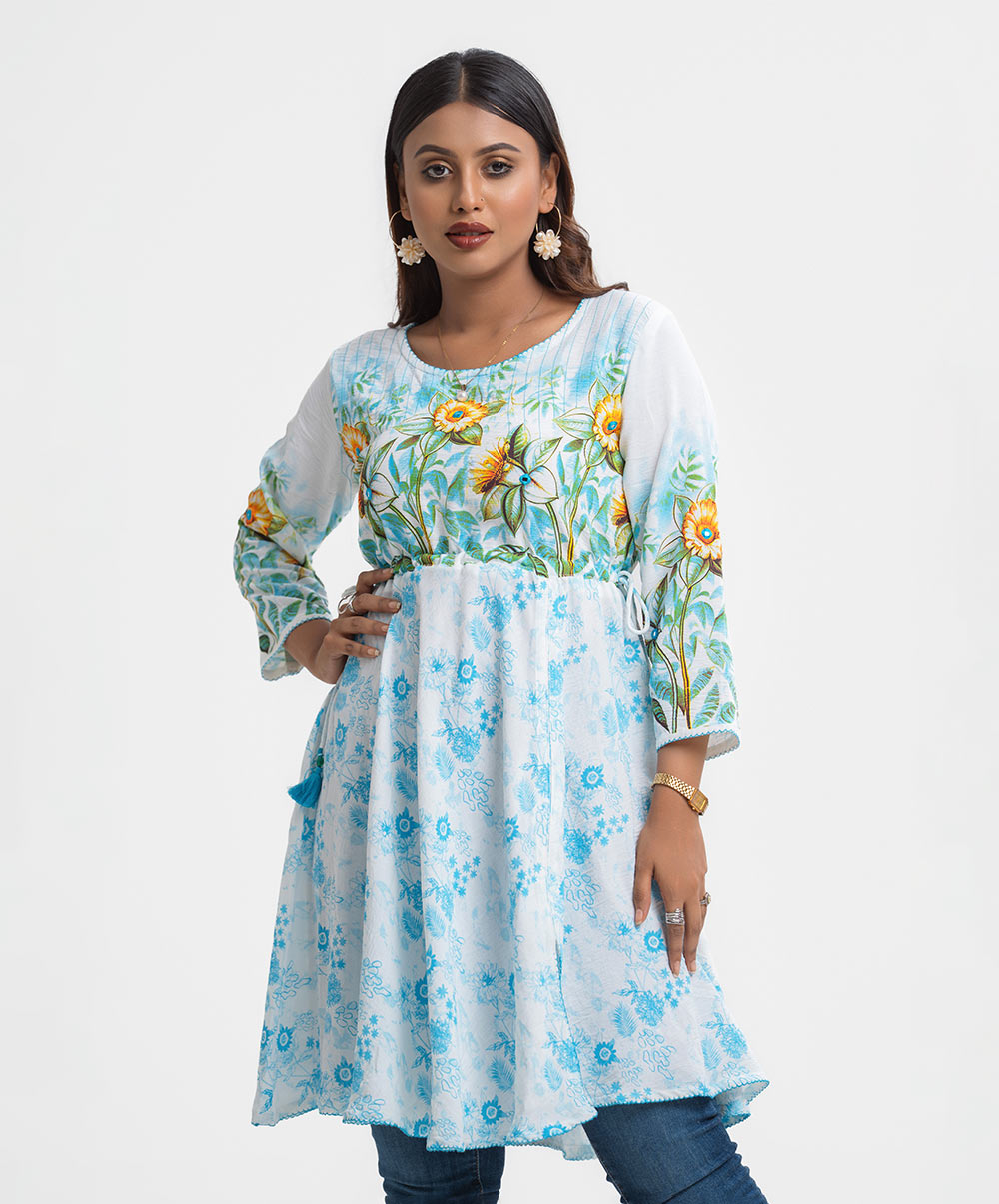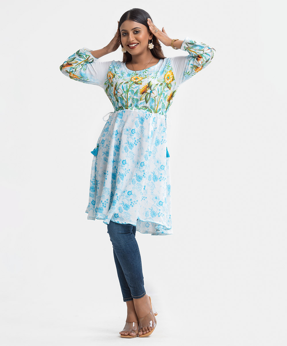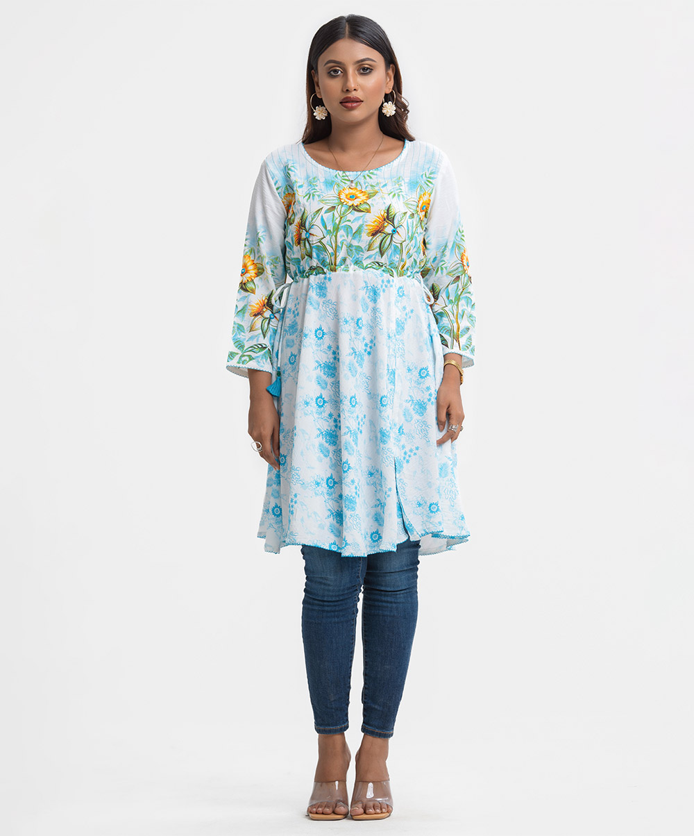 Woman’s floral printed A-line tunic in stretchable georgette fabric. Three-quarter sleeves, boat neck. Line stitching and karchupi at front. Tassel tie on the waistline.