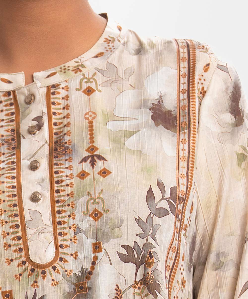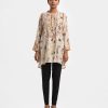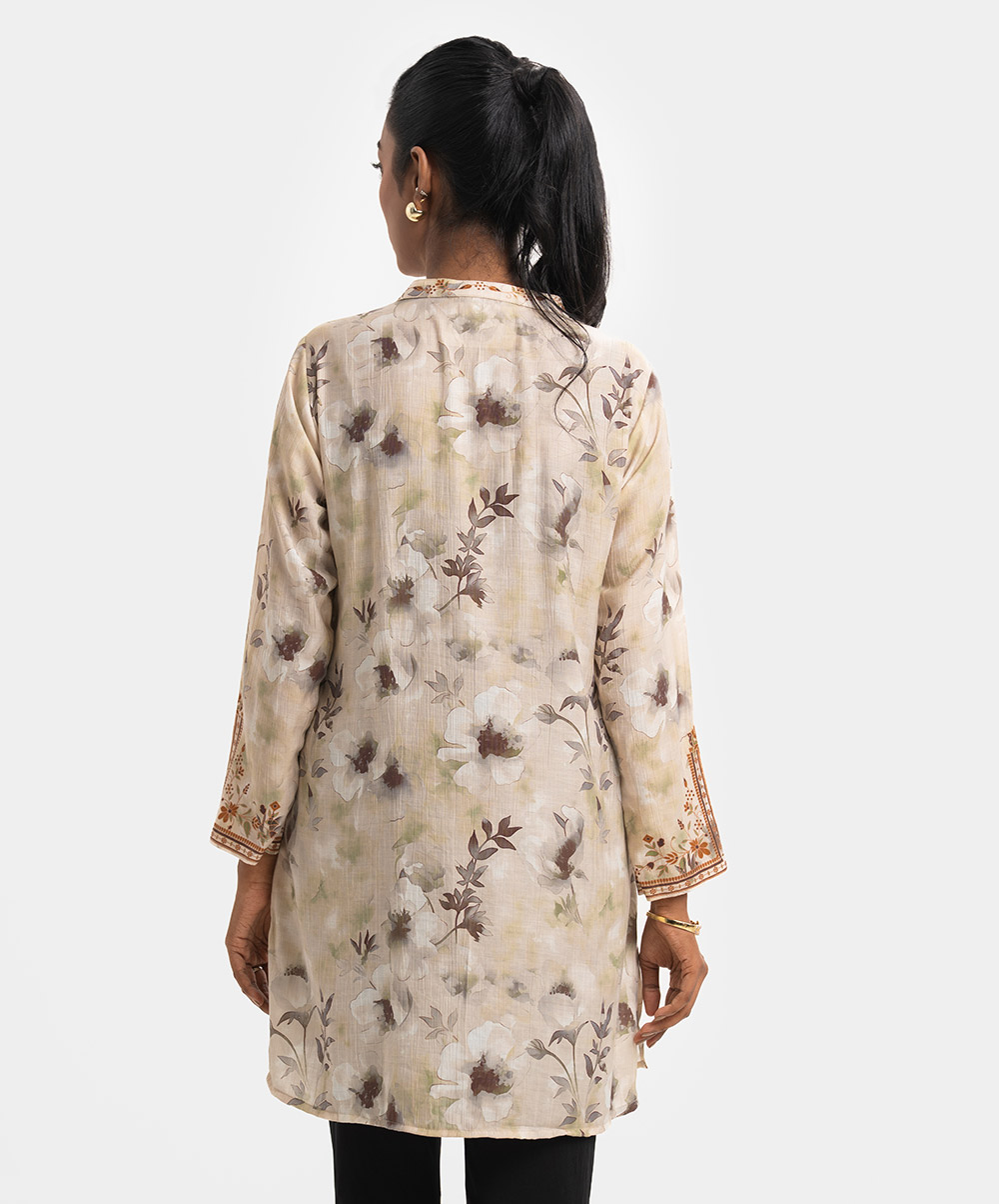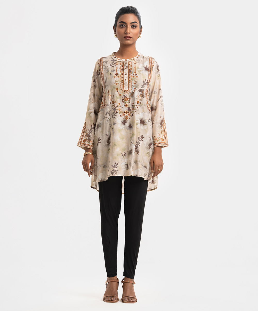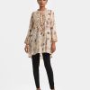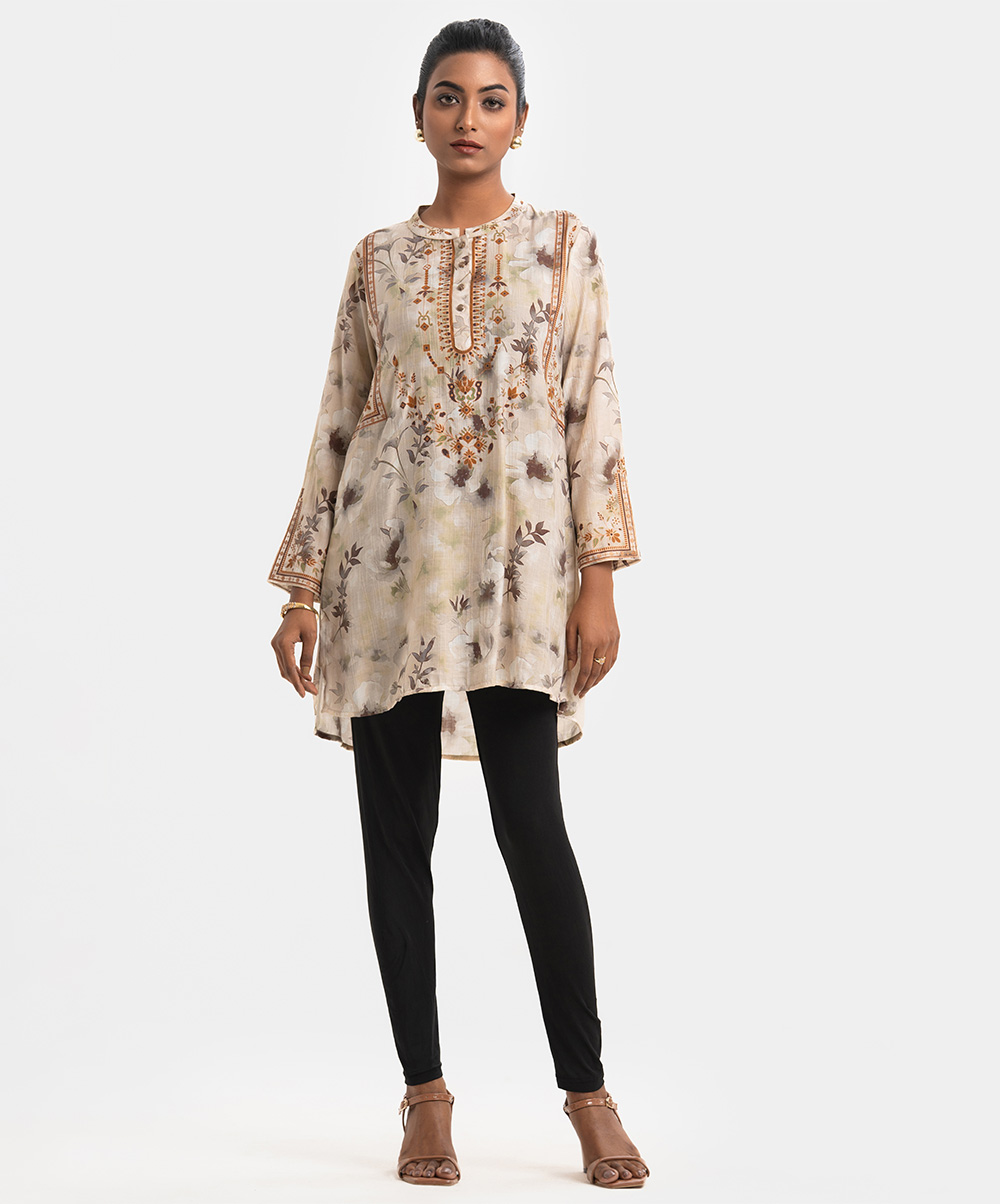 Women’s A-line tunic in printed cotton-blended fabric. Full sleeves and stand collar with buttons placket.