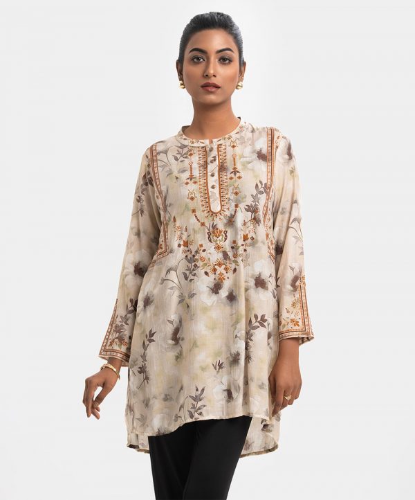 Women’s A-line tunic in printed cotton-blended fabric. Full sleeves and stand collar with buttons placket.